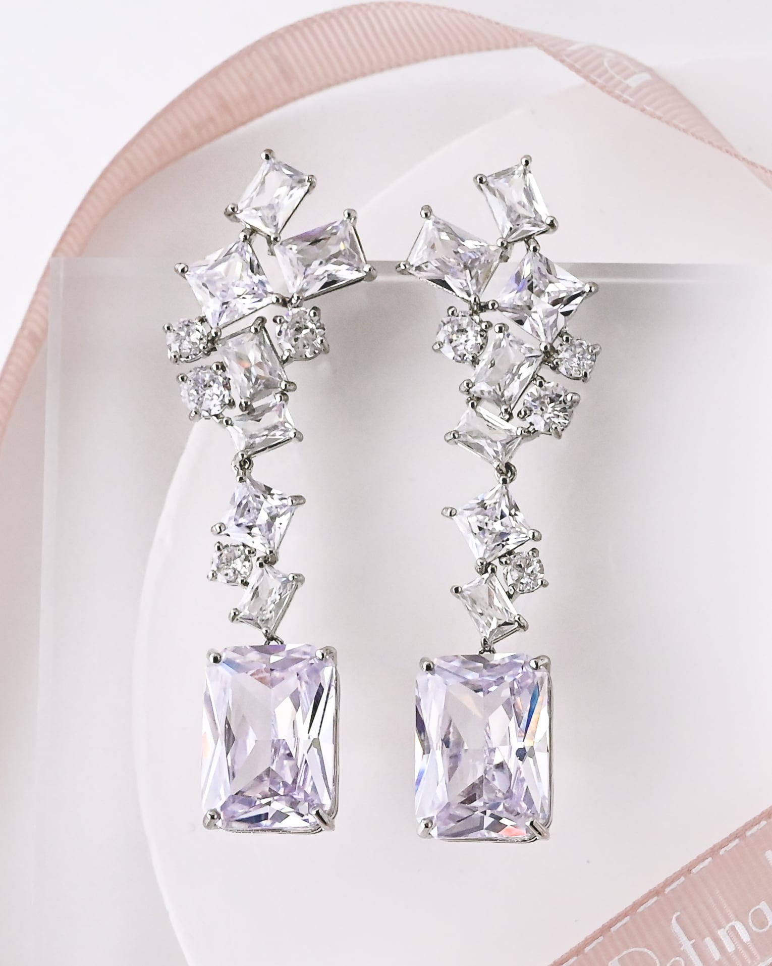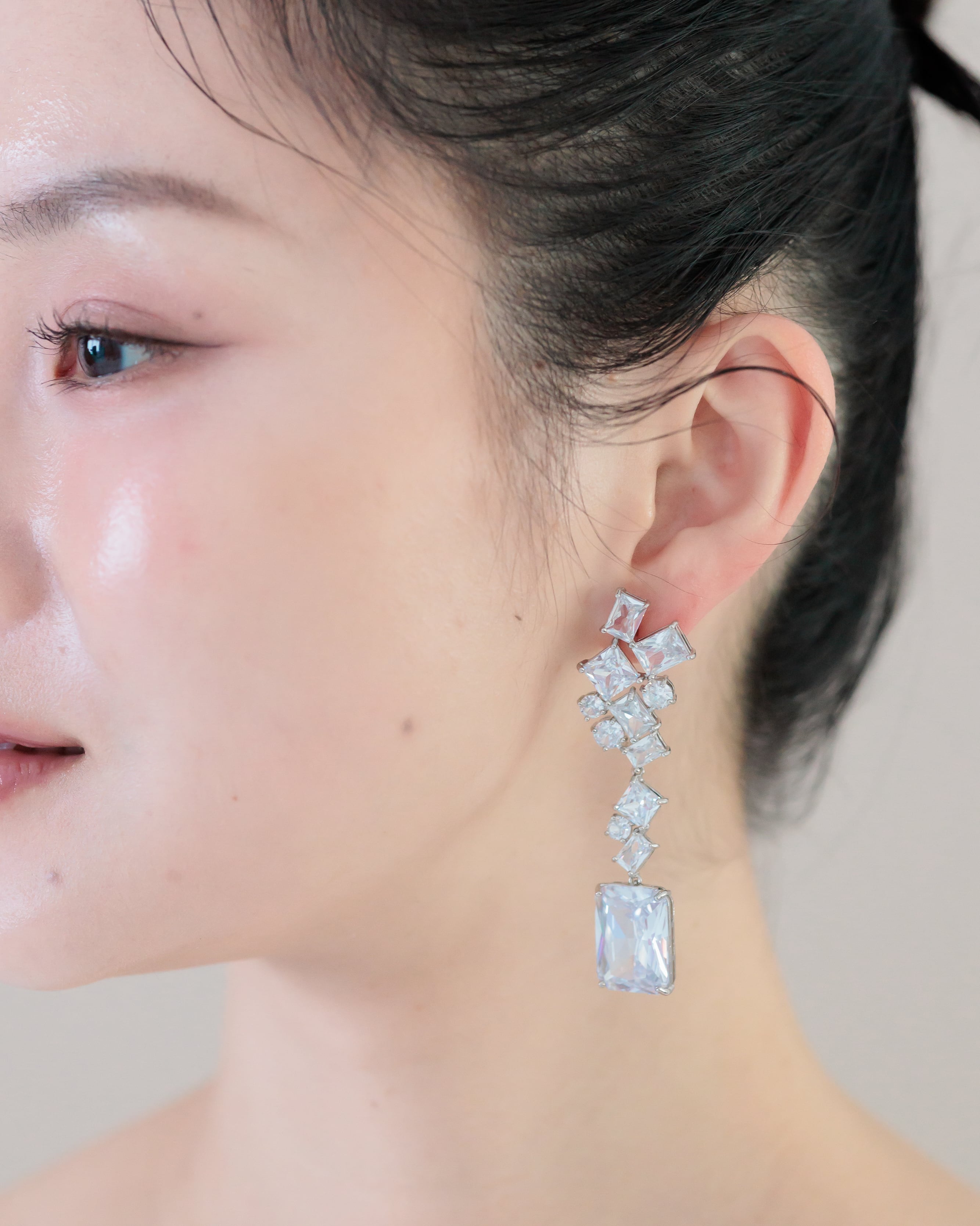 凛とした印象の四角いエメラルドカットのジルコニアストーンで構成されたデザインは、クラシカルながらどこかトレンドを感じさせる大人エレガントなブライダルピアス。