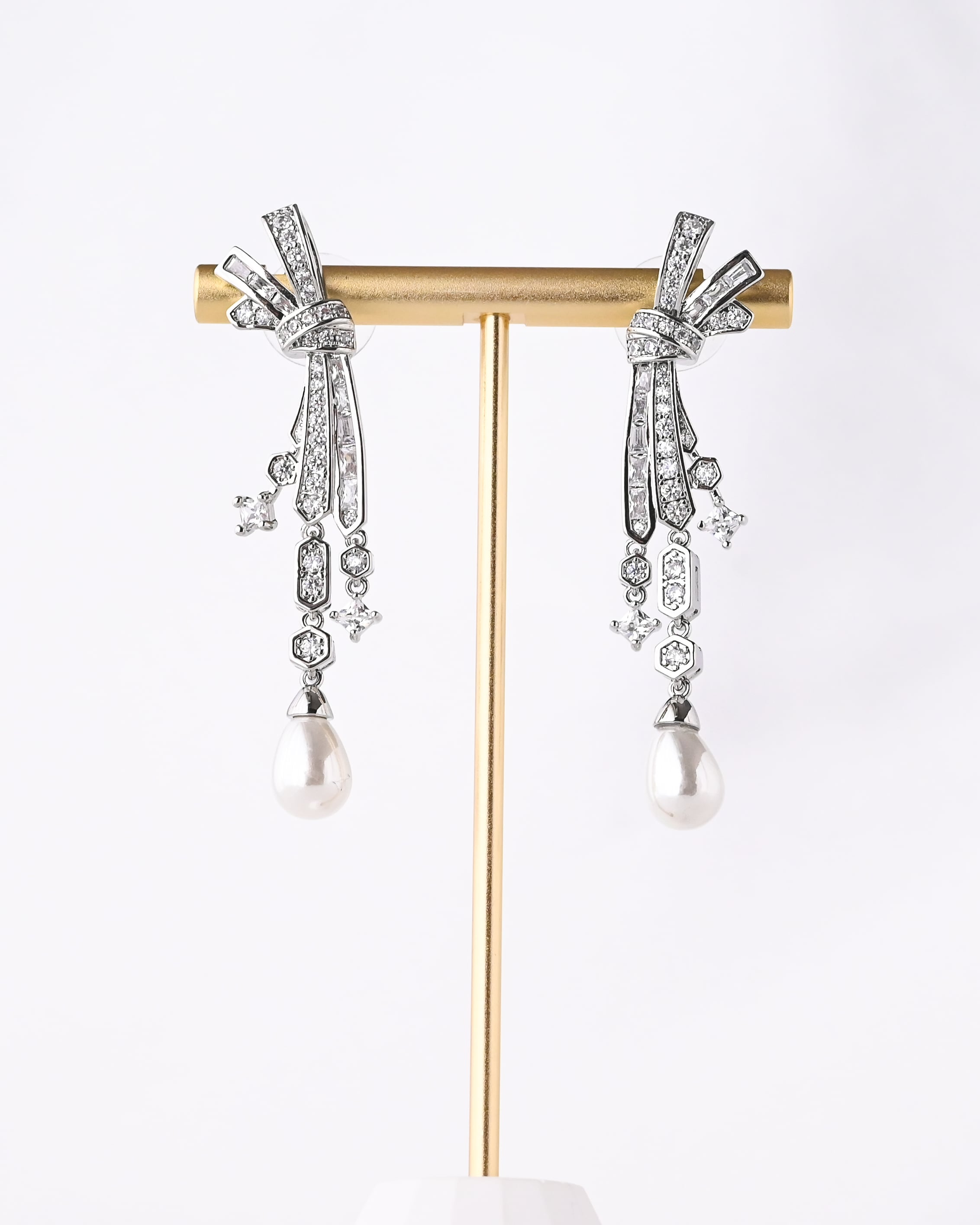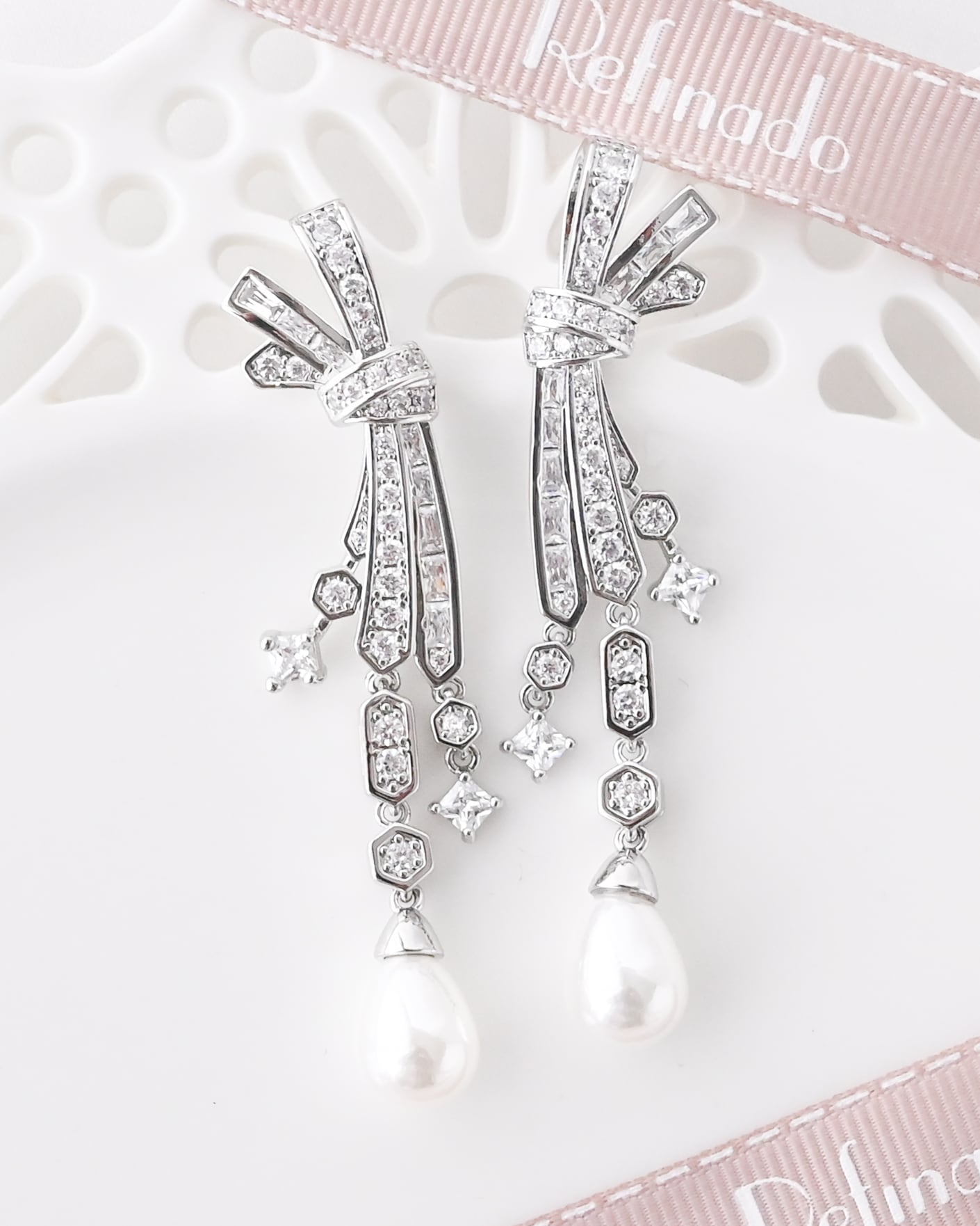 タイムレスに愛されるリボンモチーフと揺れ動くパールの組み合わせが奏でる愛らしくも上品なハーモニーが女性ごころ擽るブライダルピアス。