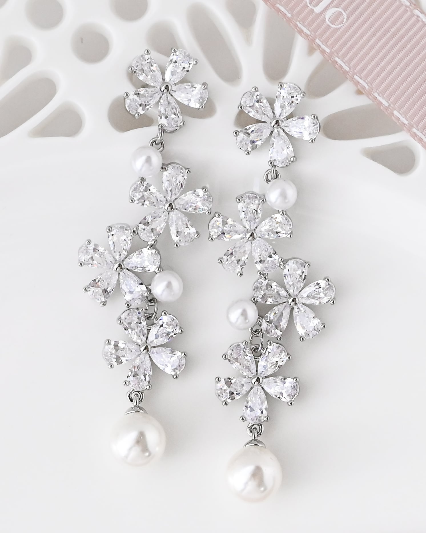 お花とパールが醸し出す愛らしくもエレガントな雰囲気が乙女心くすぐるブライダルピアス/イヤリング。