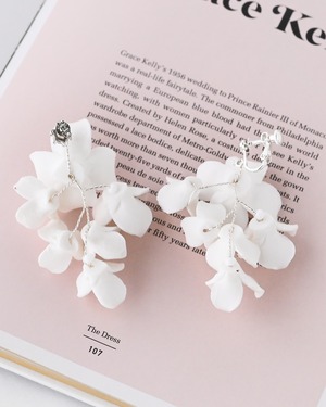セラミックの白いお花がリズミカルに連なったエレガントでチャーミングな印象のイヤリング/ピアス。