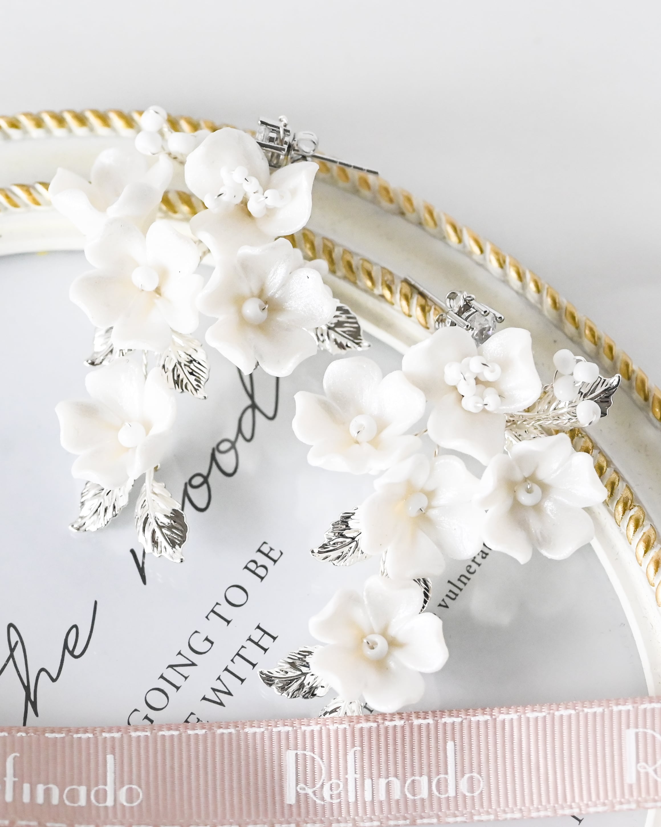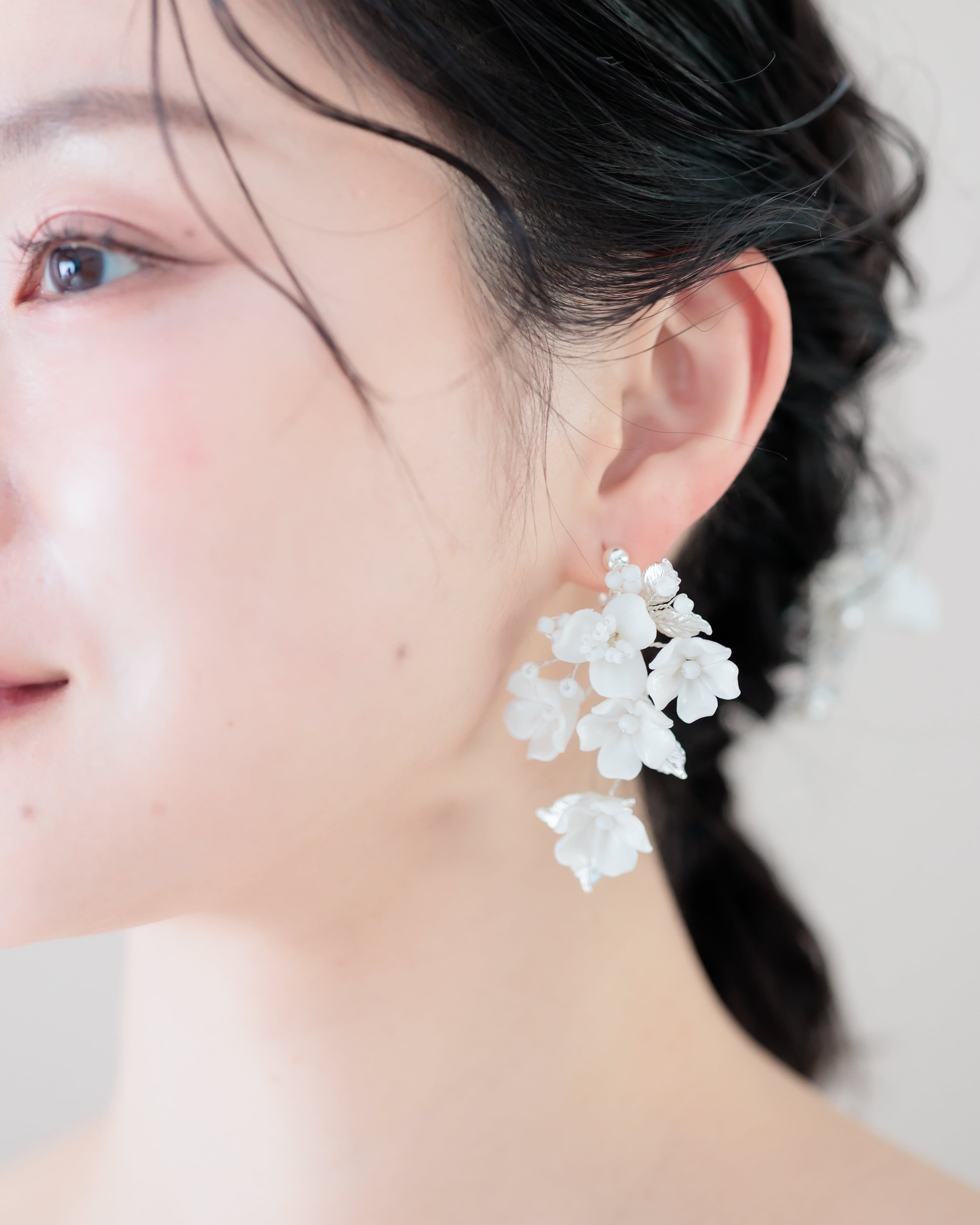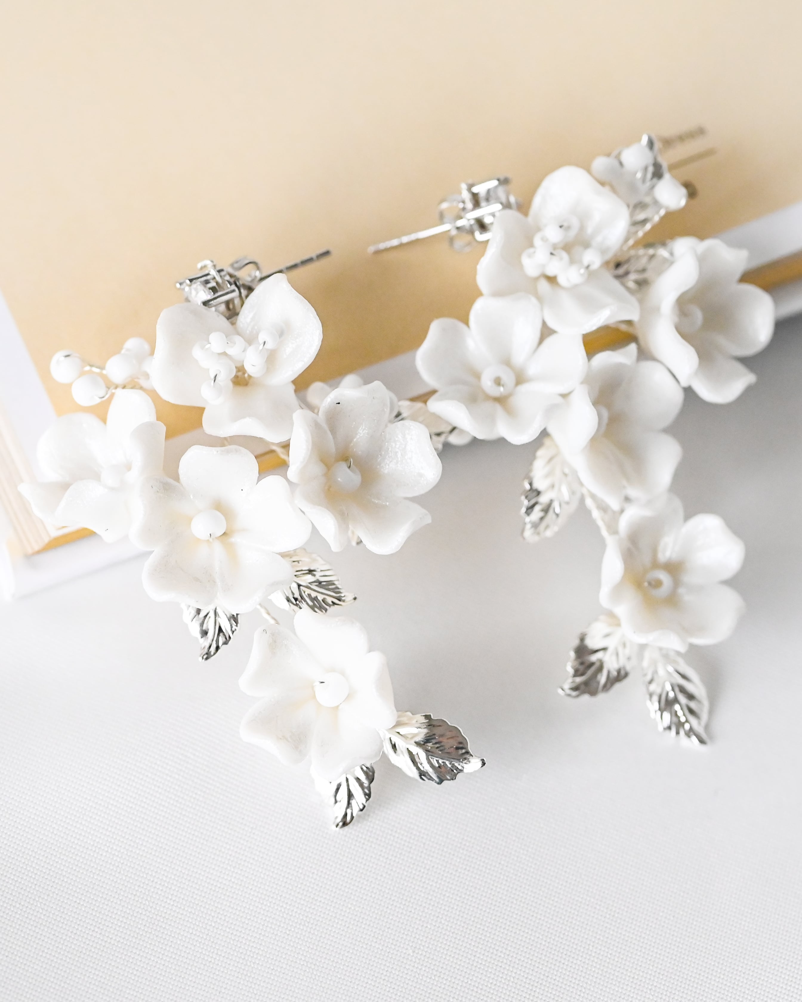 小さなセラミックの白いお花で構成された愛らしくも優美な印象のデザインをシルバーのリーフが彩り、優しくも華やかさあるブライダルスタイルを演出してくれます。