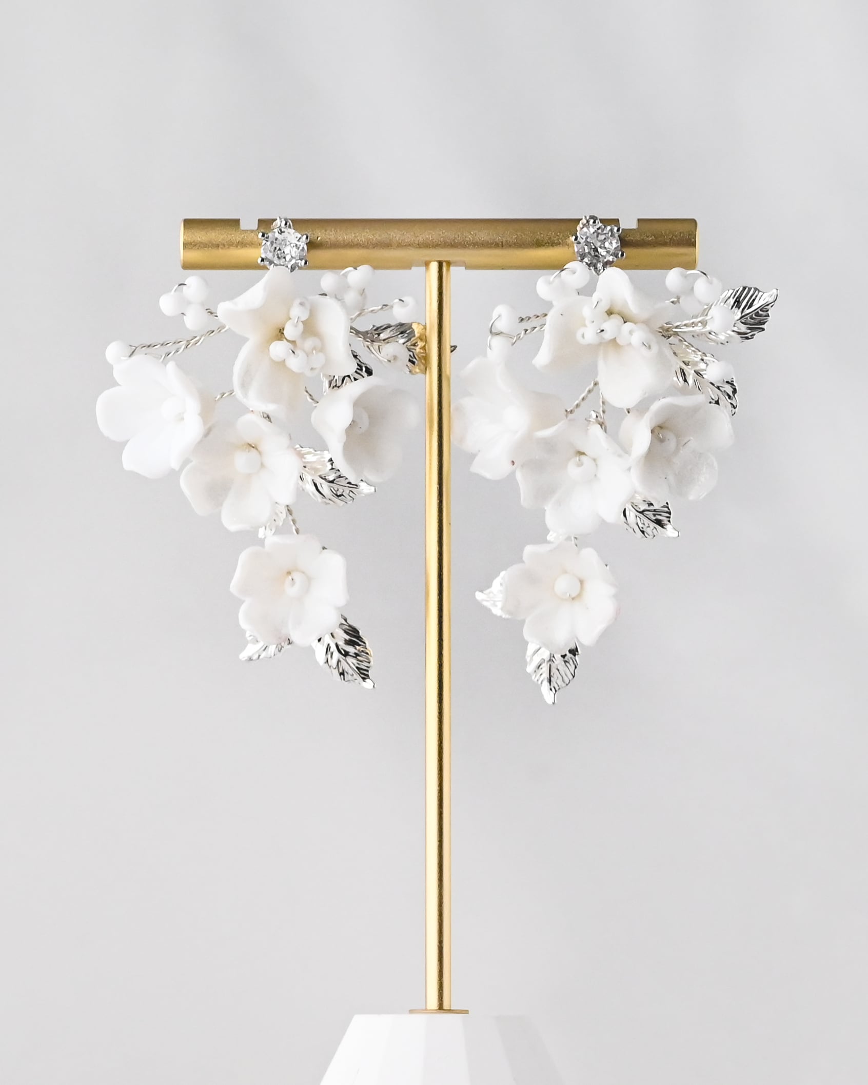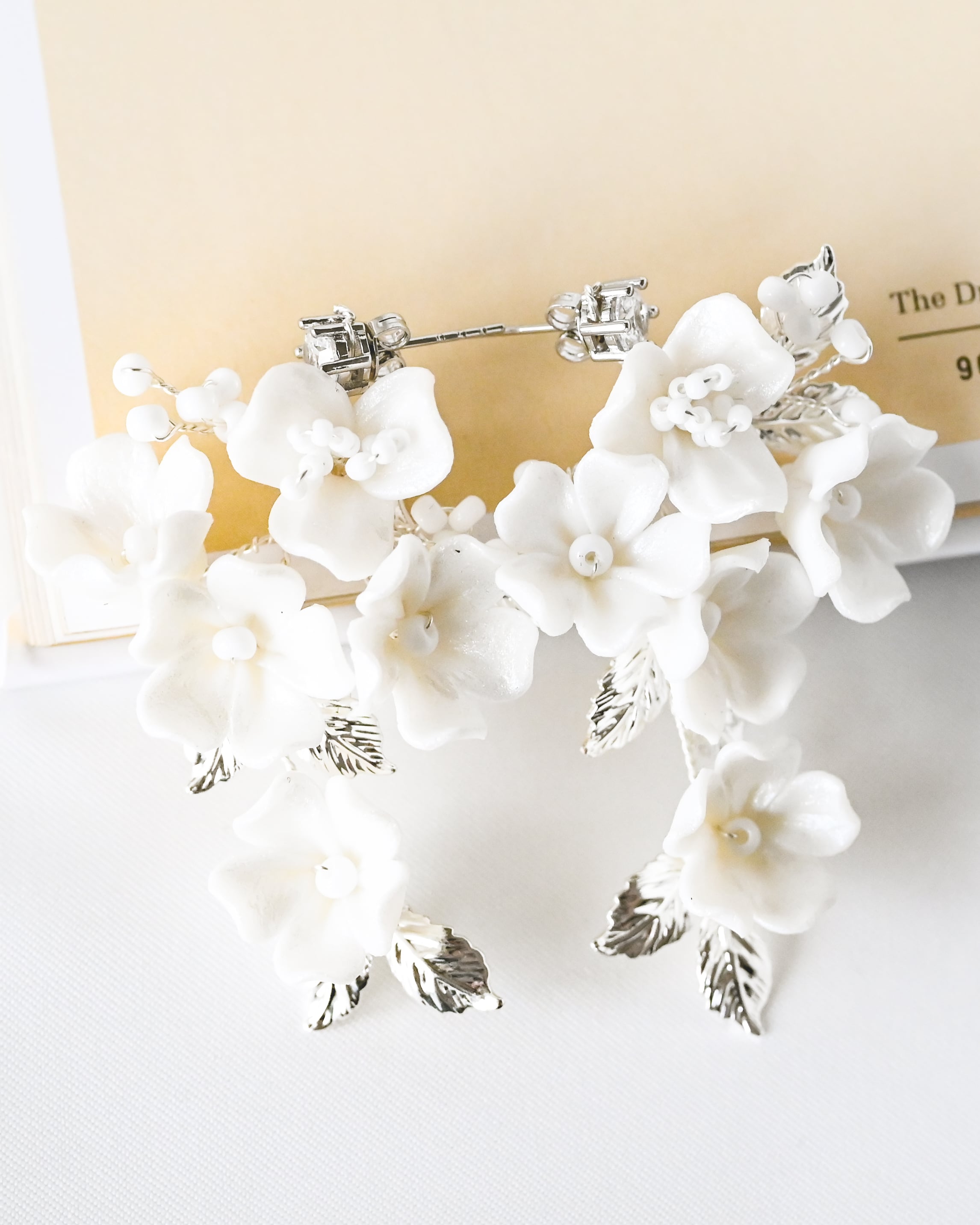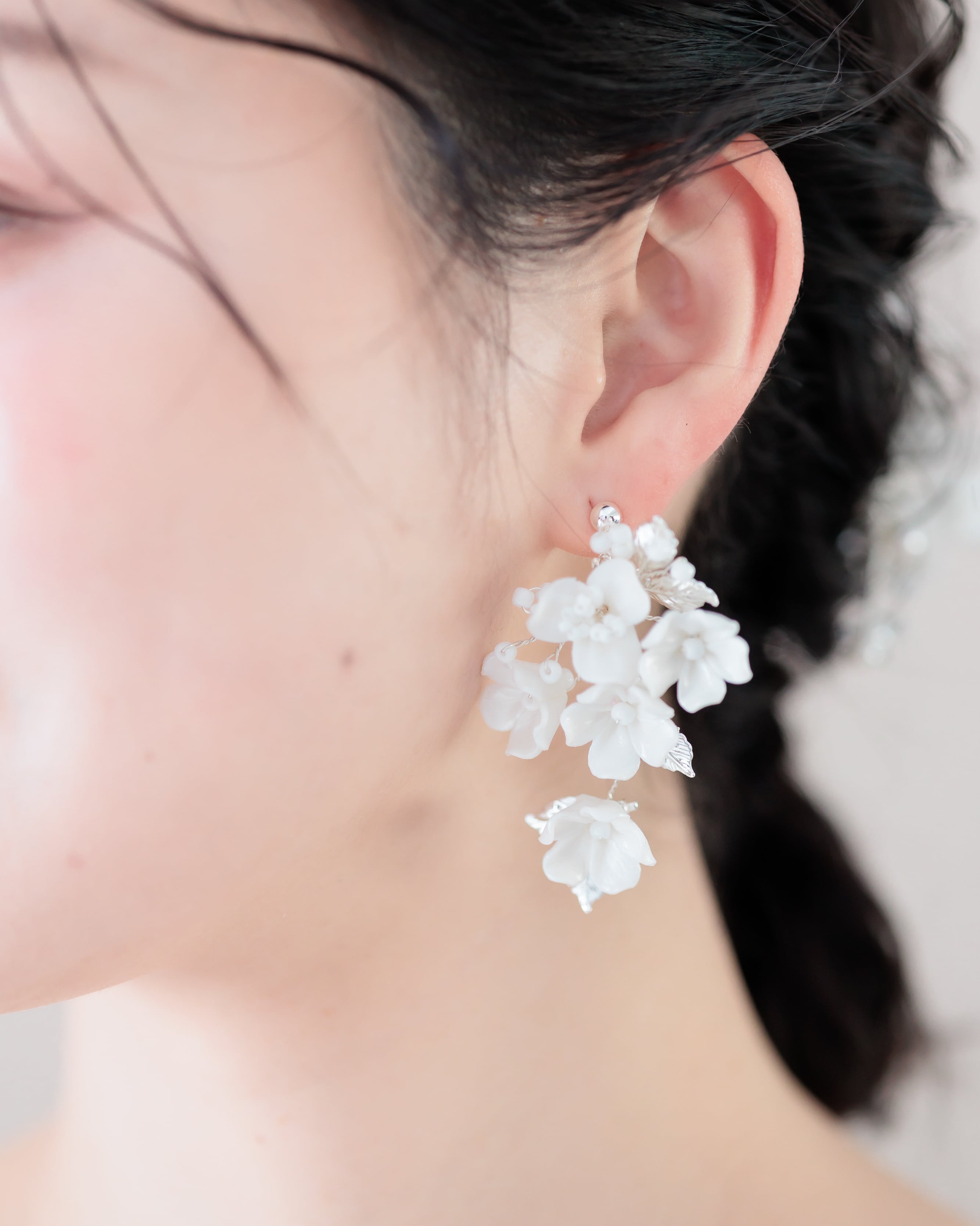 小さなセラミックの白いお花で構成された愛らしくも優美な印象のデザインをシルバーのリーフが彩り、優しくも華やかさあるブライダルスタイルを演出してくれます。