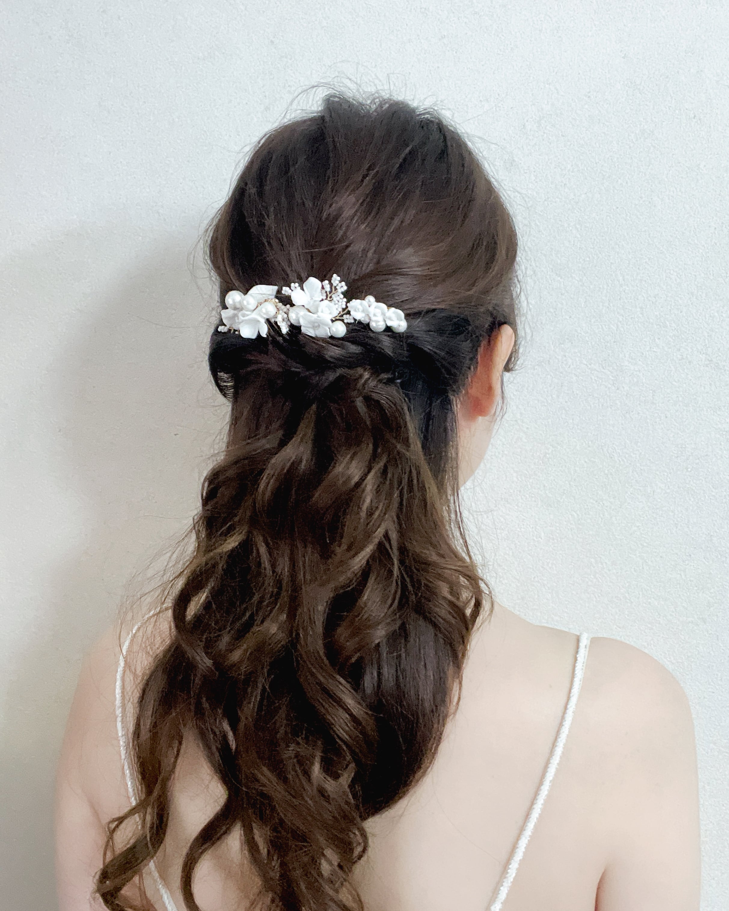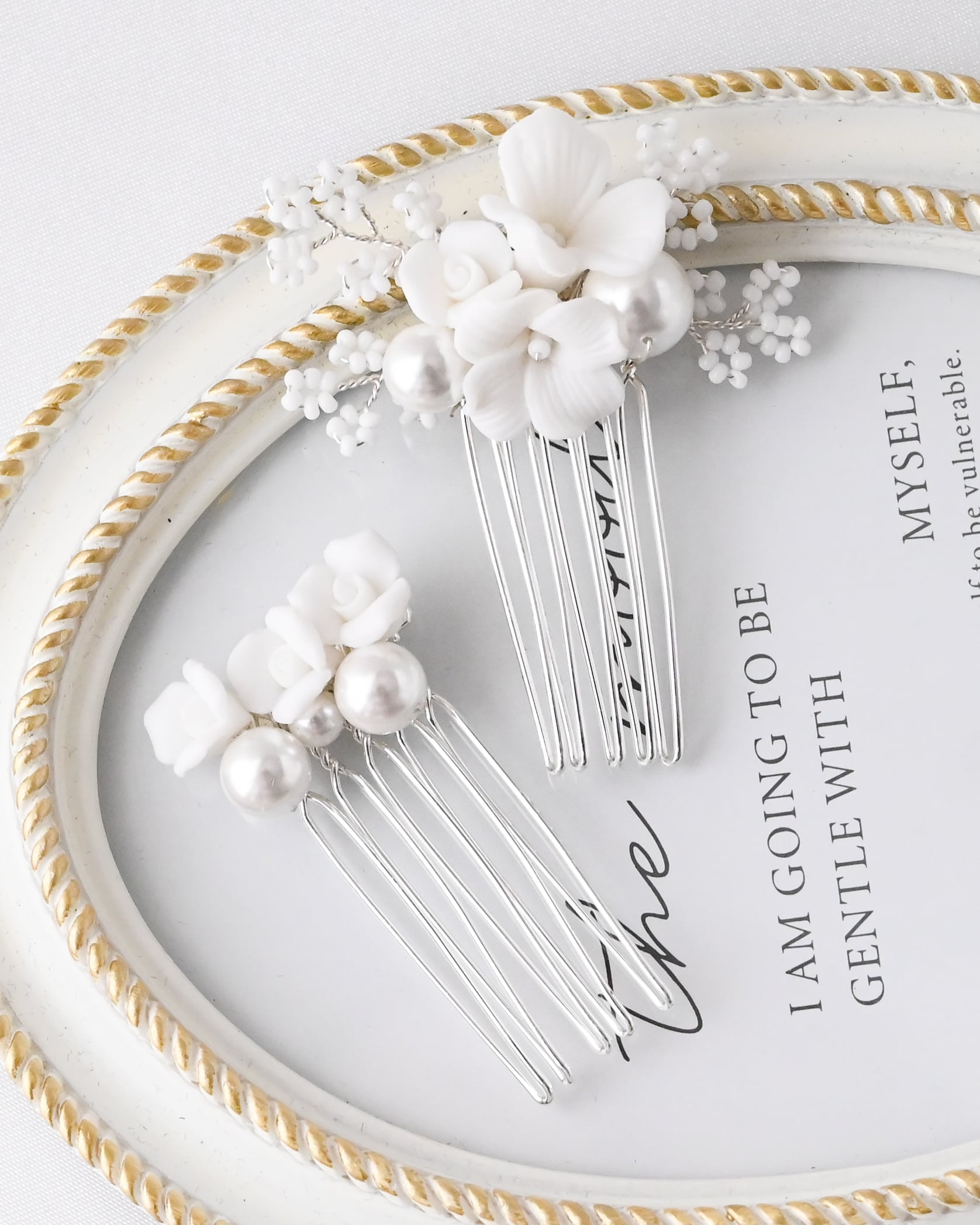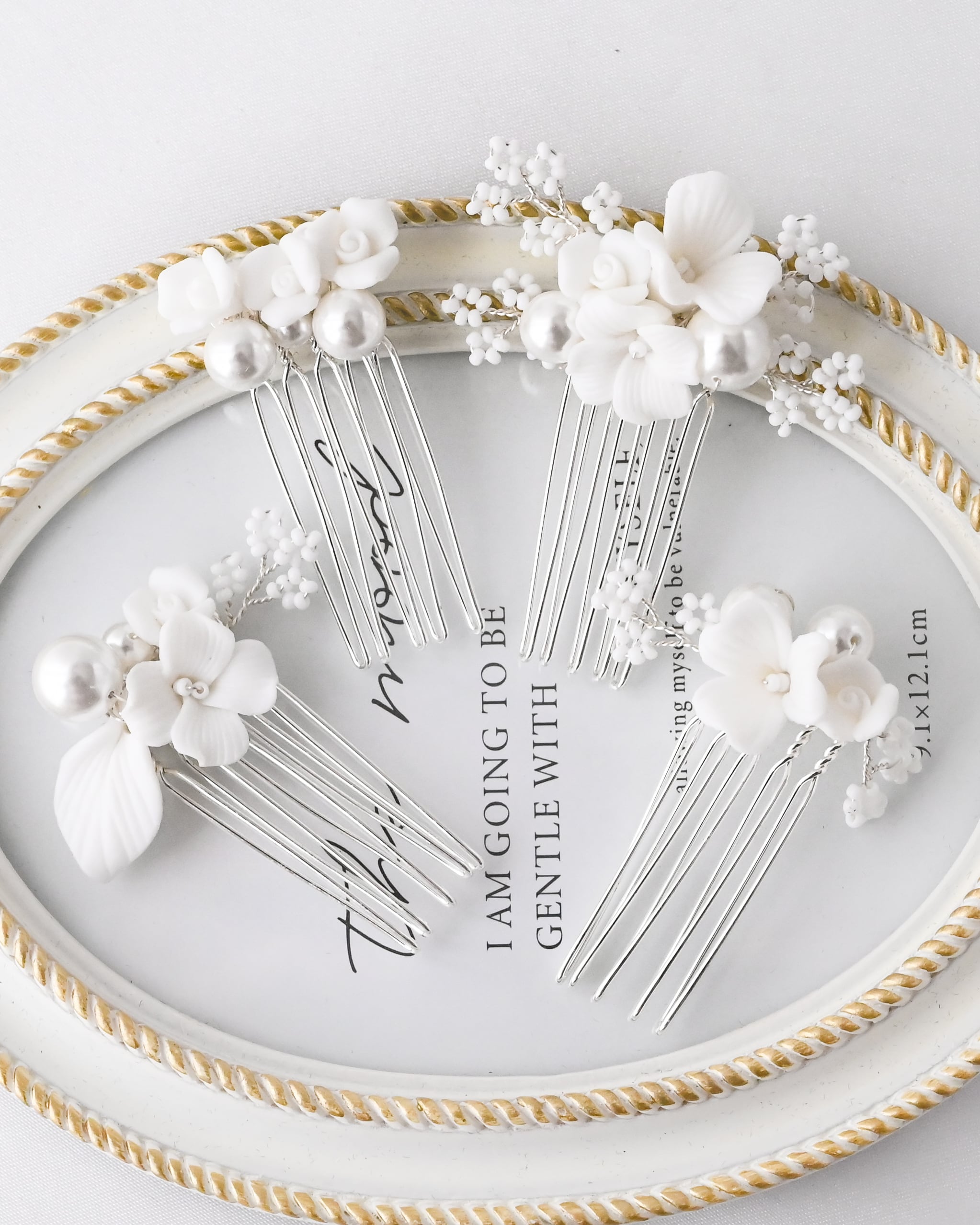 4つのヘアコームはアレンジの自由度が高く、まとめ髪やハーフアップ、サイドアレンジにもバランスよく配置できます。組み合わせ方次第でナチュラルにもエレガントにも表情を変え、特別な一日を自分らしく彩ります。