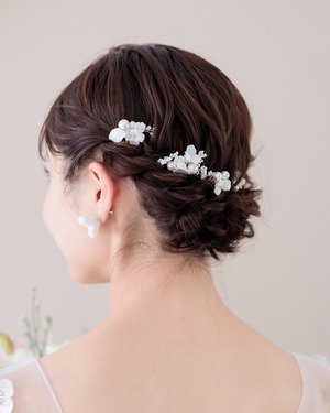 純白のセラミックフラワーを贅沢にあしらった、上品で愛らしいヘアアクセサリー4点セット。小花のように繊細な質感と、セラミックならではのマットで洗練された質感が、花嫁さまの清楚な美しさを一層引き立てます。