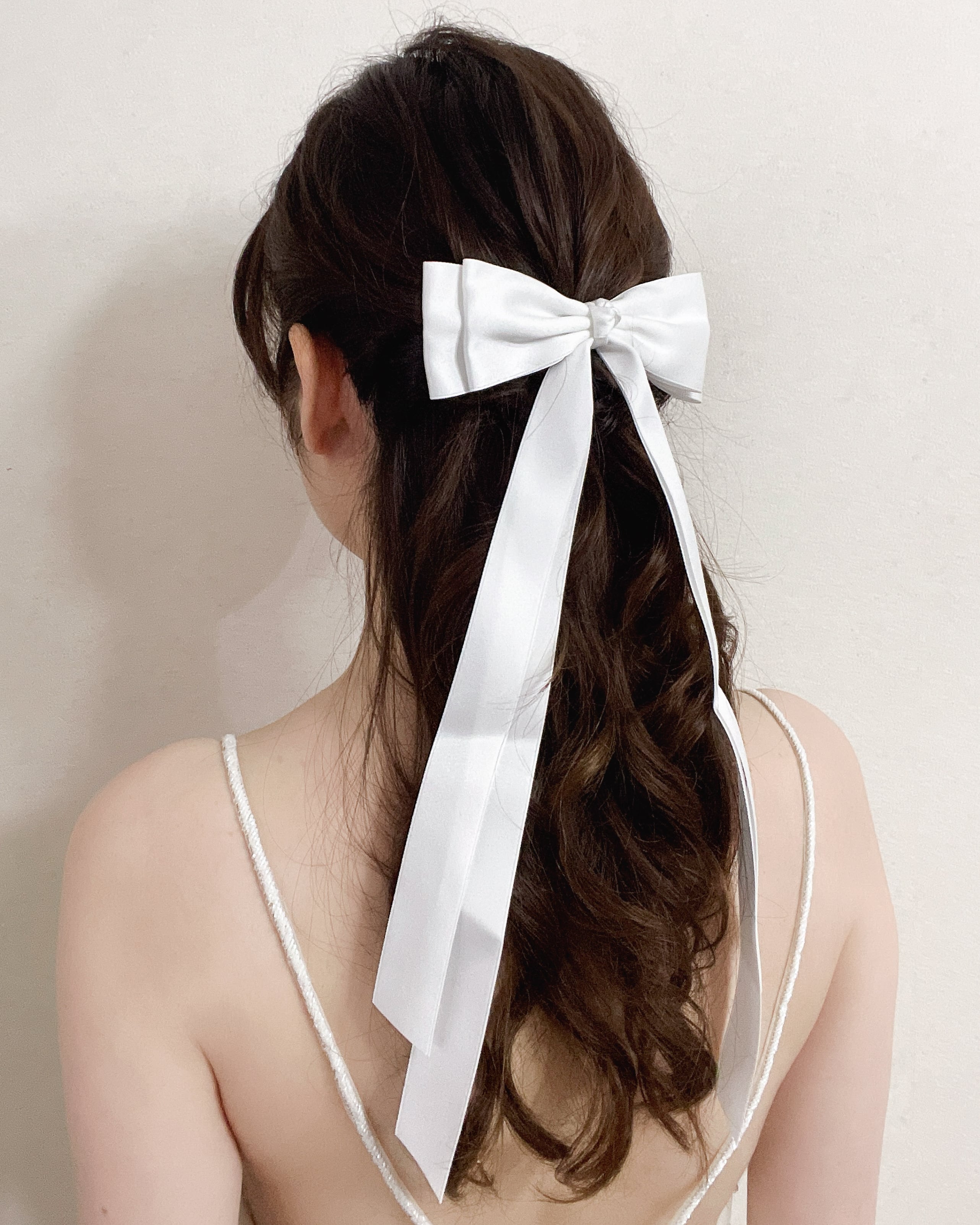 上質なサテン調の生地を使用し、なめらかな光沢と美しいラインを描く大ぶりのリボンが、花嫁さまのヘアスタイルをエレガントに彩ります。