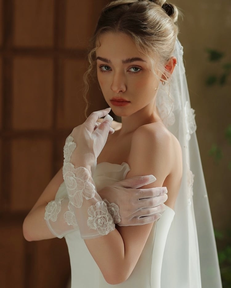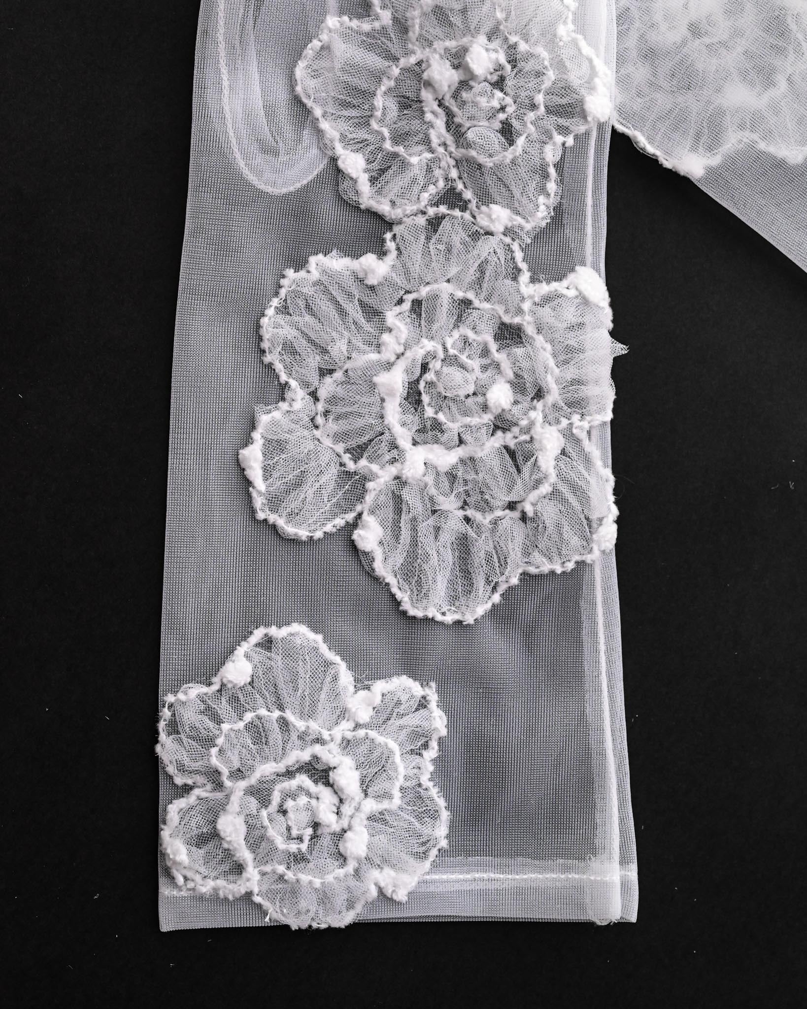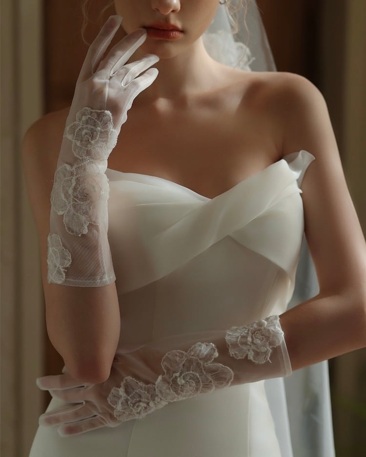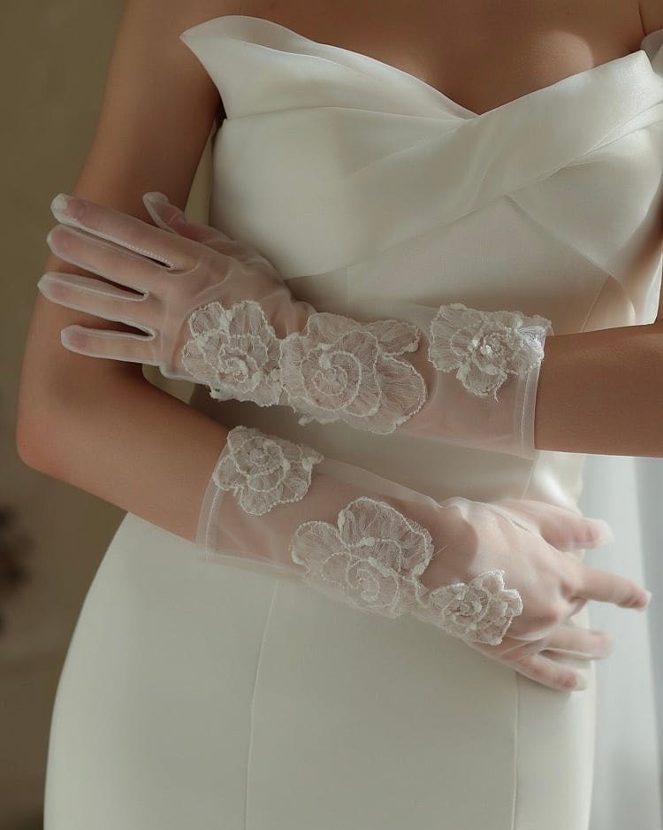 透明感のあるチュールに、立体的な花刺繍を丁寧に重ねることで、手元に上品な華やかさを添えます。軽やかな透け感が肌を美しく見せ、指先まで繊細で女性らしい印象に。