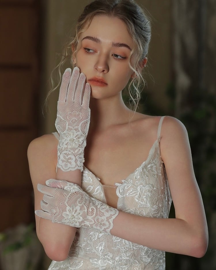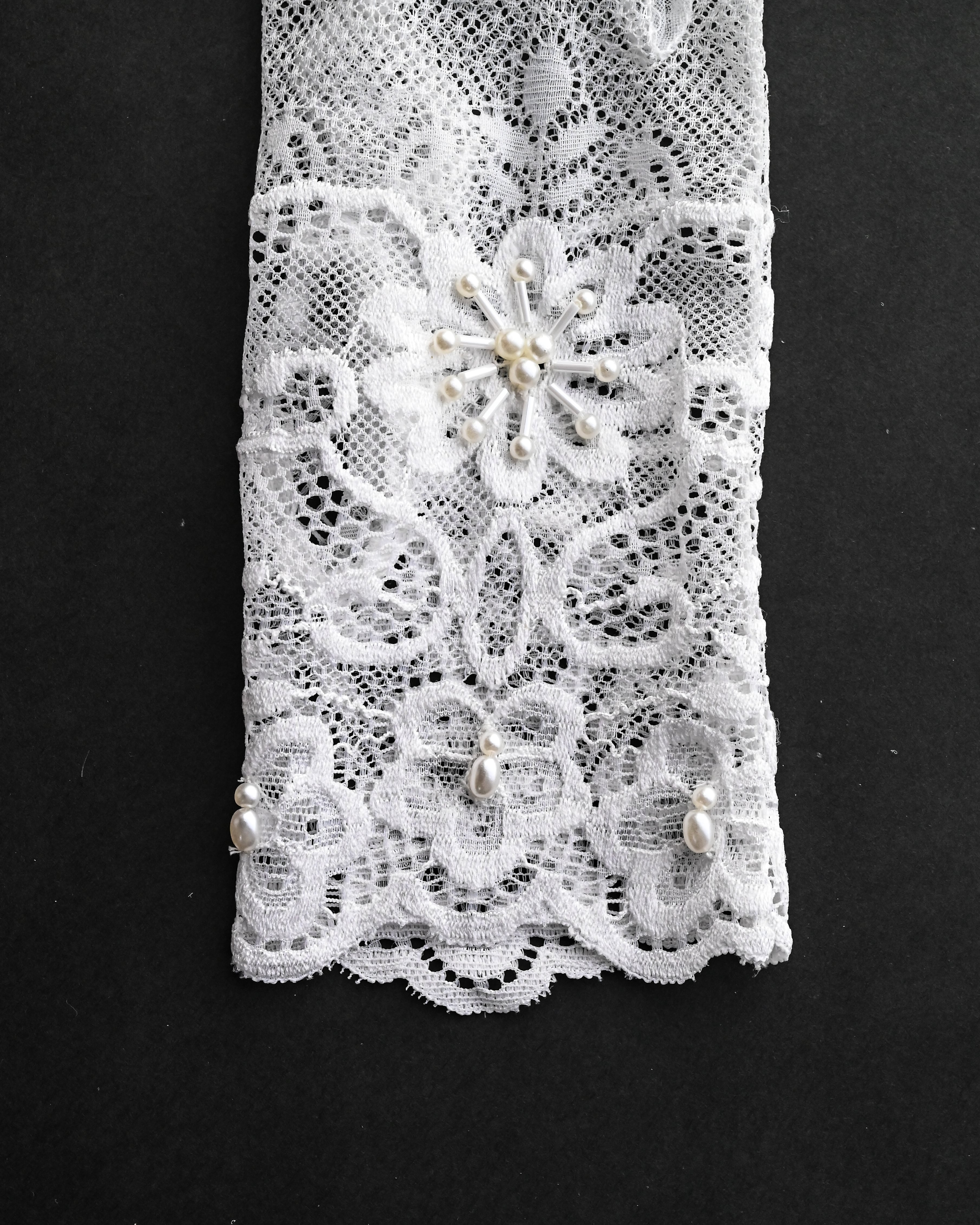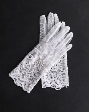 立体感のあるフラワーレースの上に、パールとビーズを贅沢に施し、手元に華やかでエレガントな輝きを添えます。指先まで透ける繊細なレースは、清楚でありながらも大人の女性らしい洗練された印象を演出。