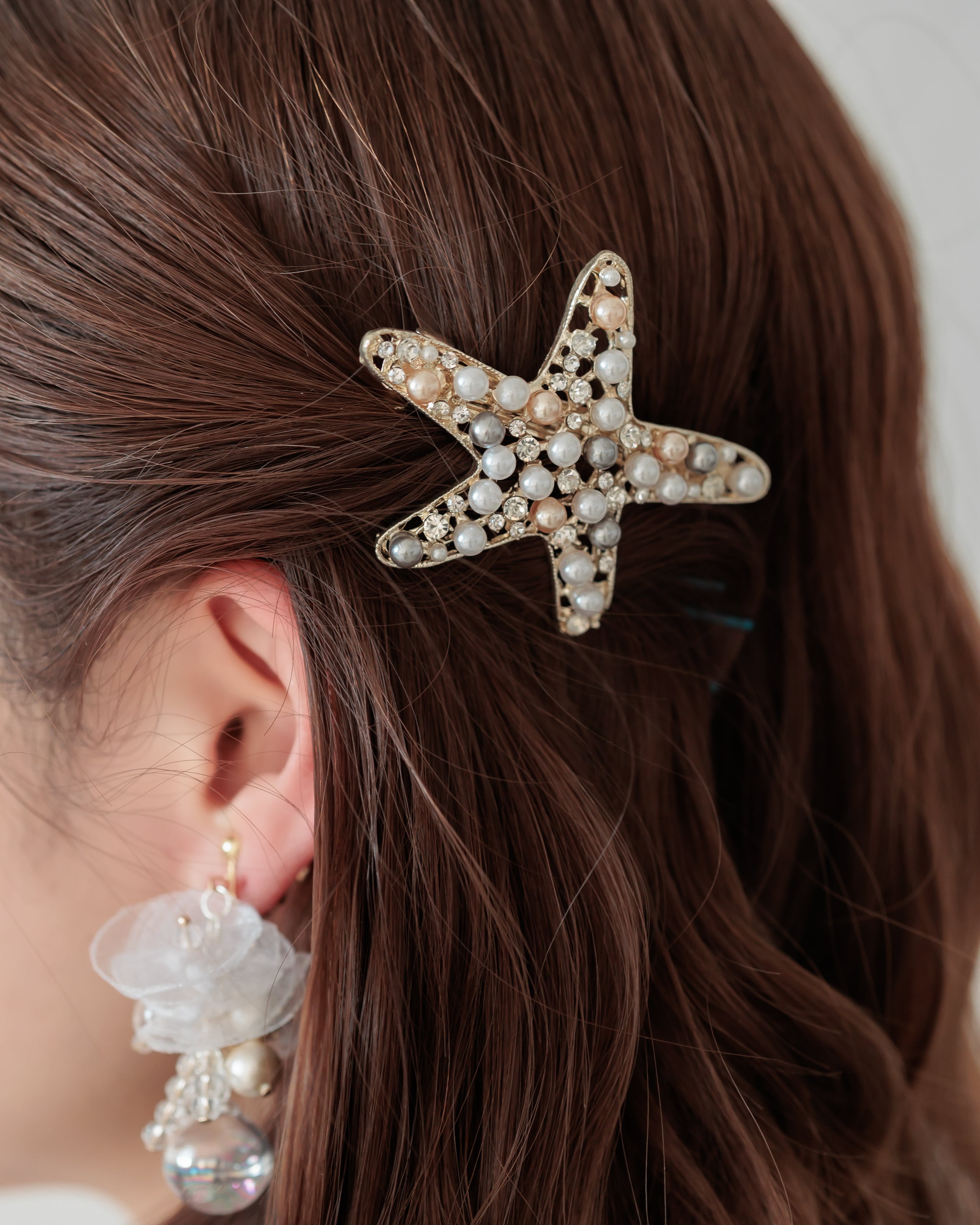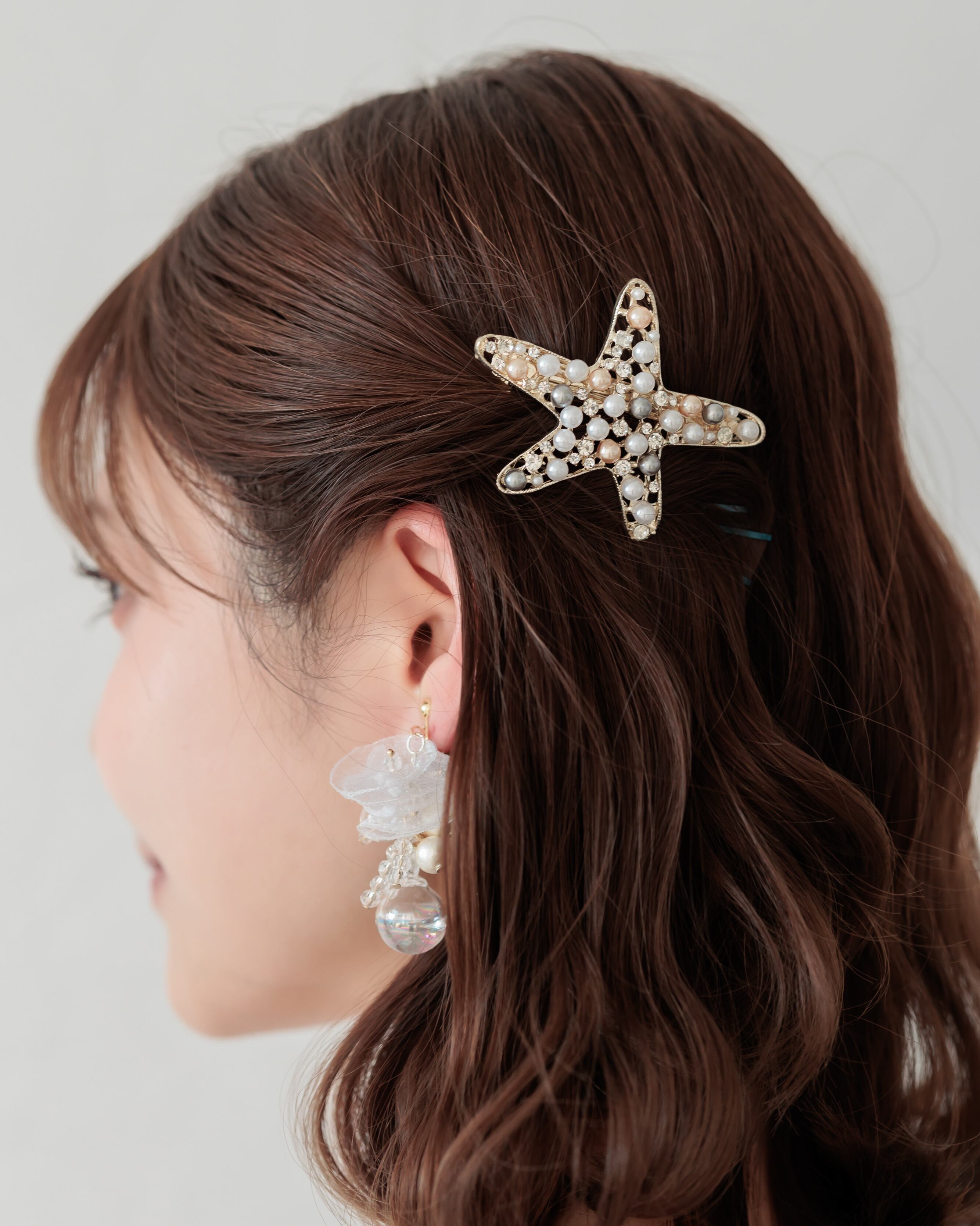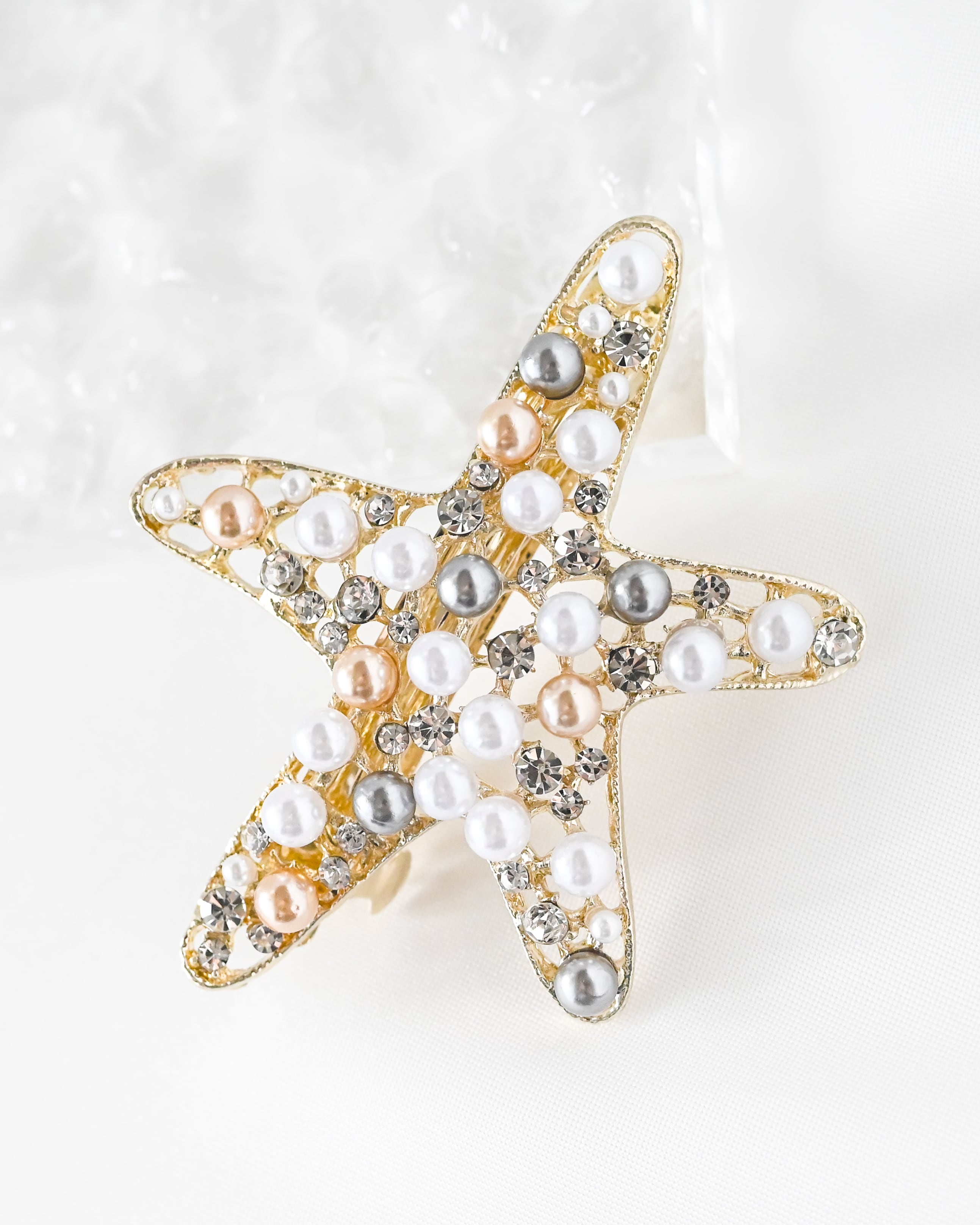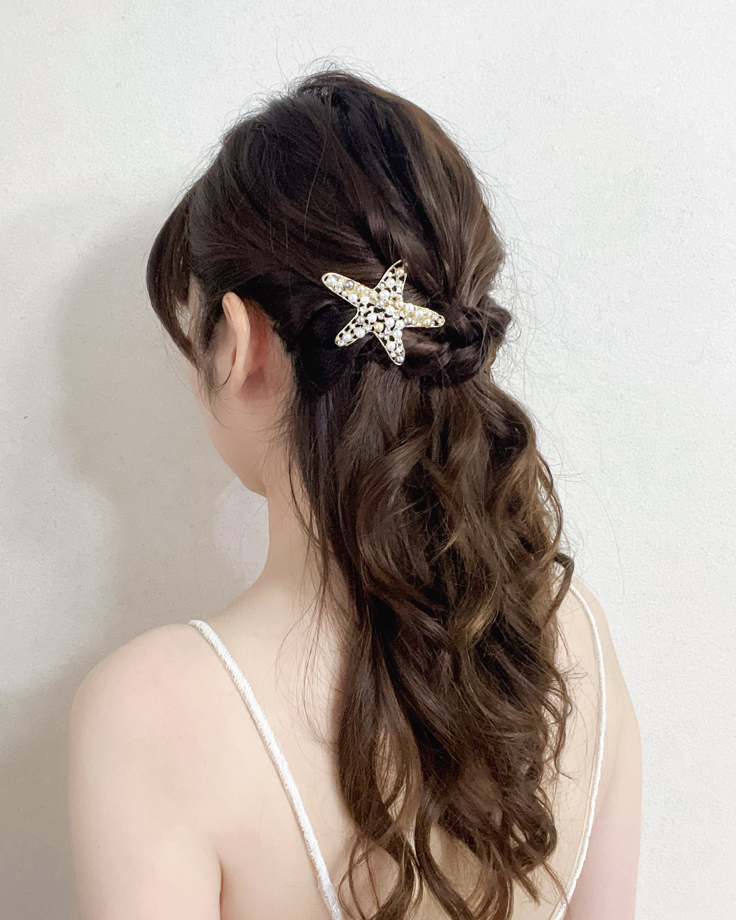 存在感のあるスターフィッシュデザインは、リゾートウェディングやビーチフォトとの相性抜群。アップスタイルやポニーテールに添えるだけで、華やかで印象的なヘアスタイルを完成させてくれます。
