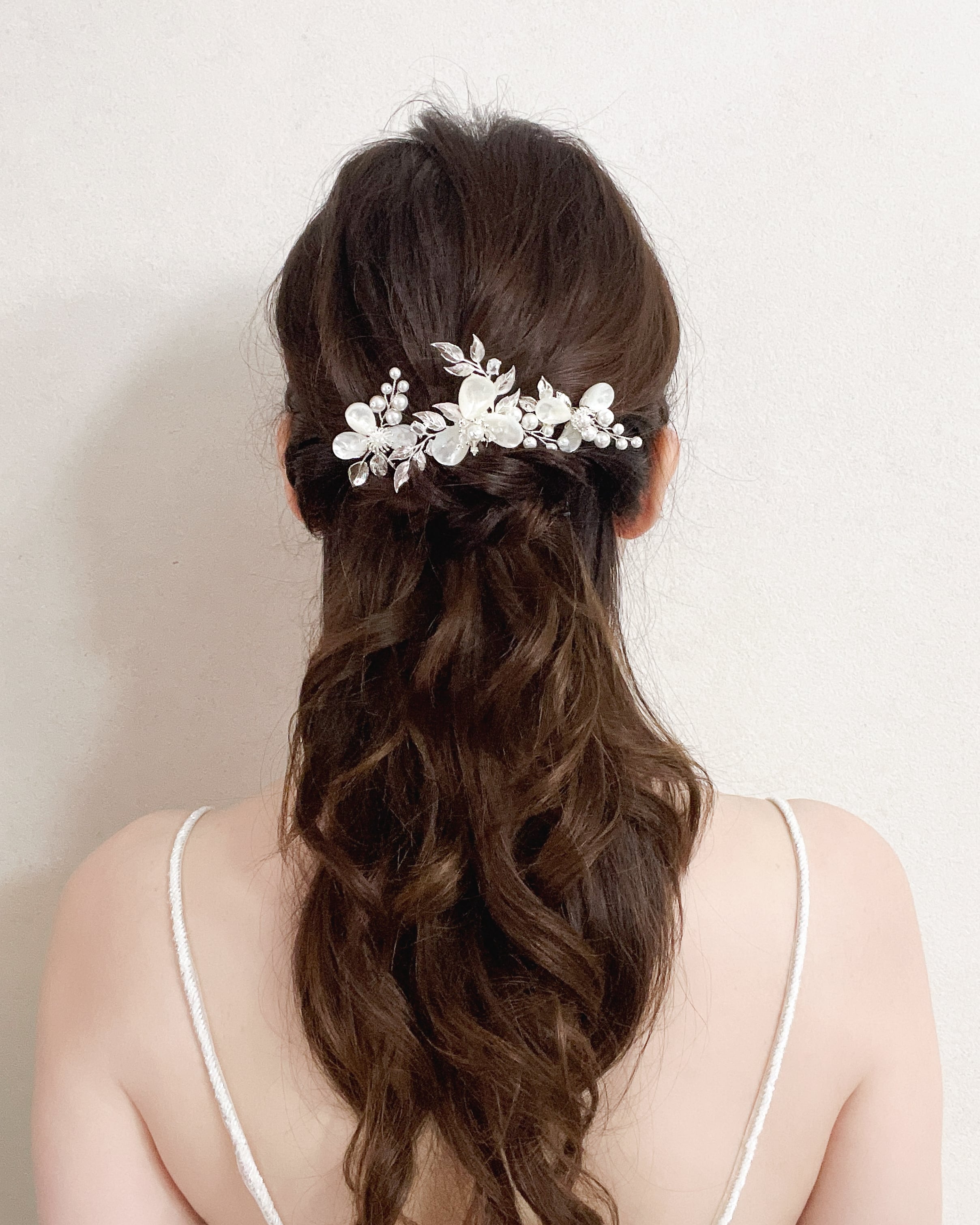 角度によって表情を変えるシェルの花びらは、まるで本物の花のように瑞々しく、花嫁さまの髪を清らかに彩ります。中央にあしらわれたパールやクリスタルが光を受けて煌めき、より一層ロマンティックな印象を与えます。