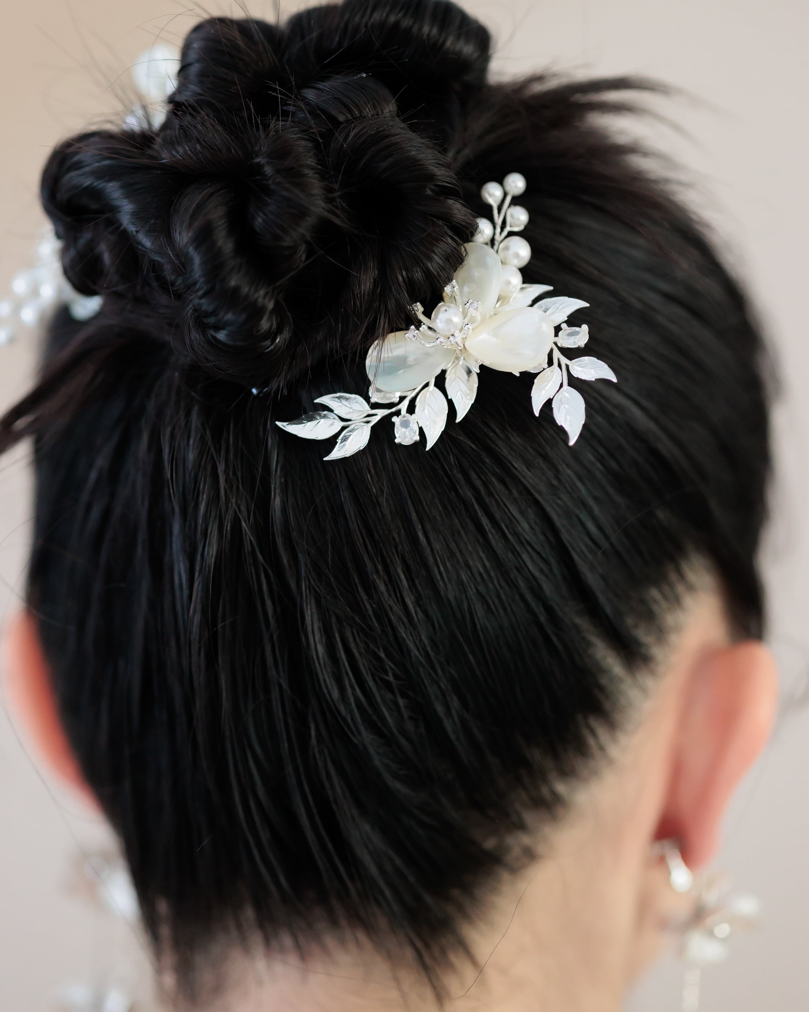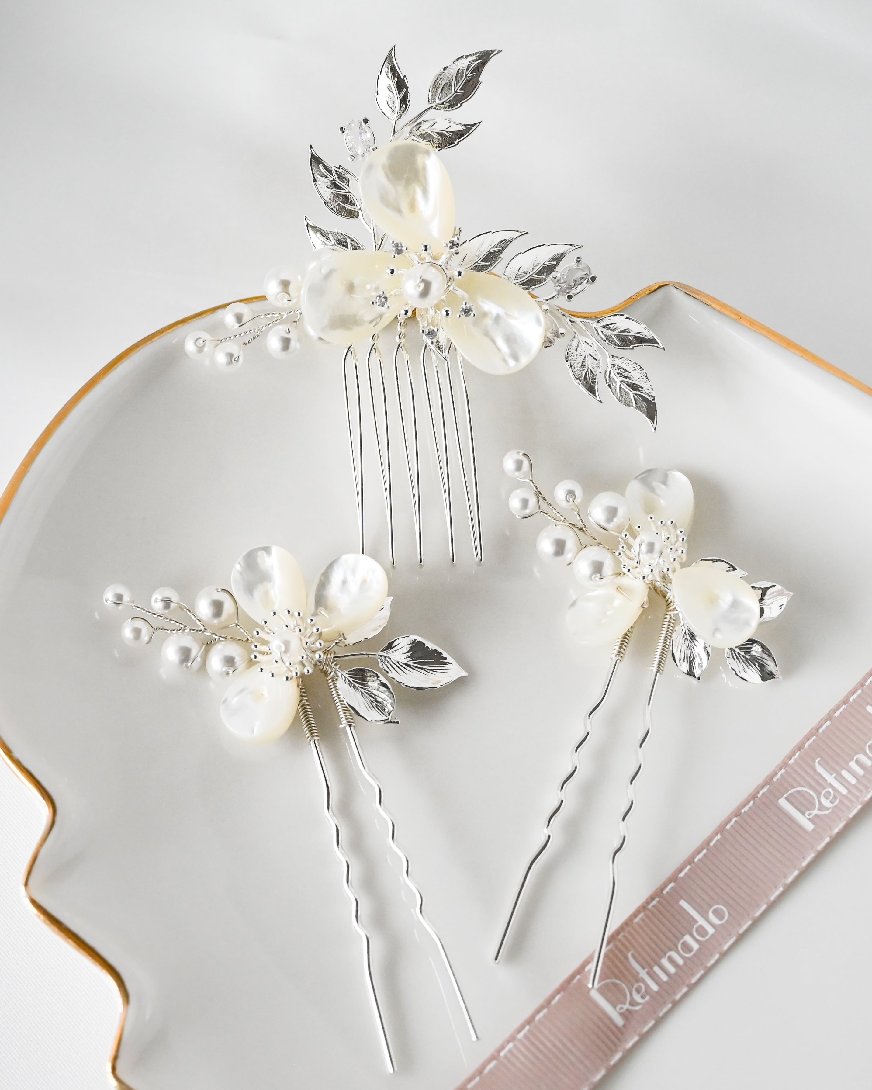 シェルの光沢感あるお花と、上品に輝くシルバーリーフが調和した、華やかなヘアアクセサリー3個セット。