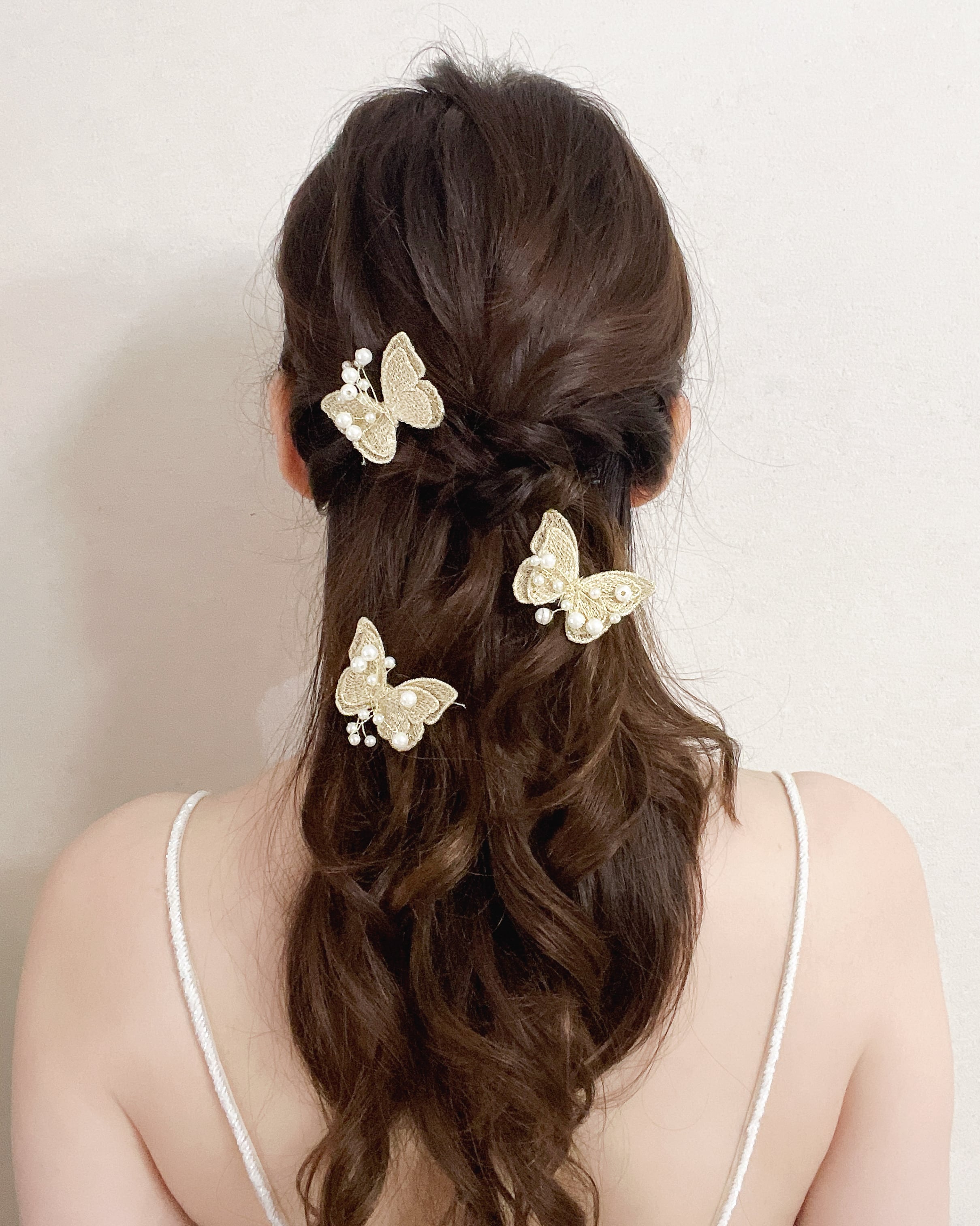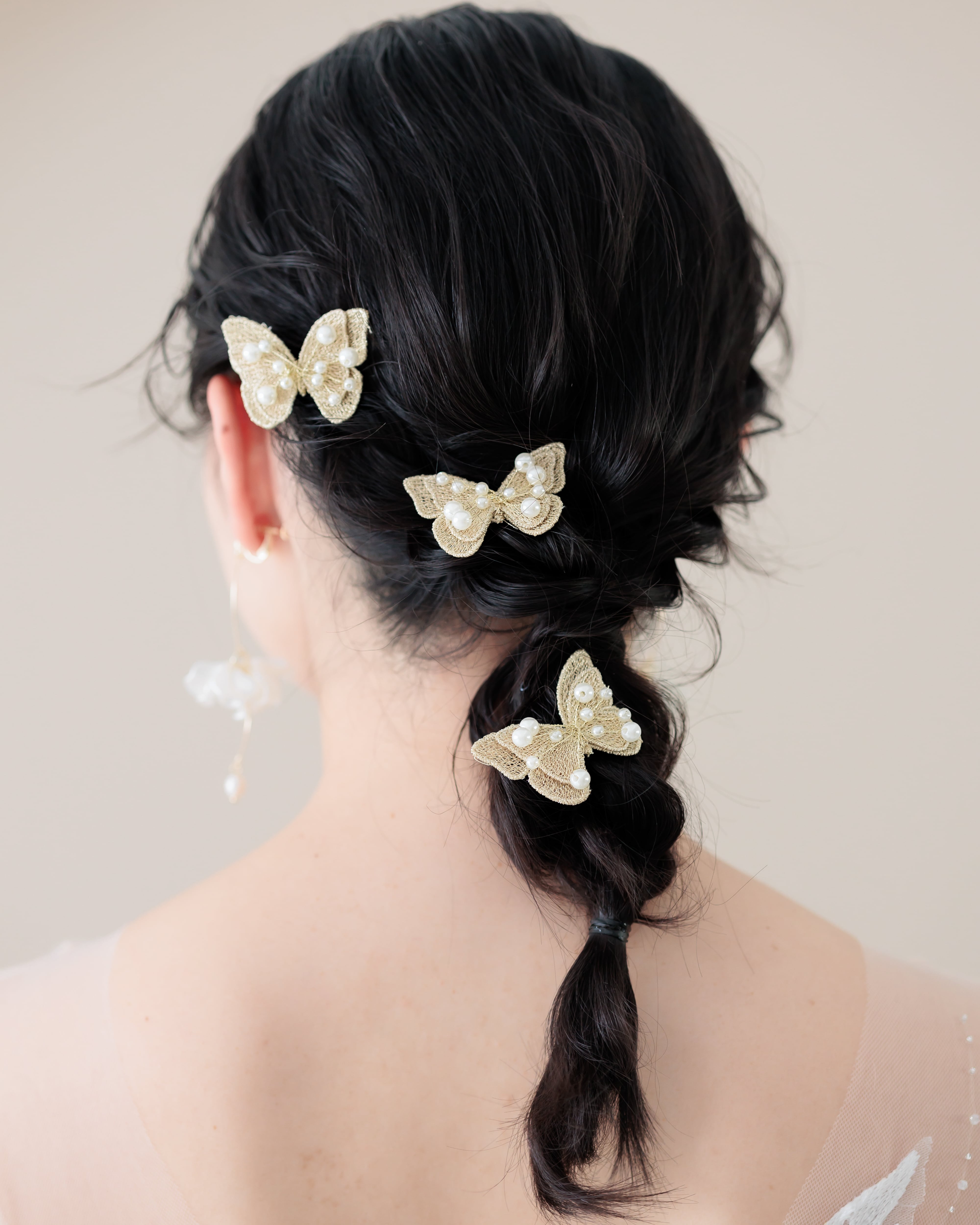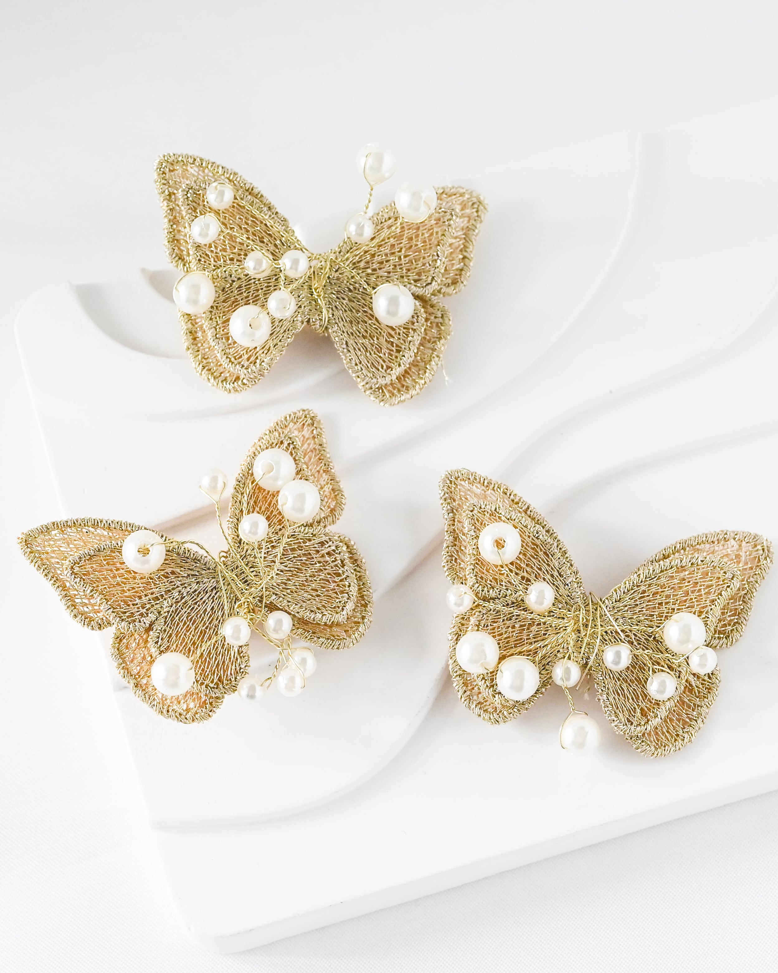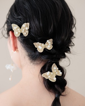 繊細なゴールドワイヤーで形作られた蝶々に、上品なパールを散りばめた華やかなヘアクリップ3個セット。