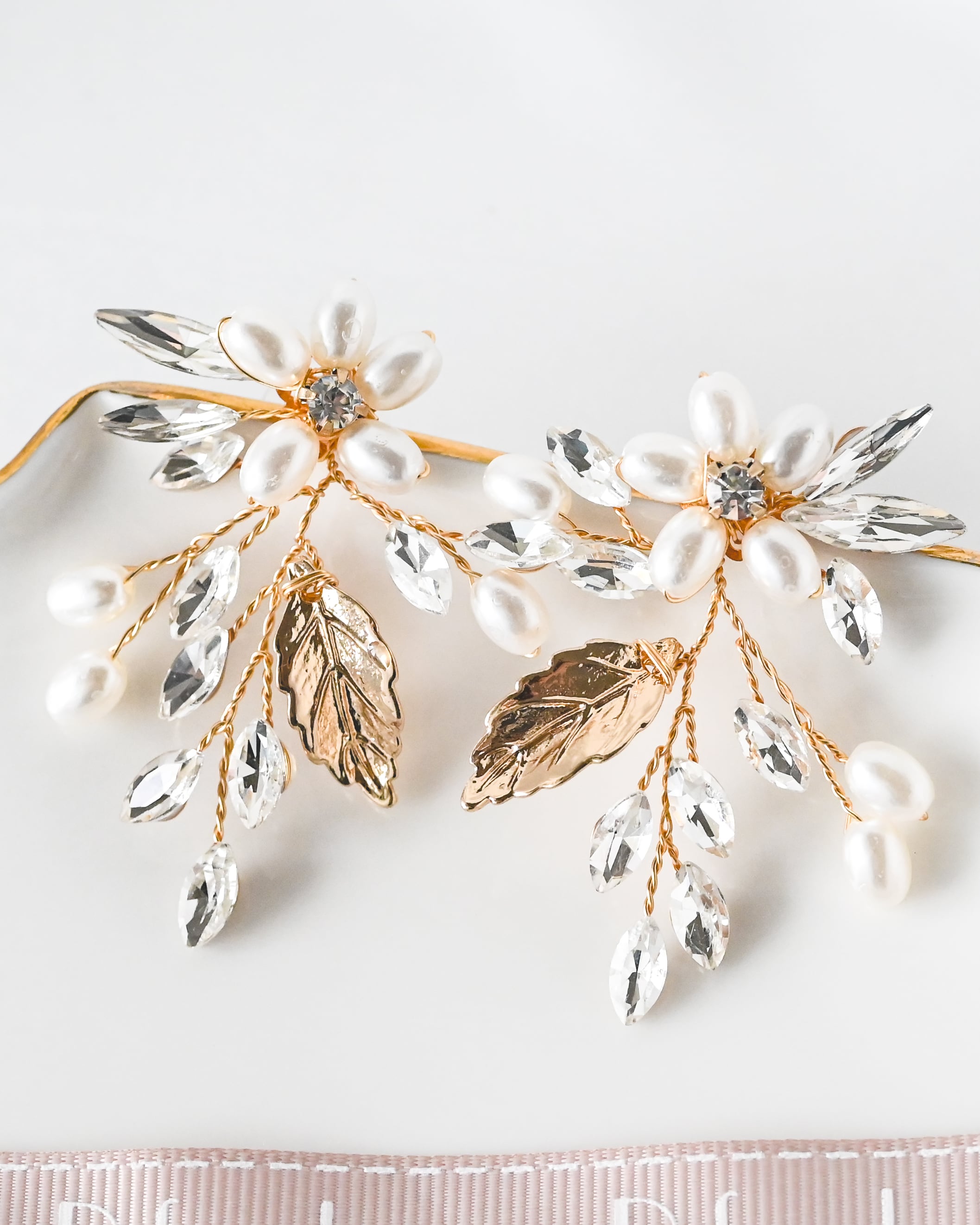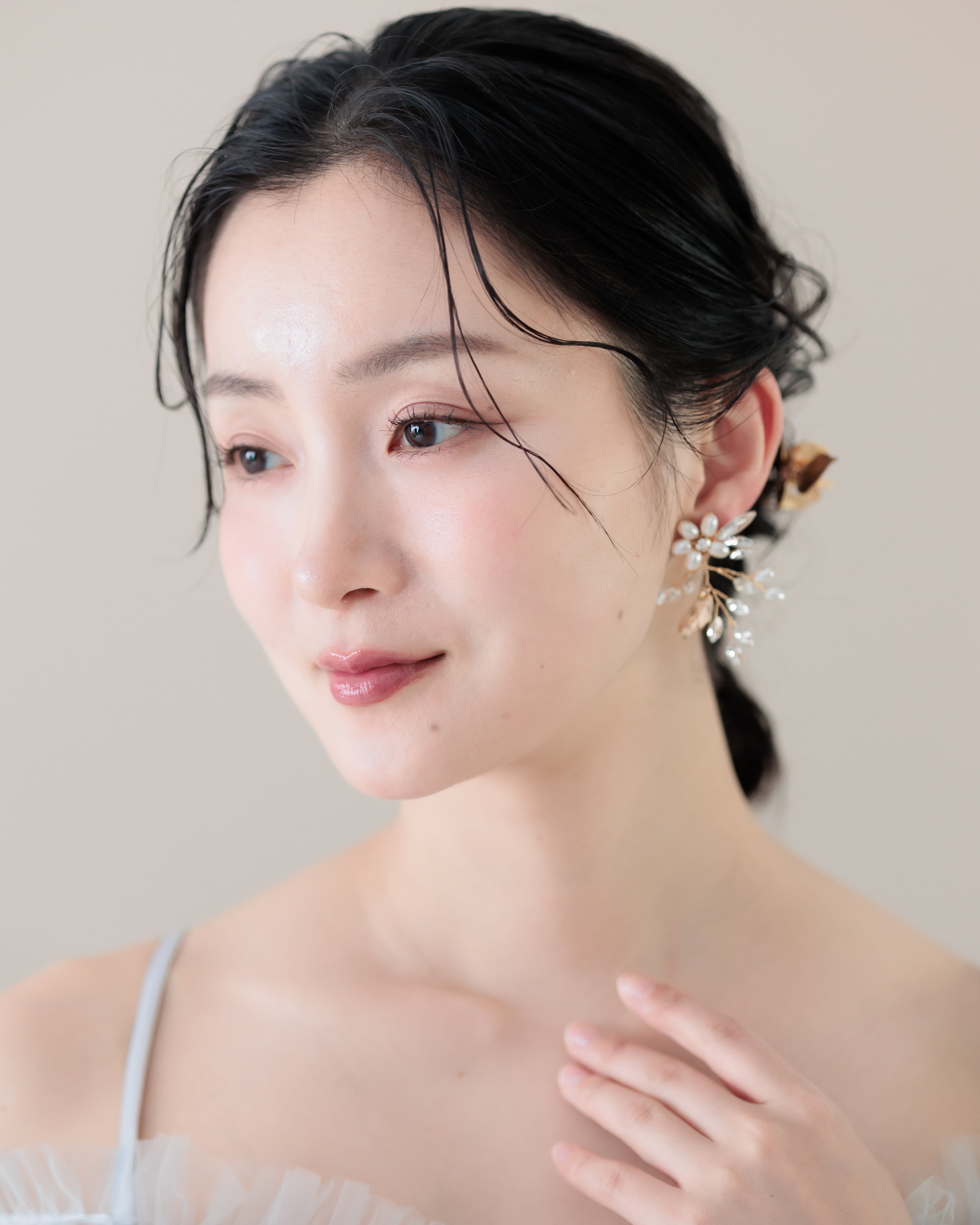 愛らしい雰囲気のパールのお花にゴールドのリーフがアクセントとなり、繊細ながらも程よく存在感を放つブライダルピアス。