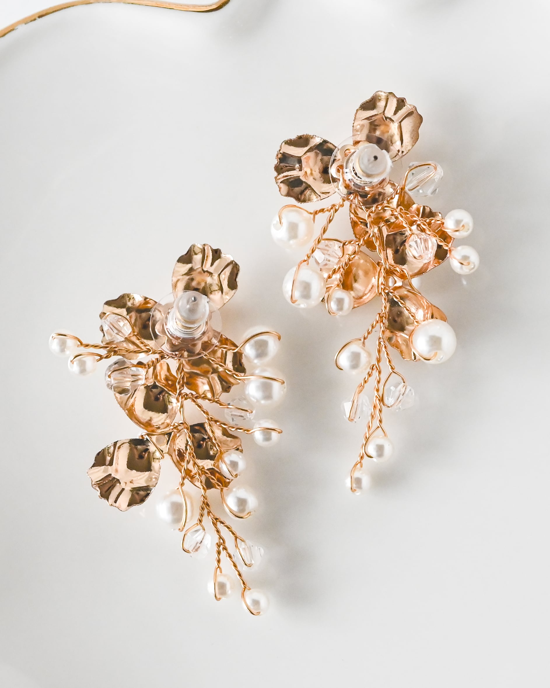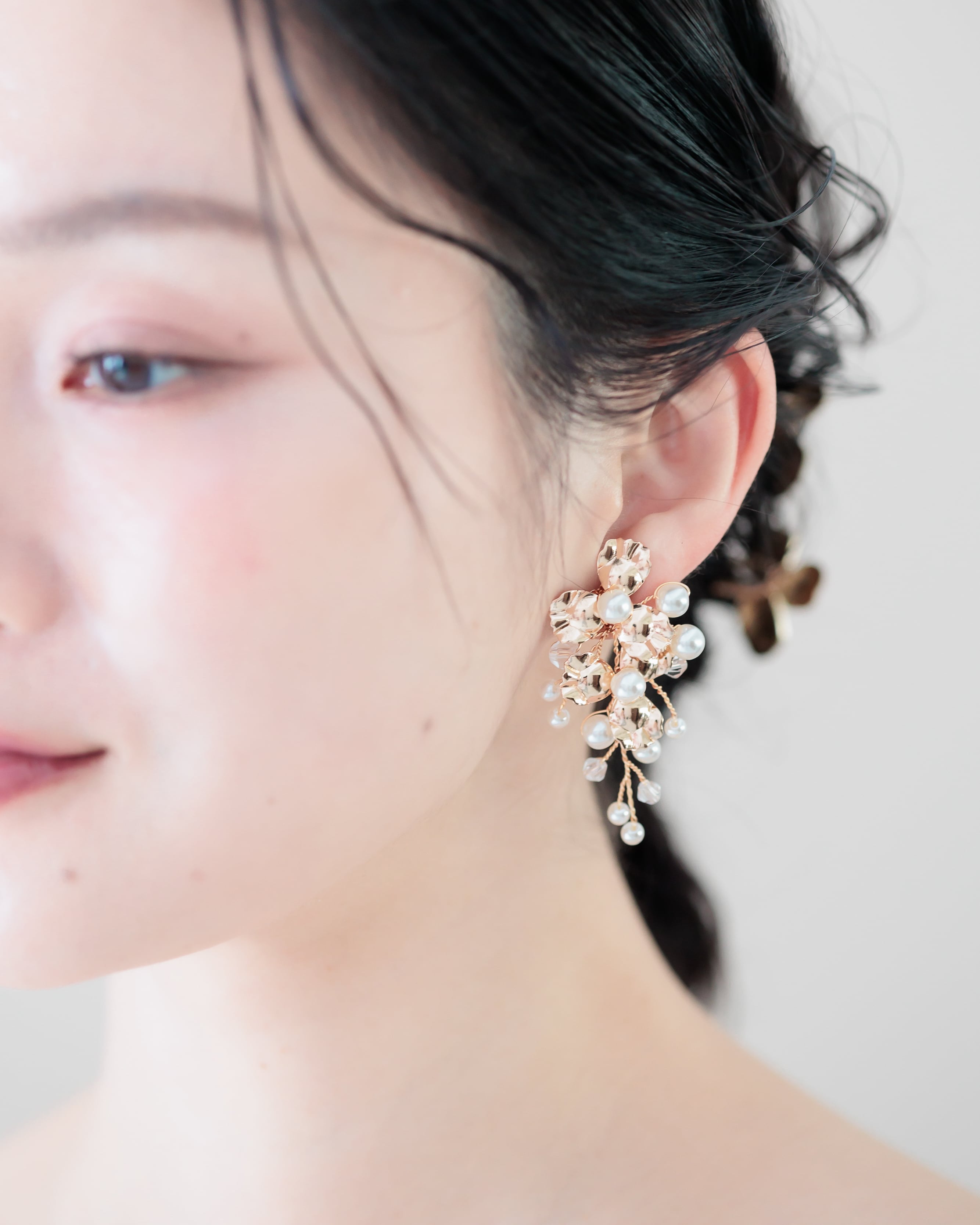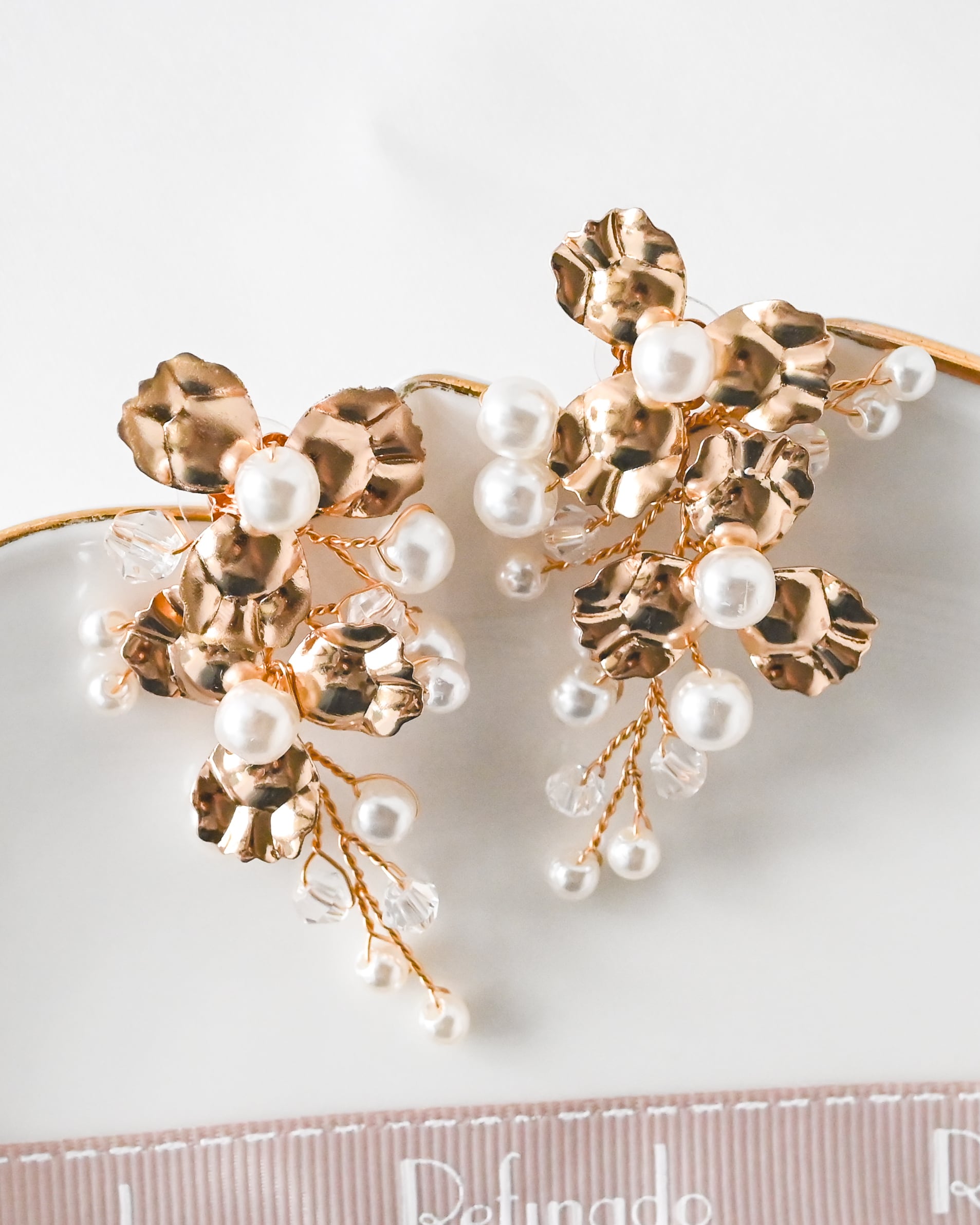 艶感あるブロンズゴールドのお花とパールが織りなす繊細なディテールと上品な輝きが魅力のブライダルピアス。