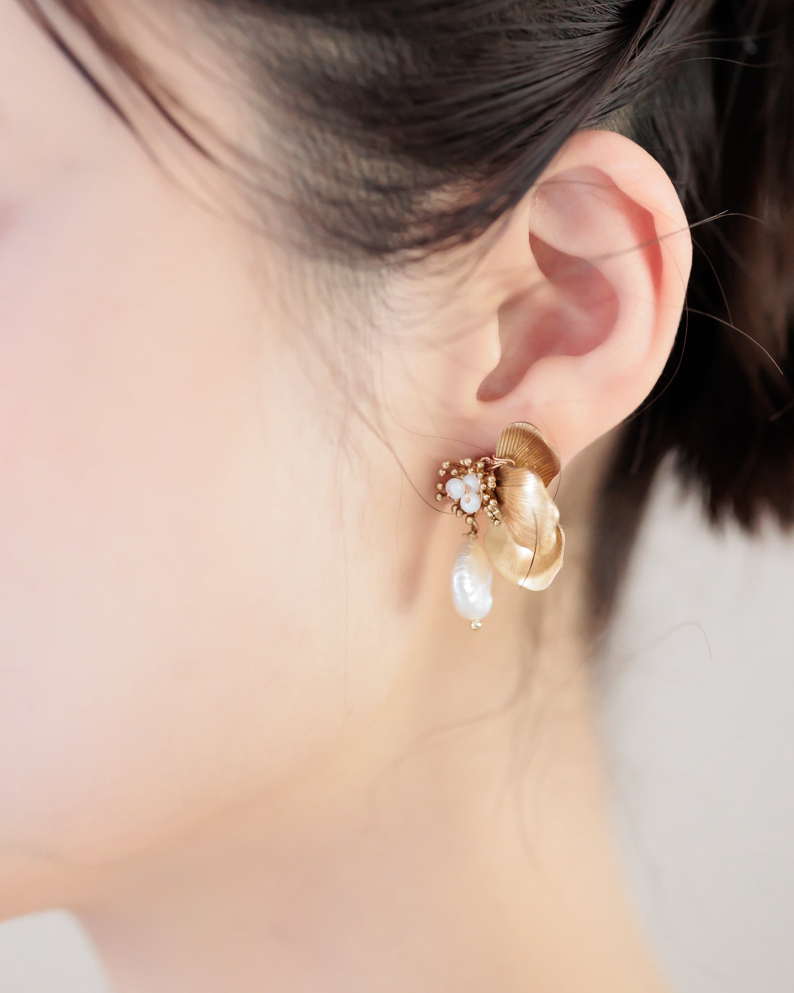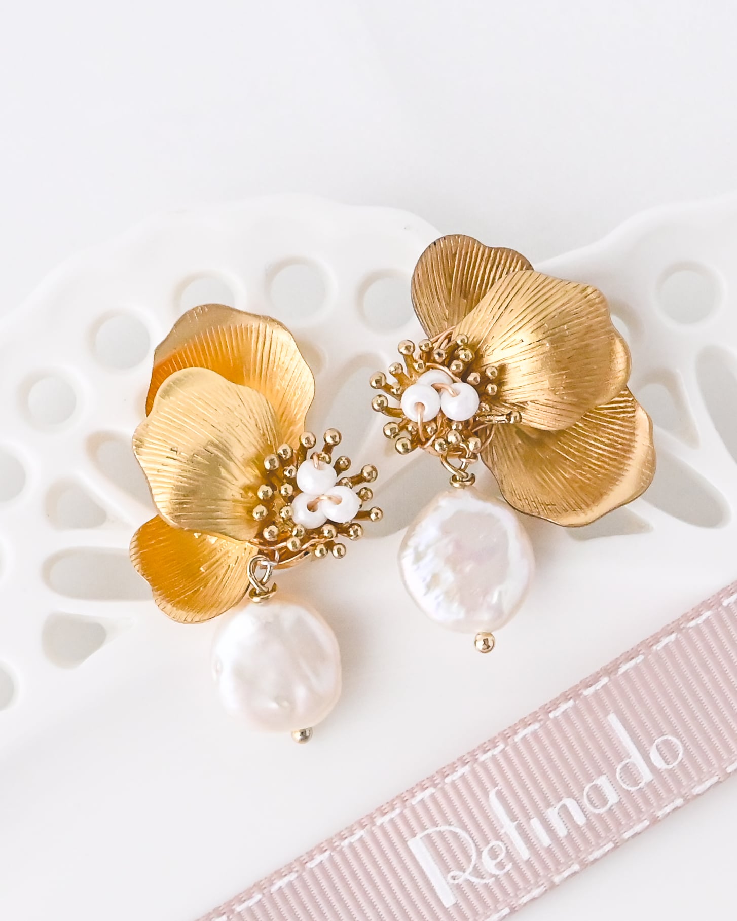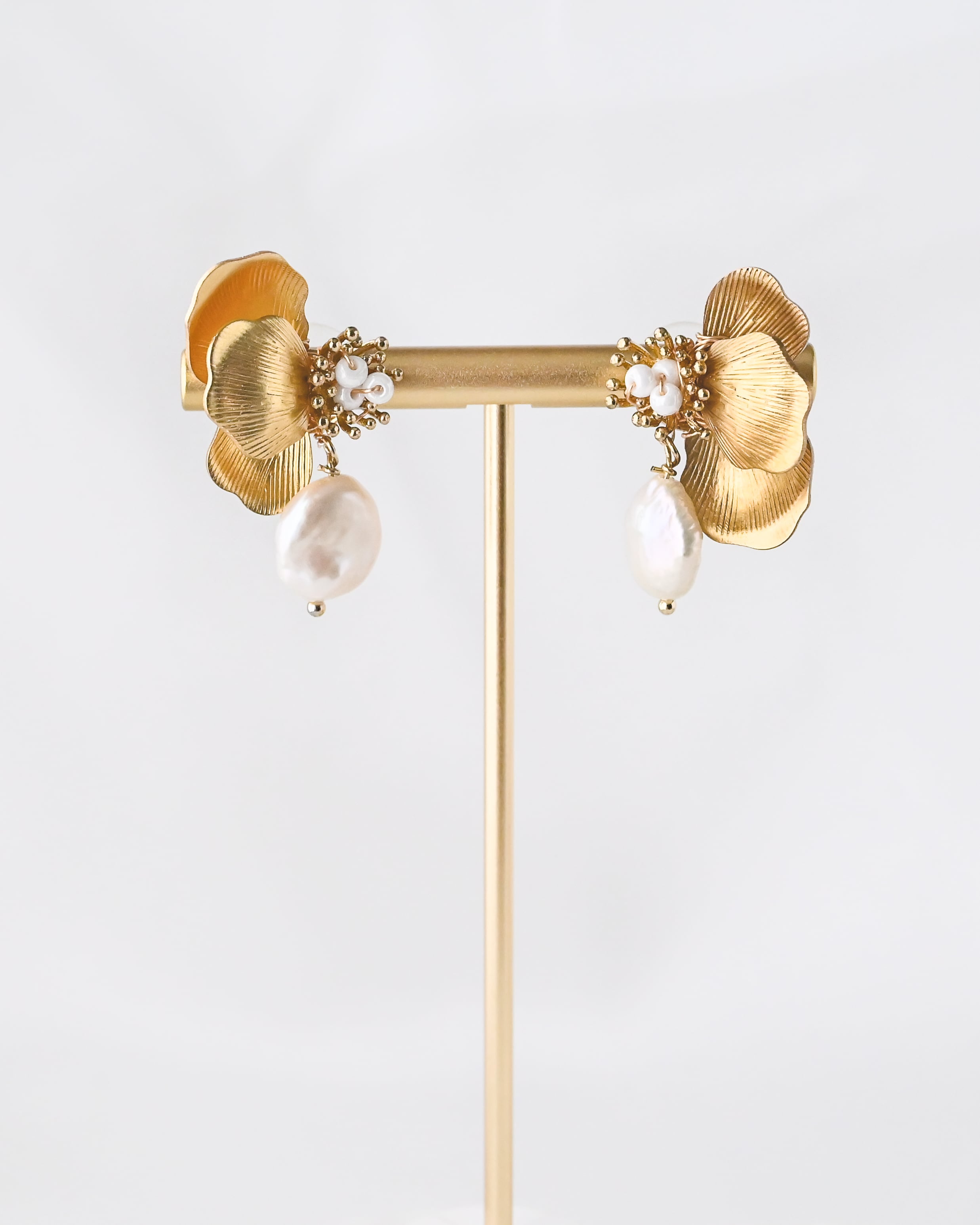 華やかなゴールドフラワーに、大粒のバロックパールを合わせたブライダルピアス。