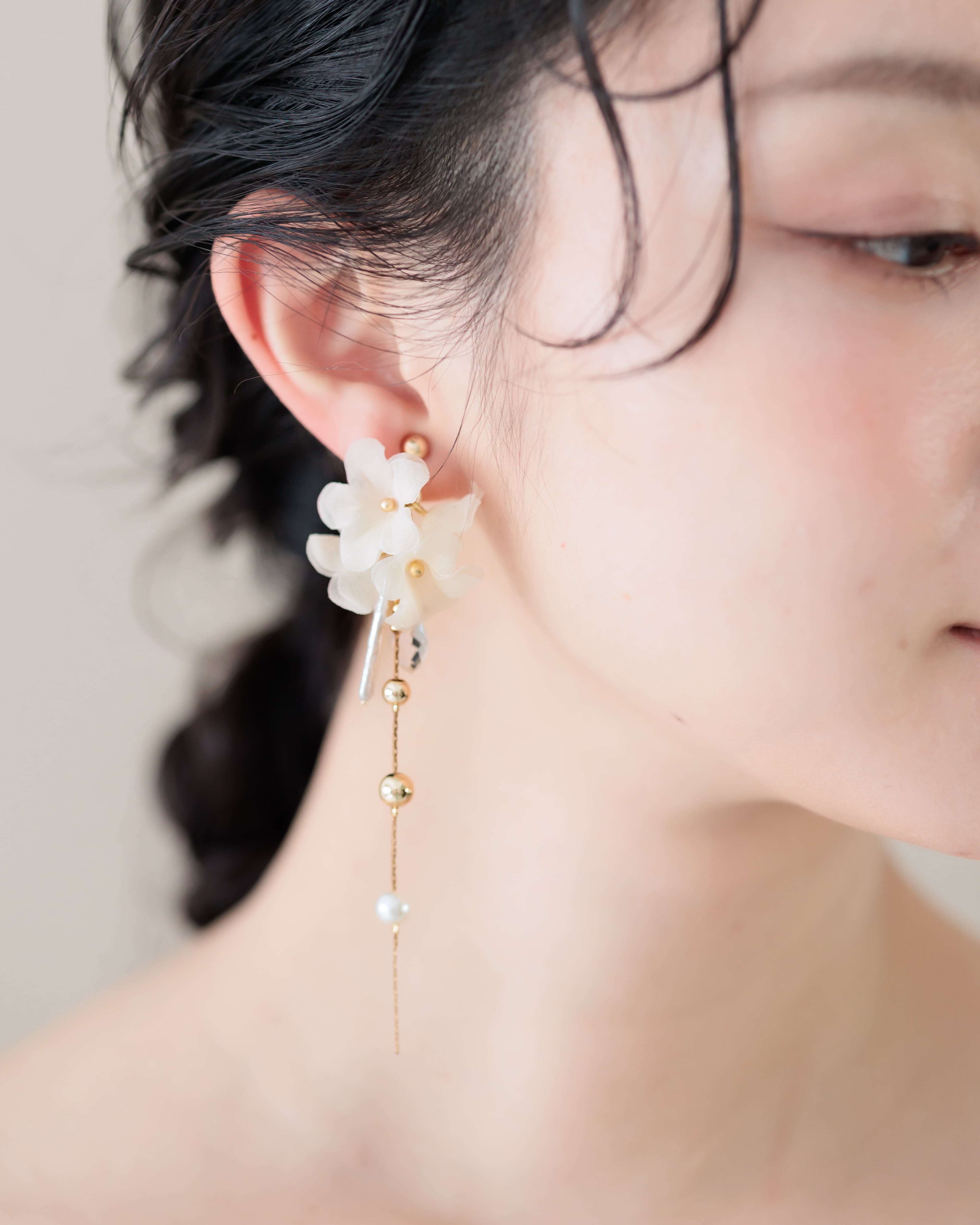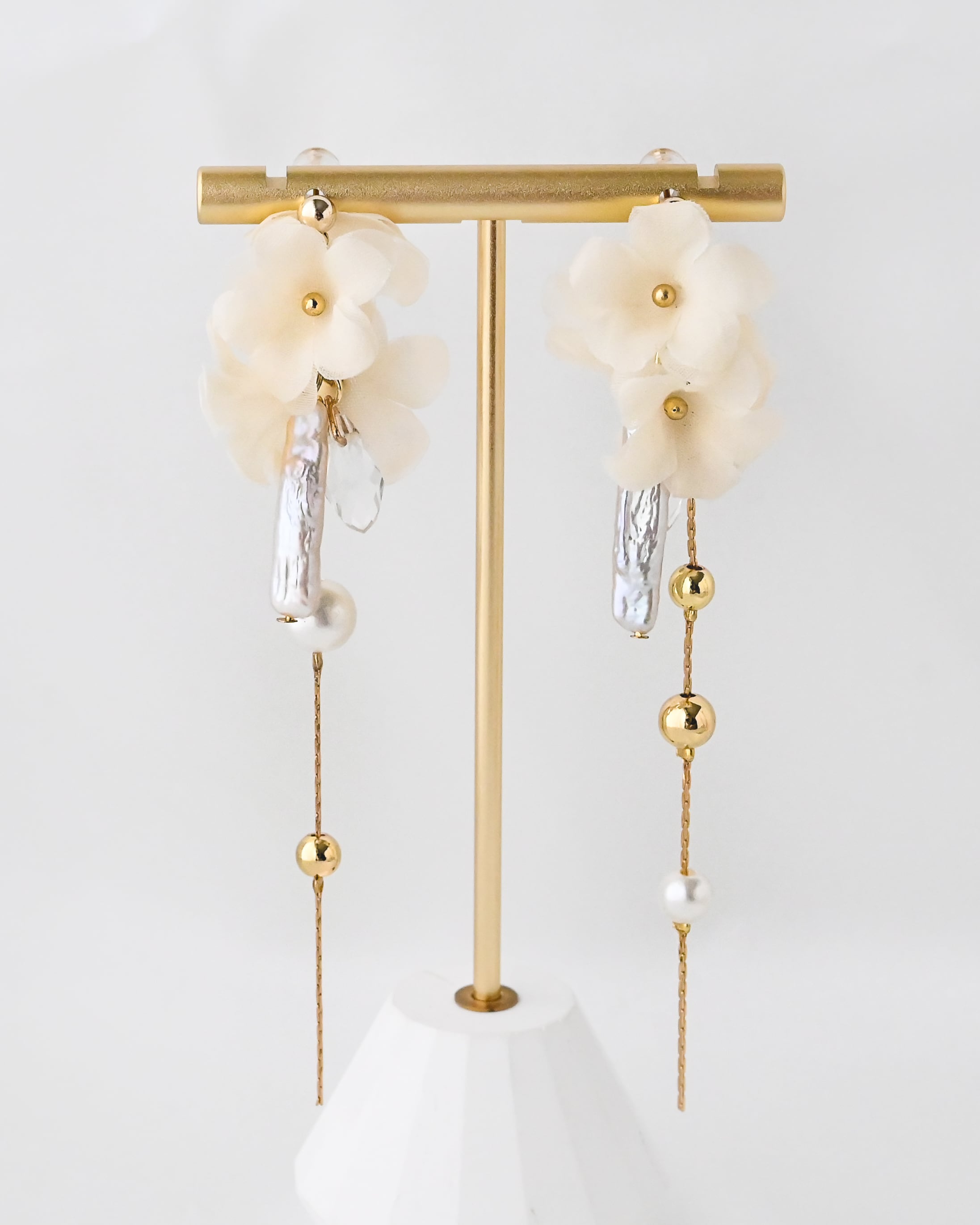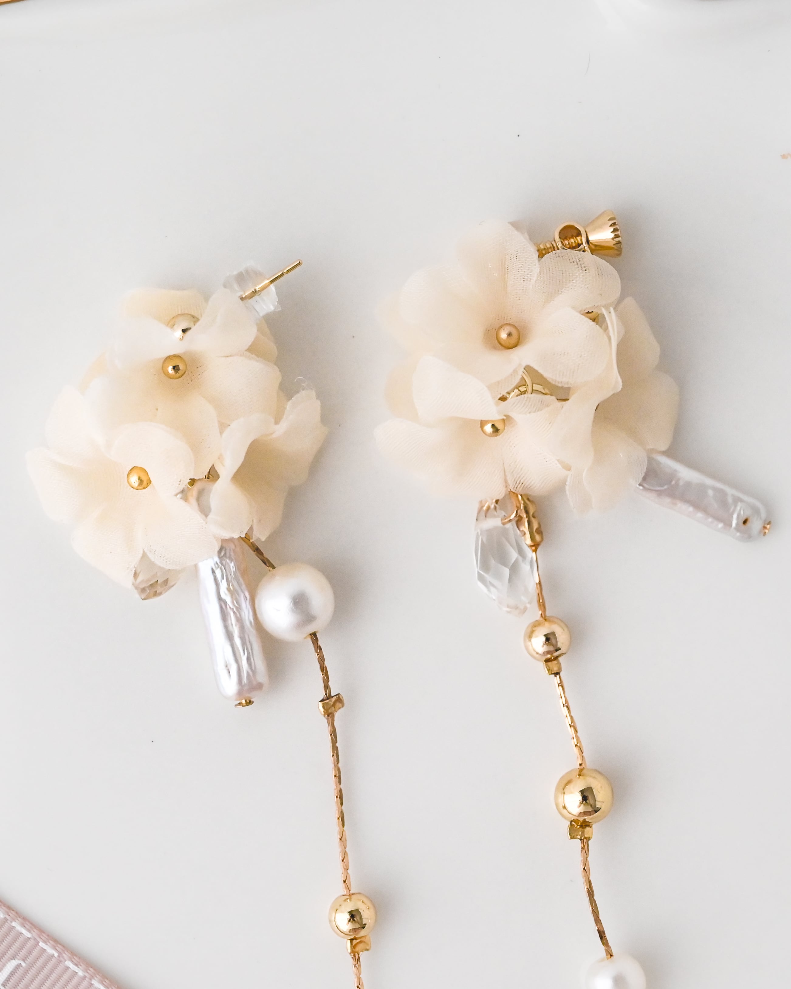 ふんわりと重なり合う柔らかなお花が可憐に咲き誇る、優美なデザインのピアス/イヤリング。