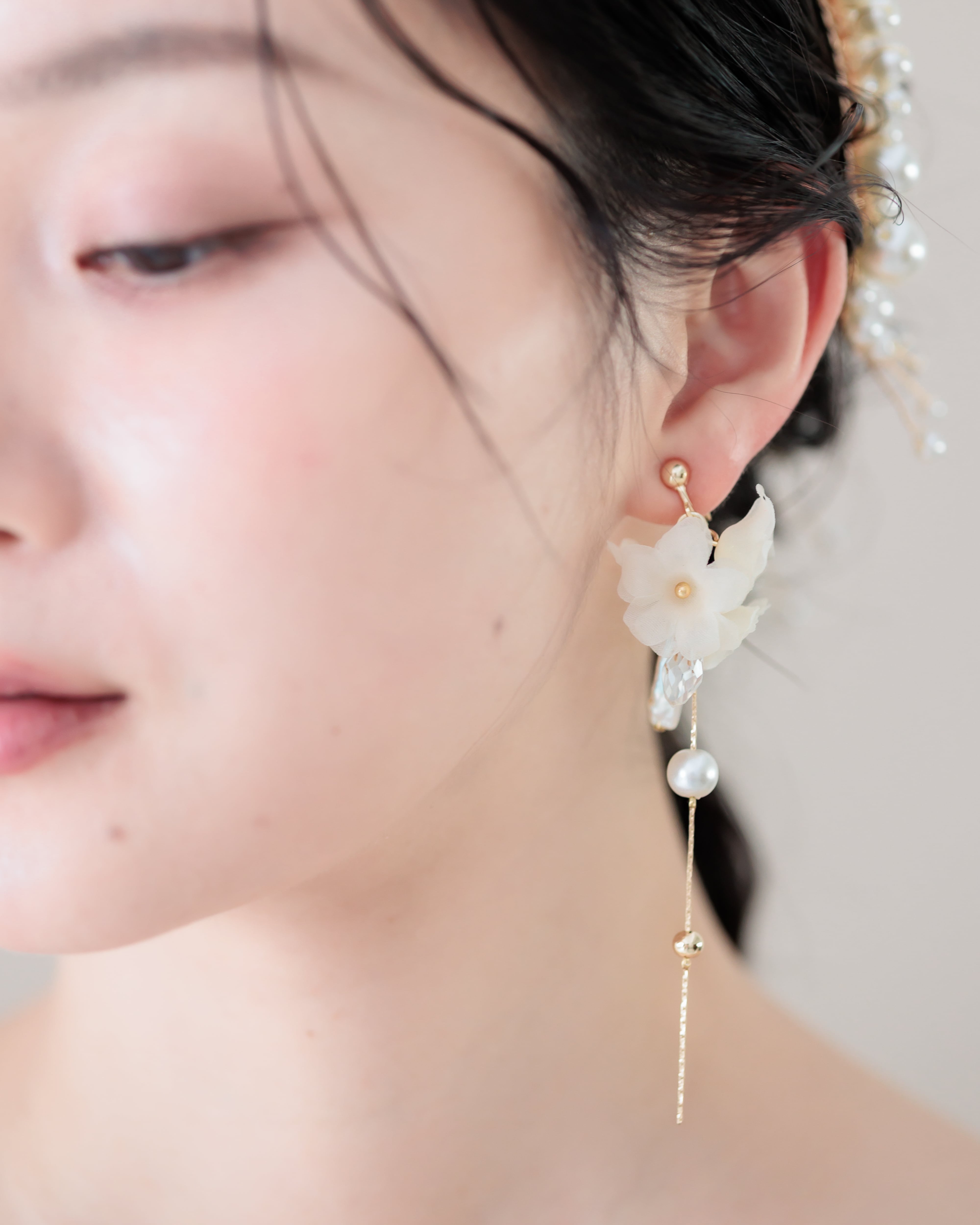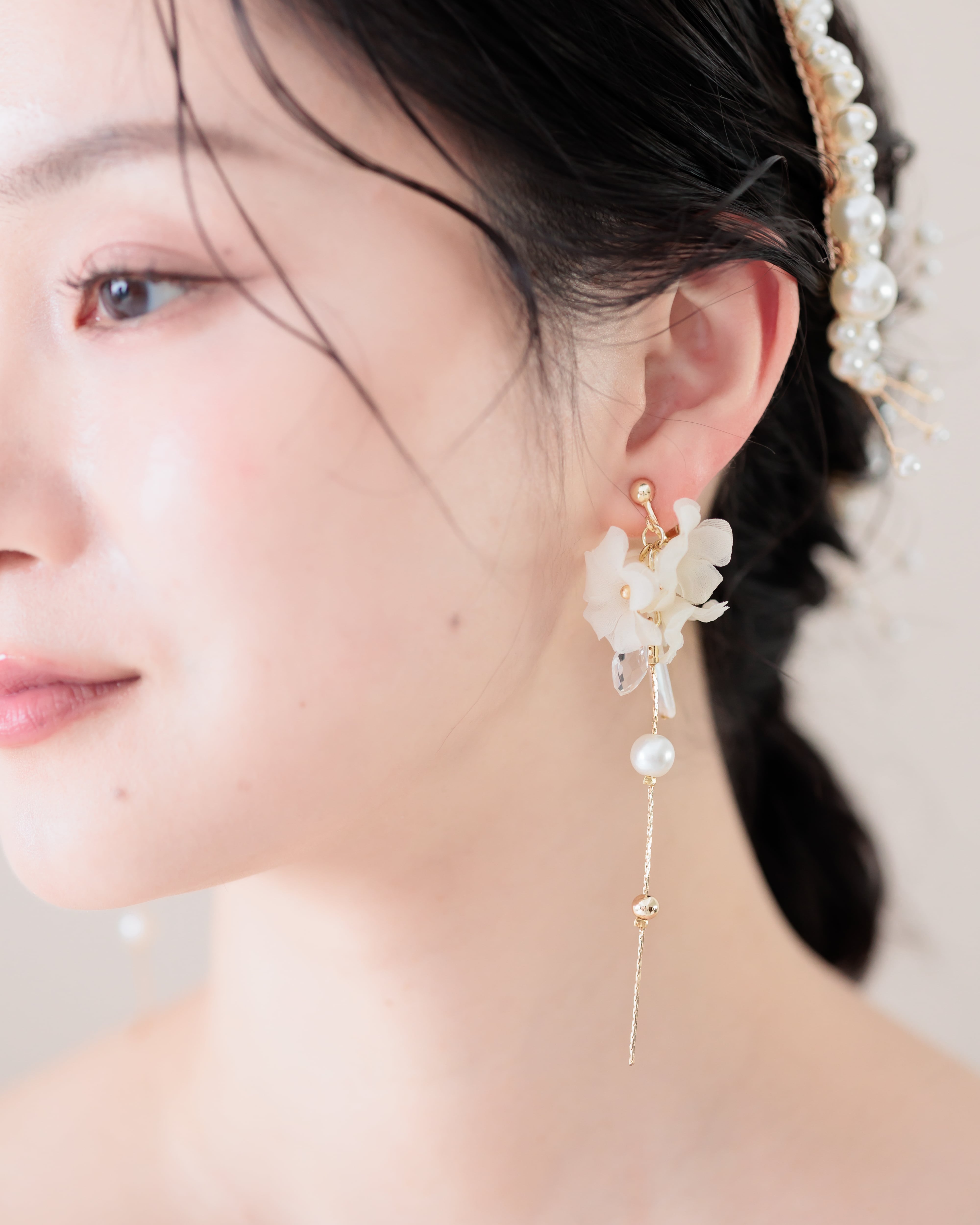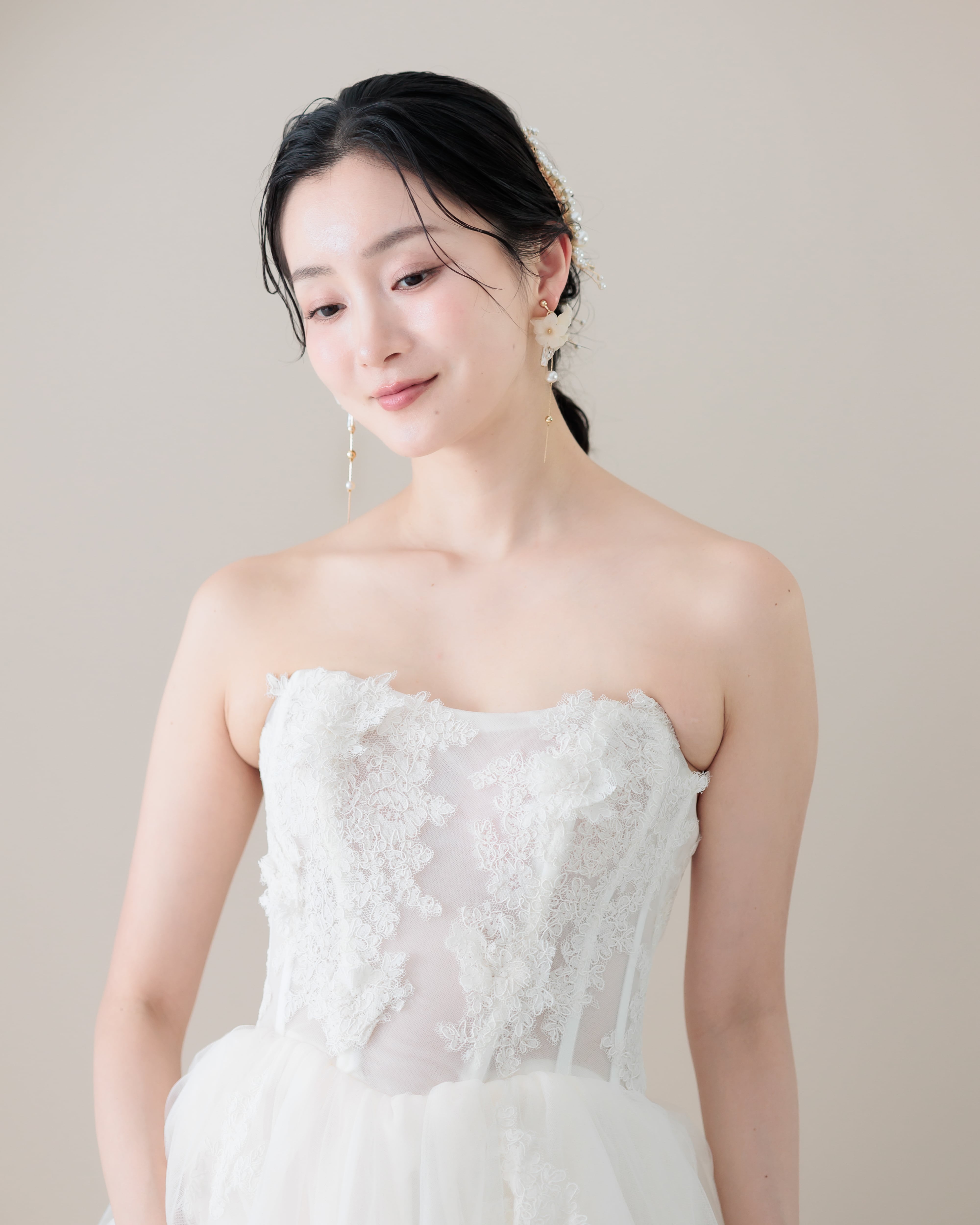 花嫁さまの清楚さと華やかさを両立させるデザインで、ウェディングドレスやカラードレスとの相性も抜群。特別な一日をよりドラマティックに輝かせてくれるアクセサリーです。