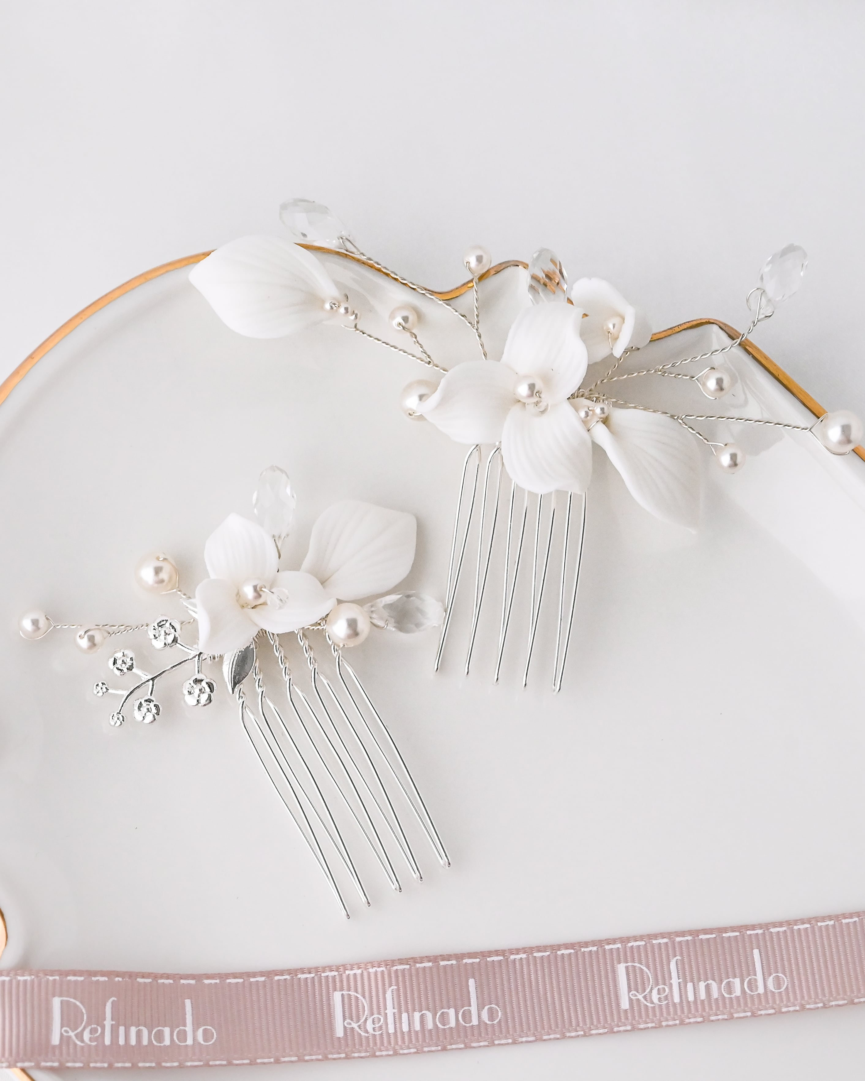 マットな質感を持つセラミックのお花は、繊細で可憐な雰囲気を漂わせ、中央に添えられたパールが上品な輝きを添えます。さらにシルバーリーフやビーズが光を受けて煌めき、花嫁さまの髪を華やかに彩ります。