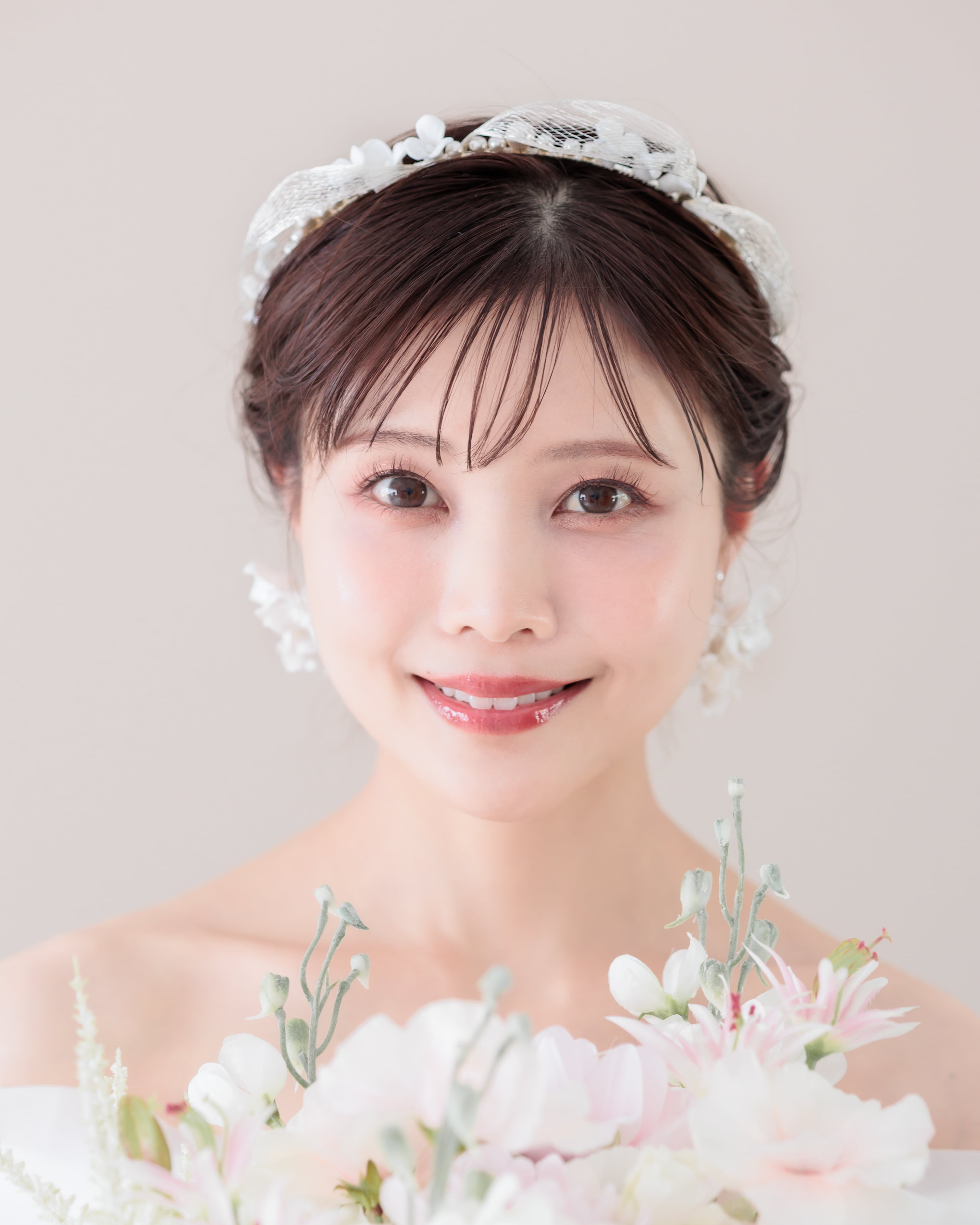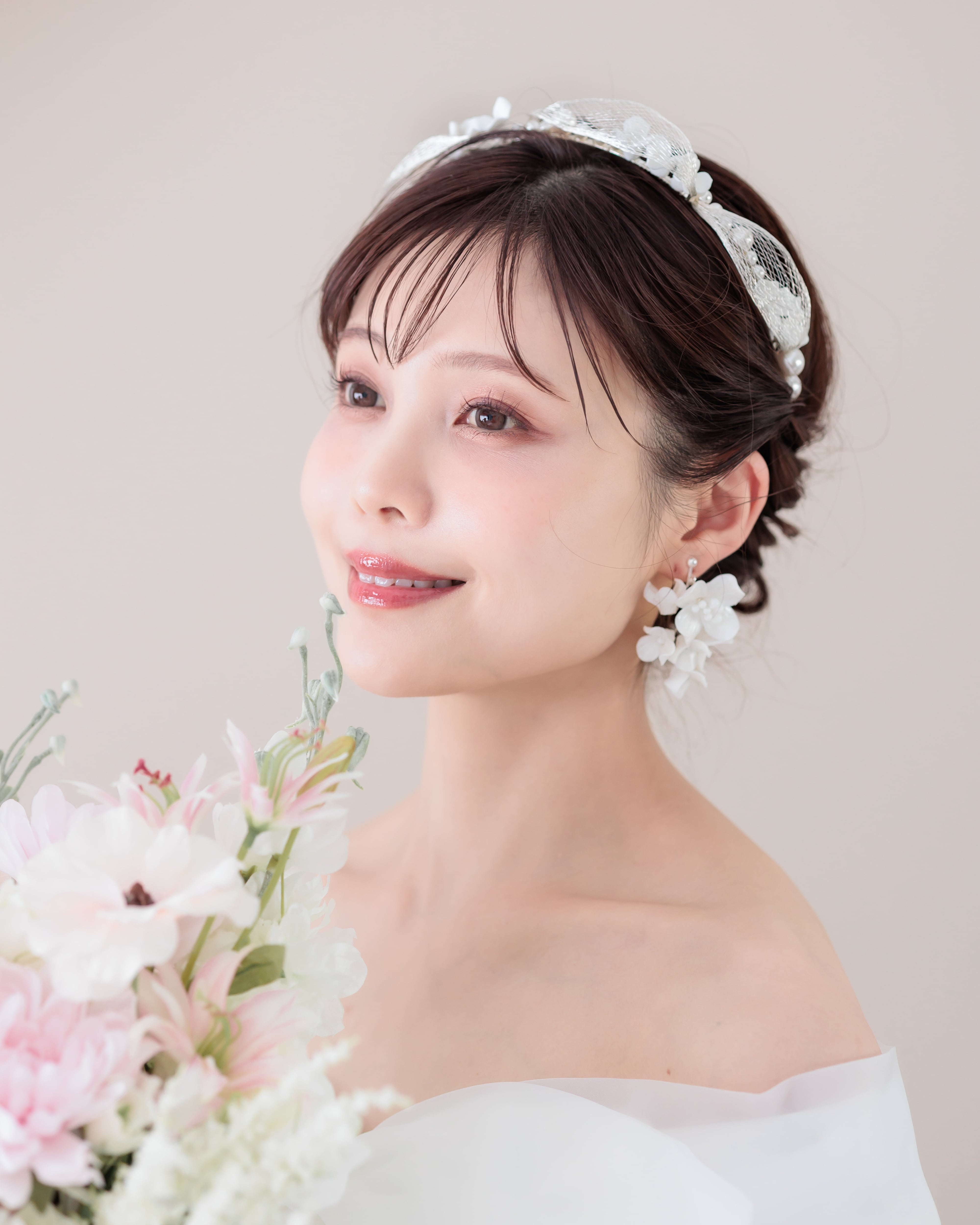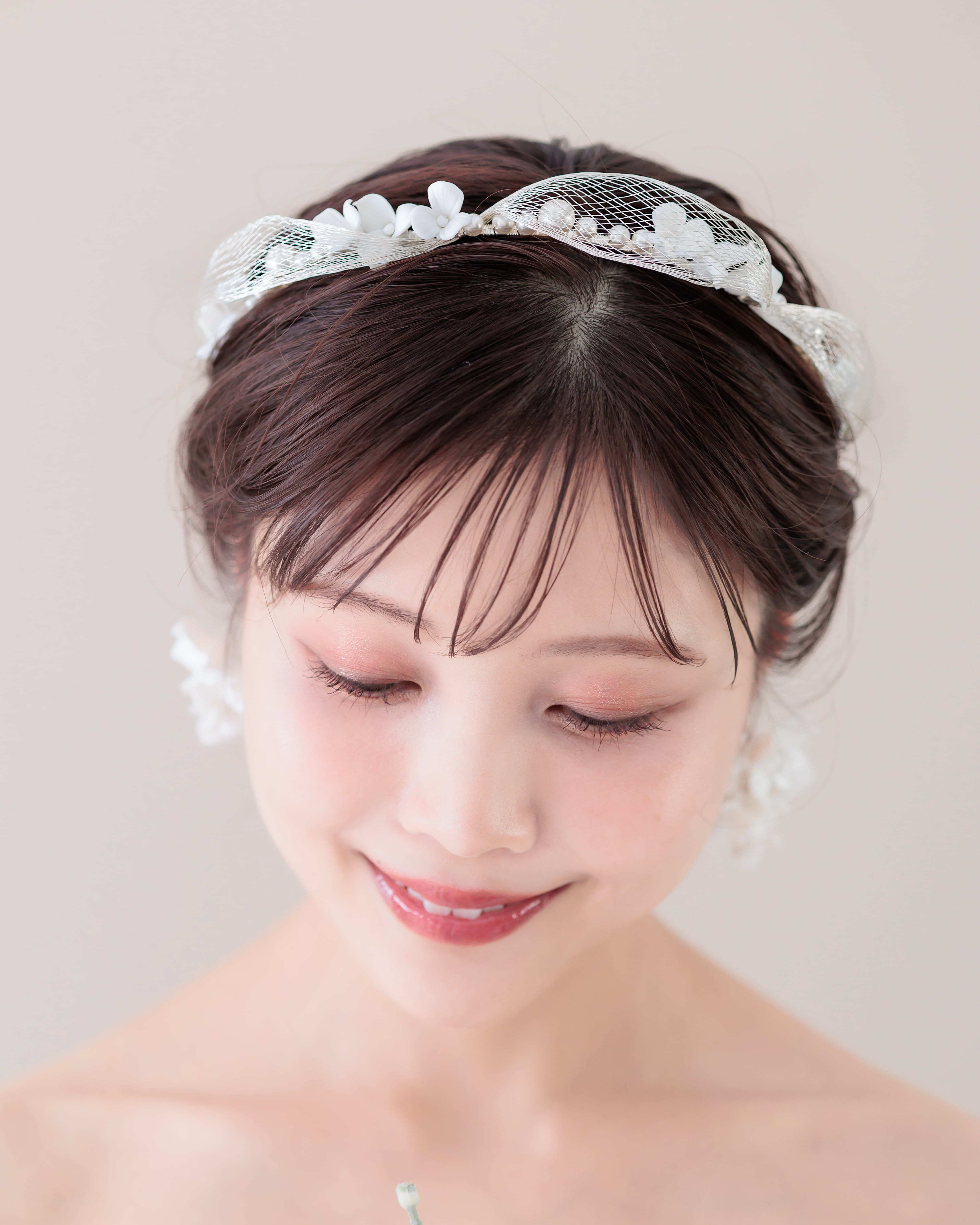 透け感のあるメッシュは光を優しく纏い、立体的に添えられたセラミックフラワーが可憐なアクセントに。小花の清楚な白がパールの艶めきと共鳴し、純真な花嫁さまを美しく引き立てます。