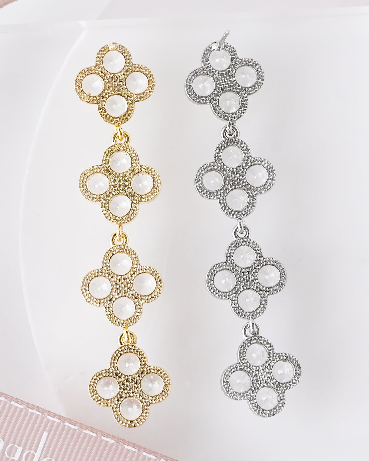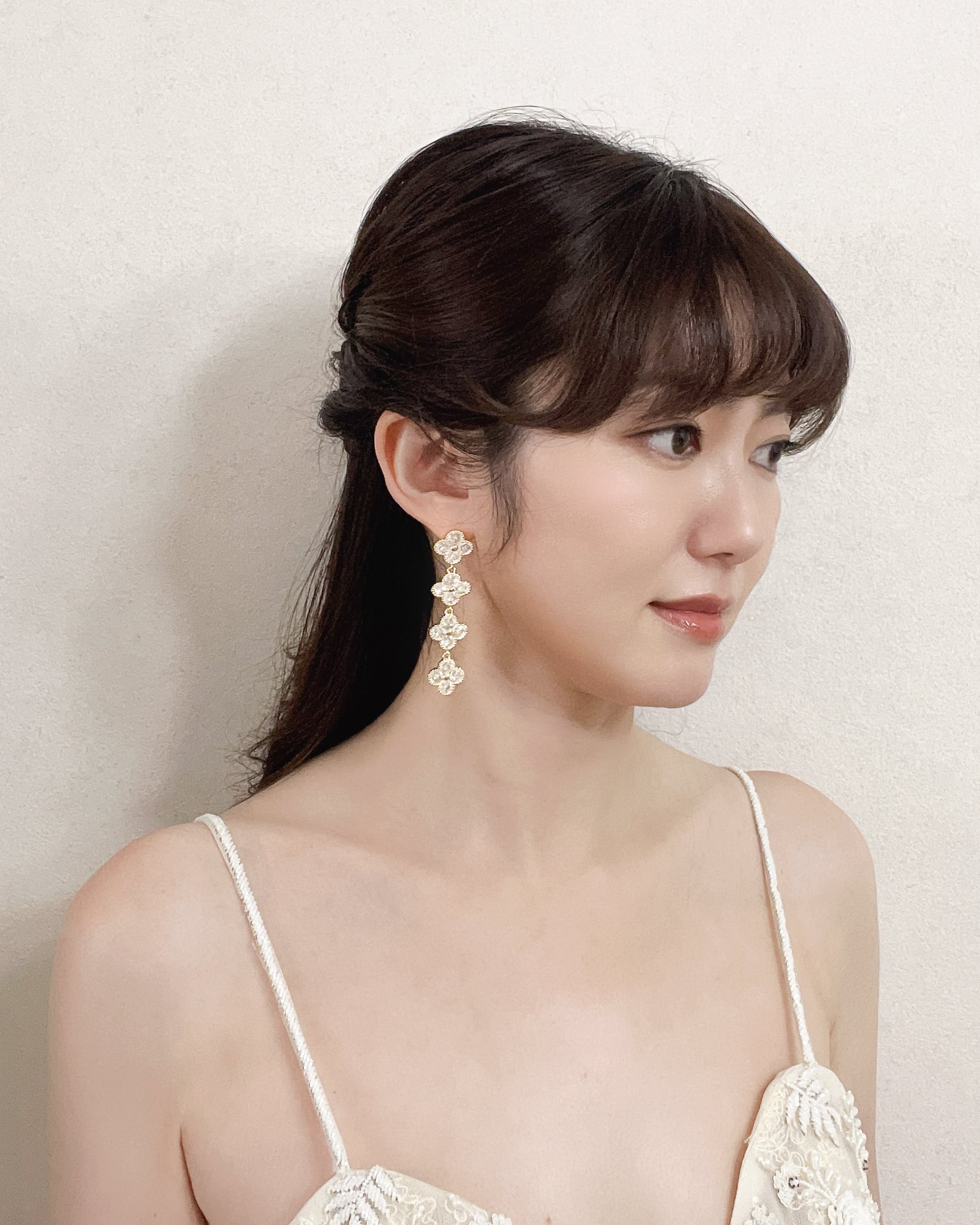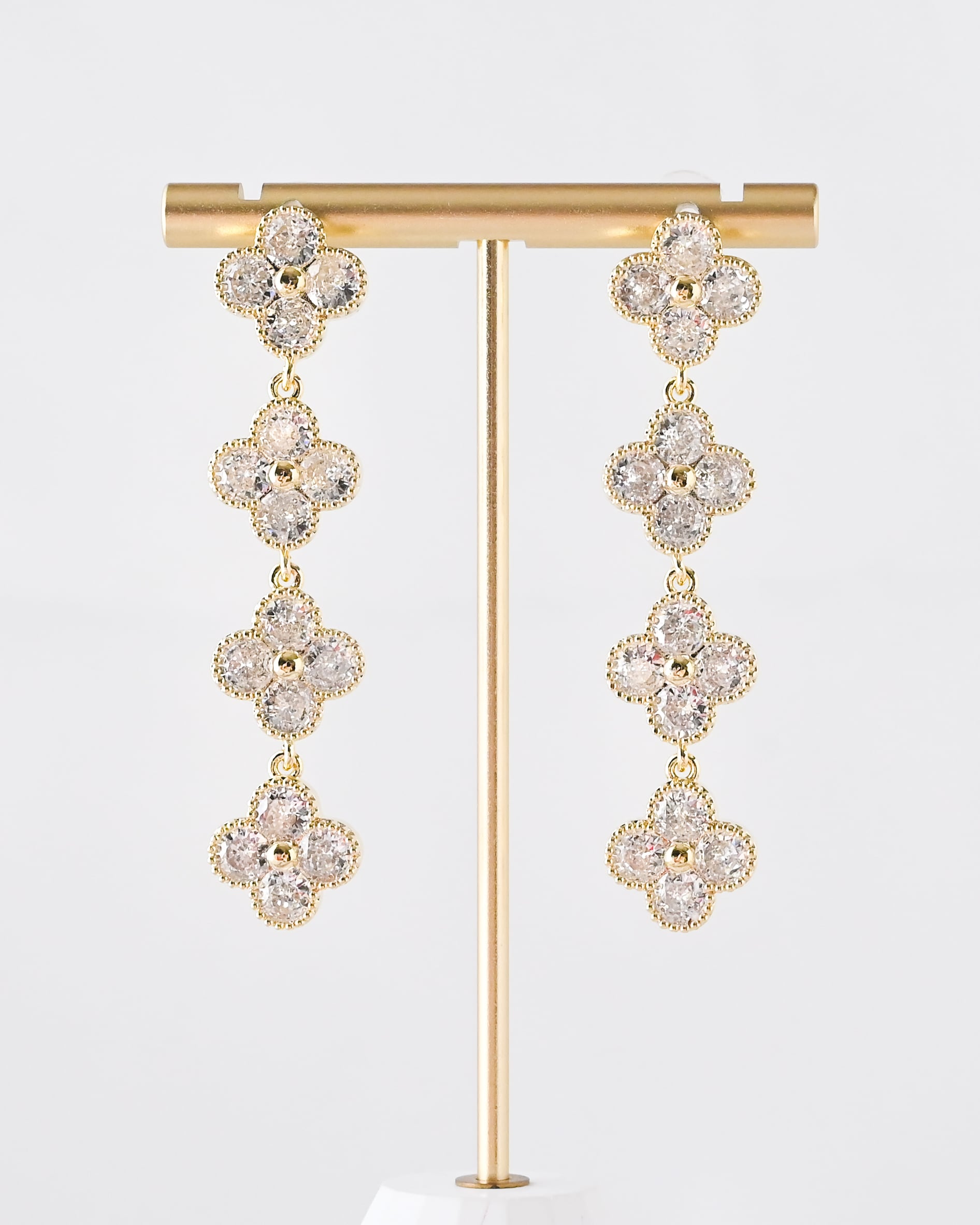 上品なきらめきで花嫁さまを彩る、クアトロフラワーモチーフのロングピアス。