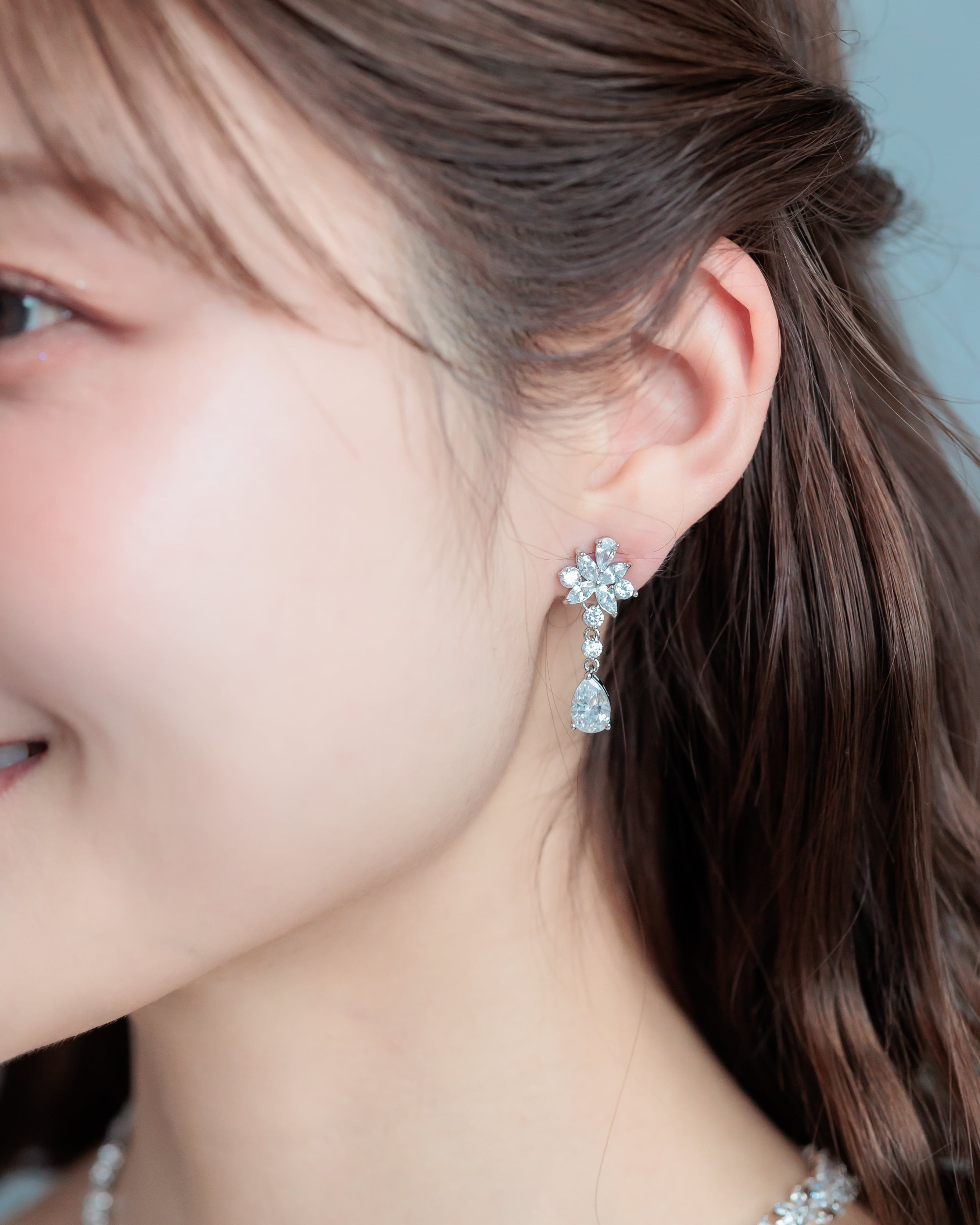繊細なフラワーモチーフに煌めくストーンを敷き詰め、揺れるティアドロップカットのストーンをあしらったブライダルピアス/イヤリング。