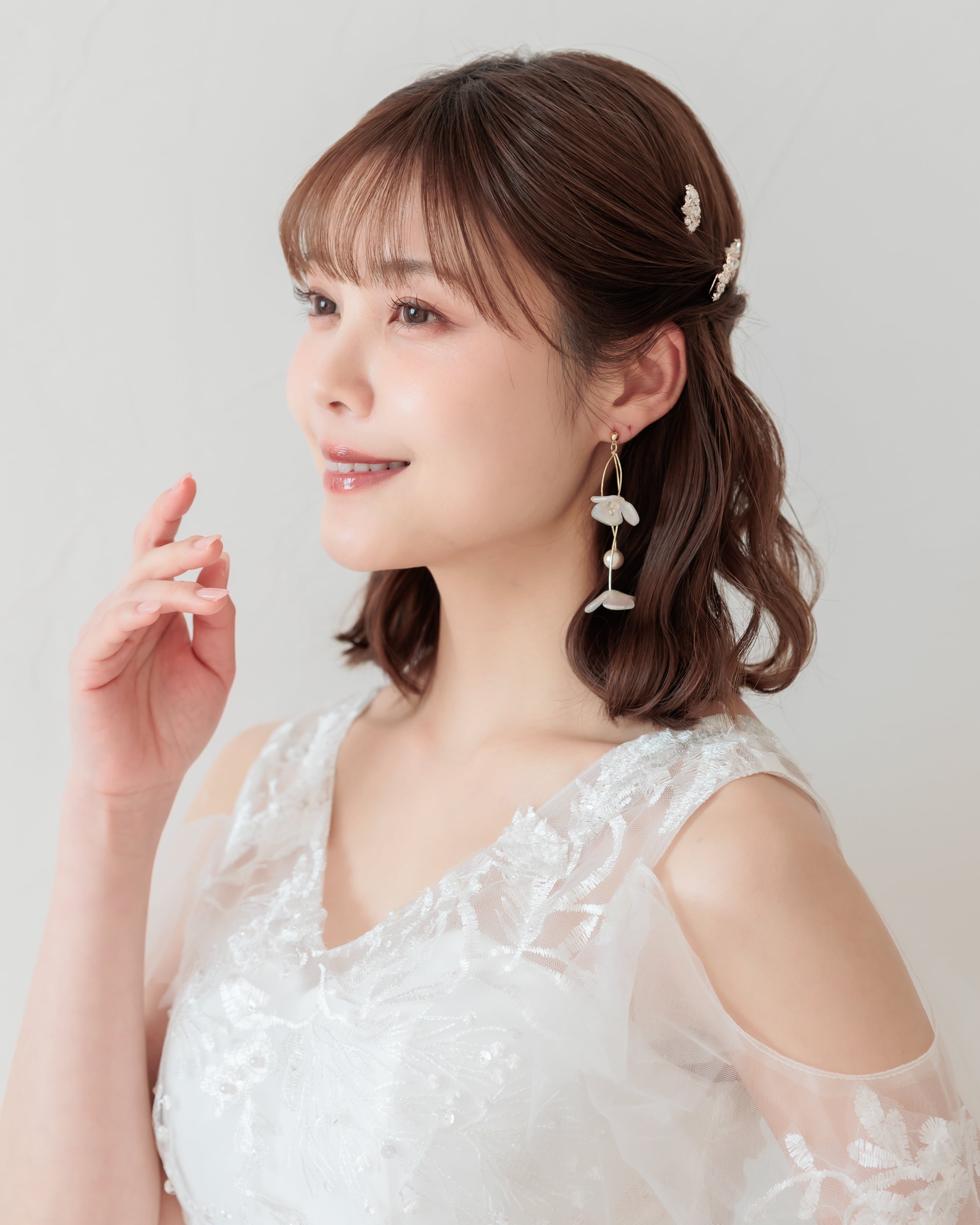 挙式や披露宴、前撮りはもちろん、ゲストとしてのお呼ばれや特別なお食事会などの普段使いにもおすすめ。華やかさと軽やかさを兼ね備えたデザインで、日常から特別な日まで幅広く活躍してくれるアクセサリーです。