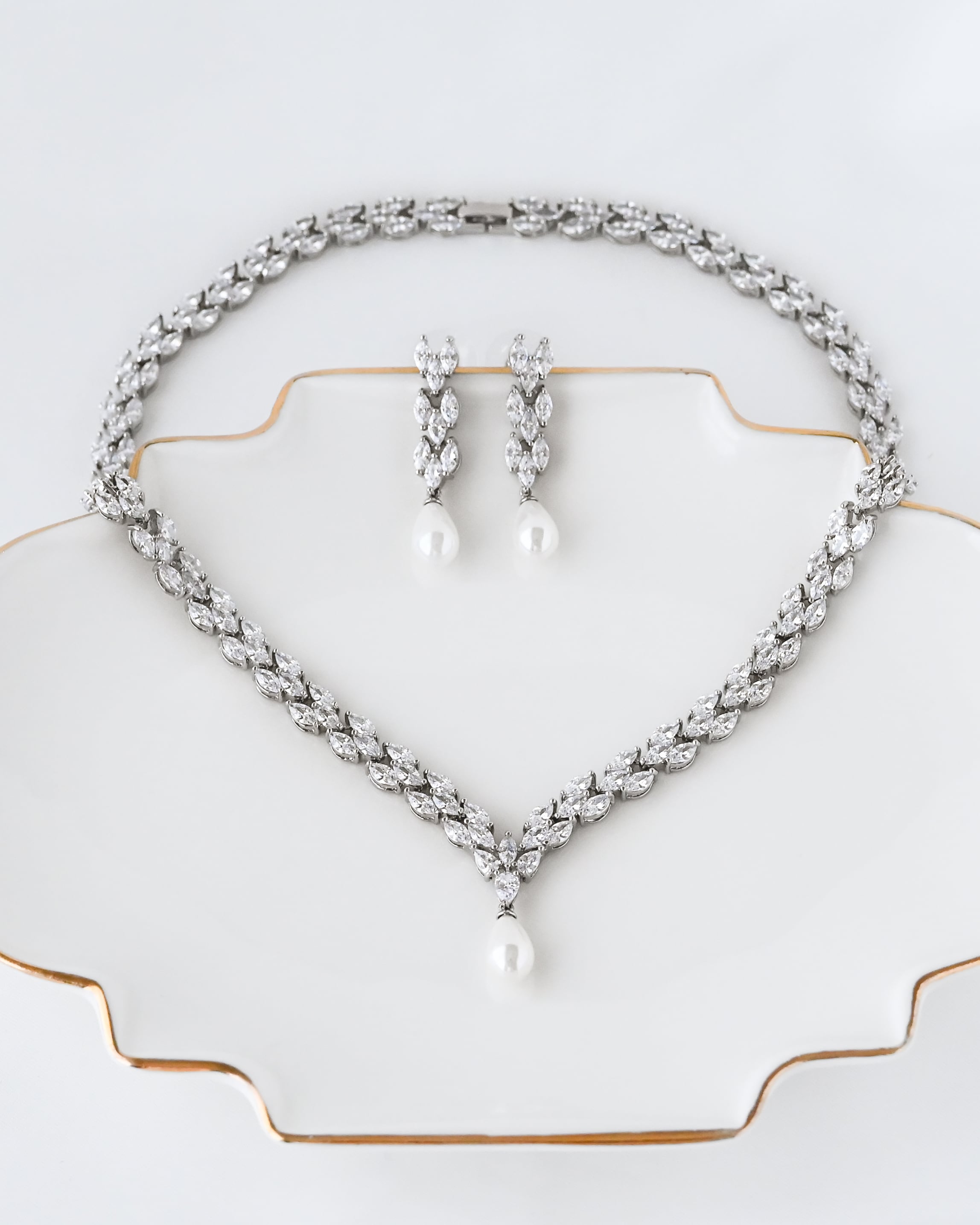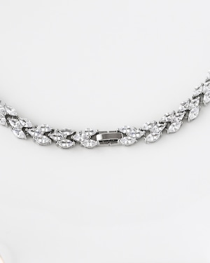 繊細に編み込まれたクリスタルが胸元を華やかに彩り、センターにあしらわれたティアドロップ型のパールが優雅なアクセントを添えます。