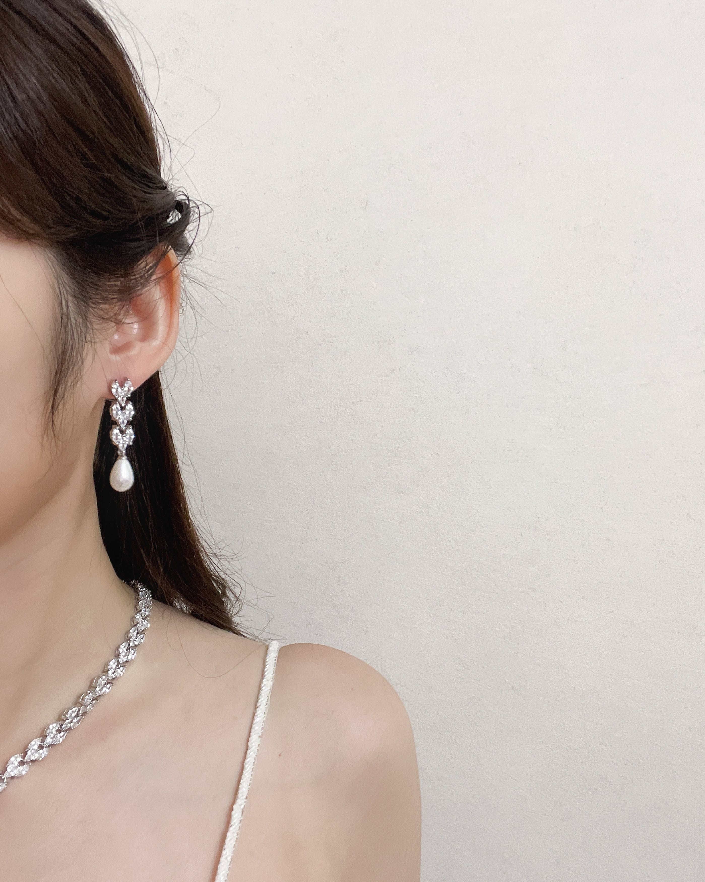 ピアスも同じデザインで揺れるパールを配し、統一感のあるスタイルに。