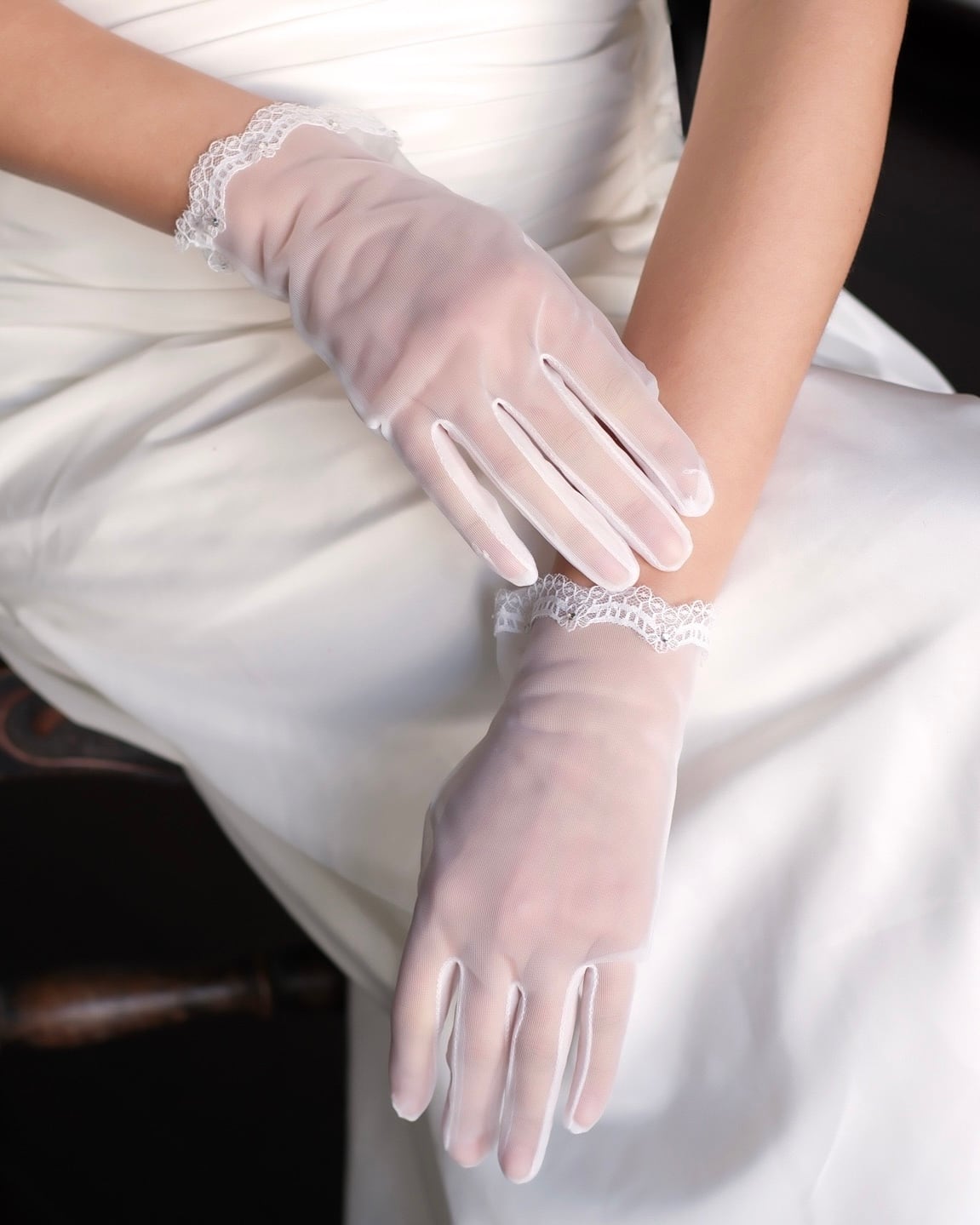 繊細なチュール素材で仕立てられたショート丈のブライダルグローブ。手首部分には上品なレースをあしらい、その上に小さなラインストーンを散りばめることで、手元にさりげない輝きを添えます。透明感のあるシアーな質感が、花嫁さまの美しい指先をよりいっそう華奢に引き立て、ドレスとの相性も抜群です。