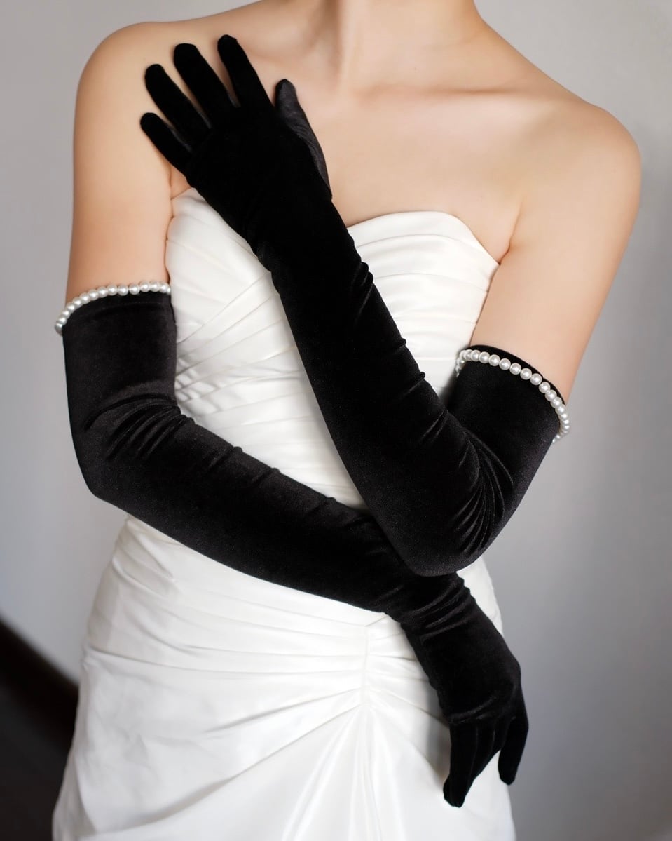 しっとりとした光沢感のあるブラックベロアが手元を美しく包み込み、上品でラグジュアリーな印象を演出します。腕周りに施された一連のパールがアクセントとなり、無駄のない直線的なパールの配置が、クラシカルで洗練された印象を与えます。ドレスのデザインを邪魔せず、引き締め役としても活躍。