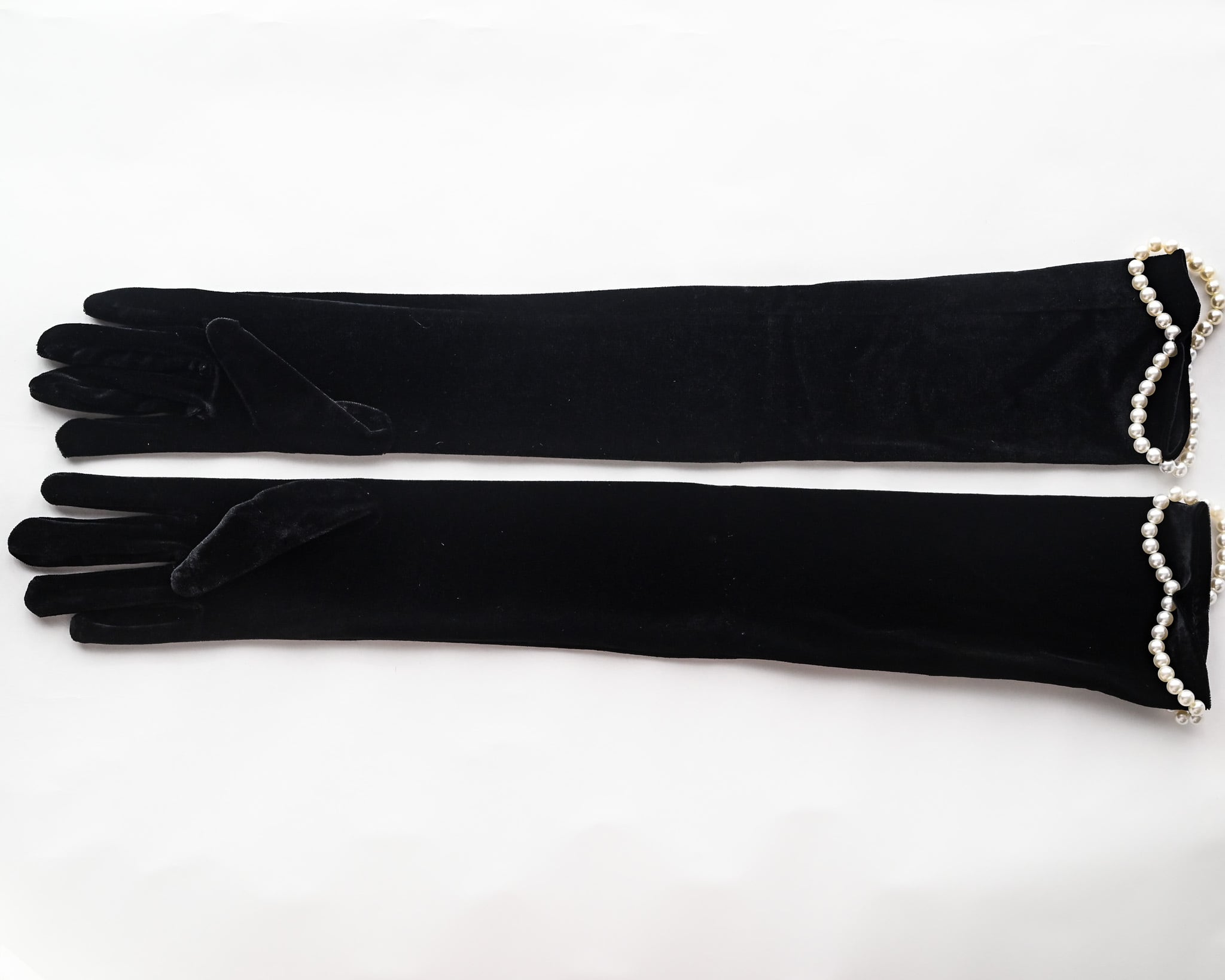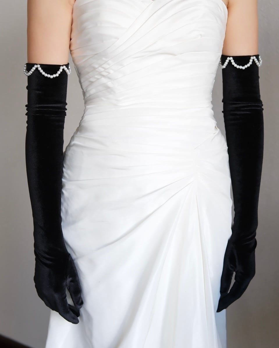 クラシカルなブラックベロアに、波打つように配置されたパールが華やかさを添えるロンググローブ。