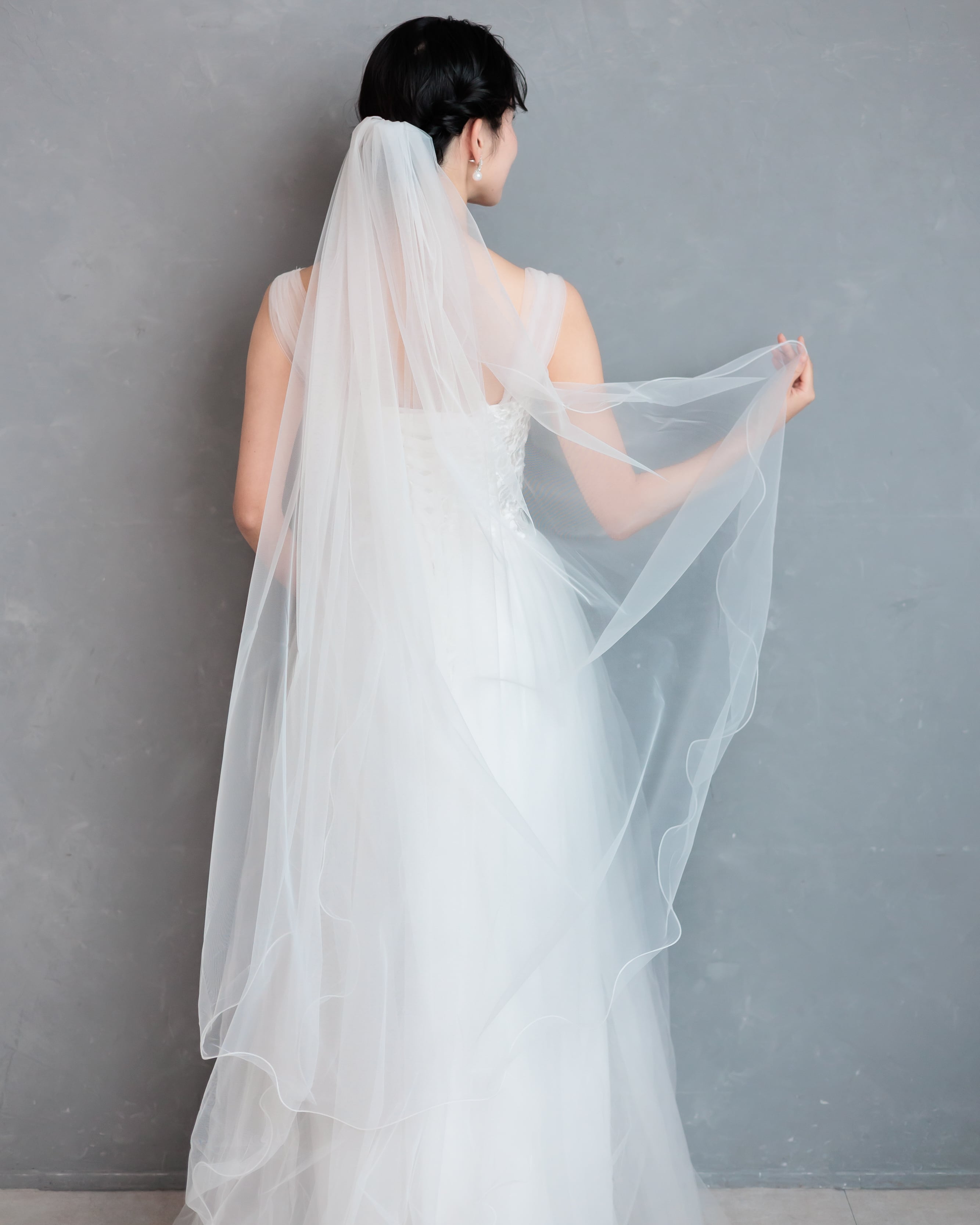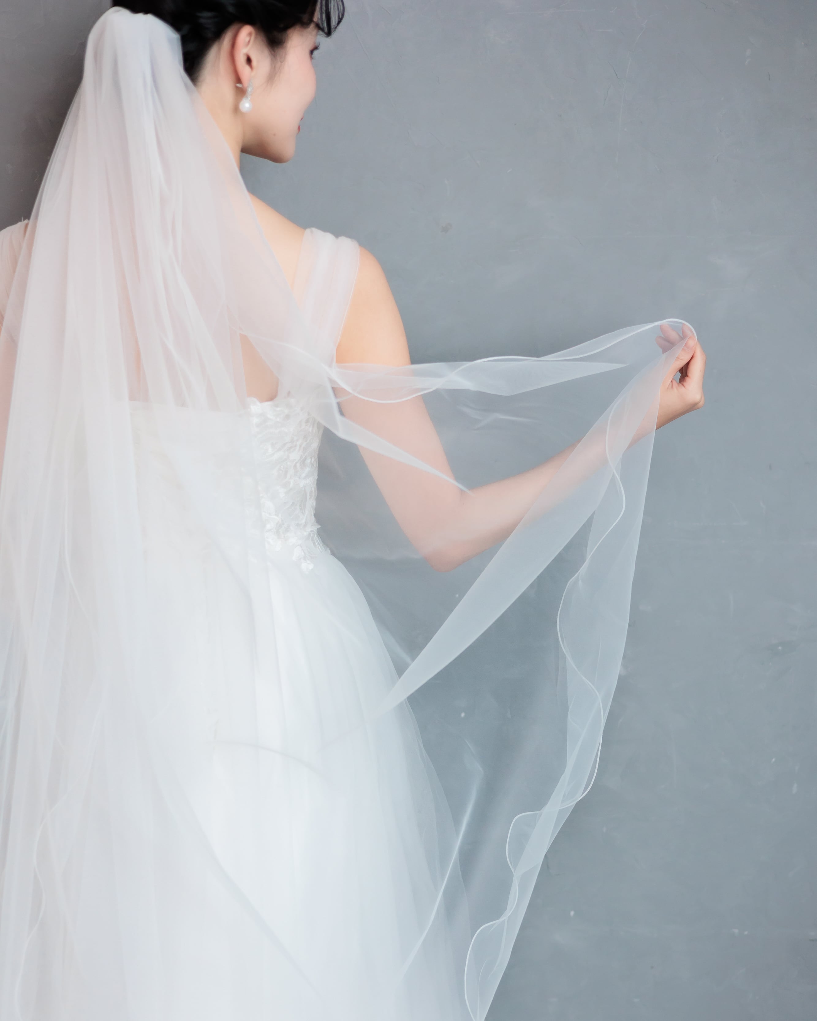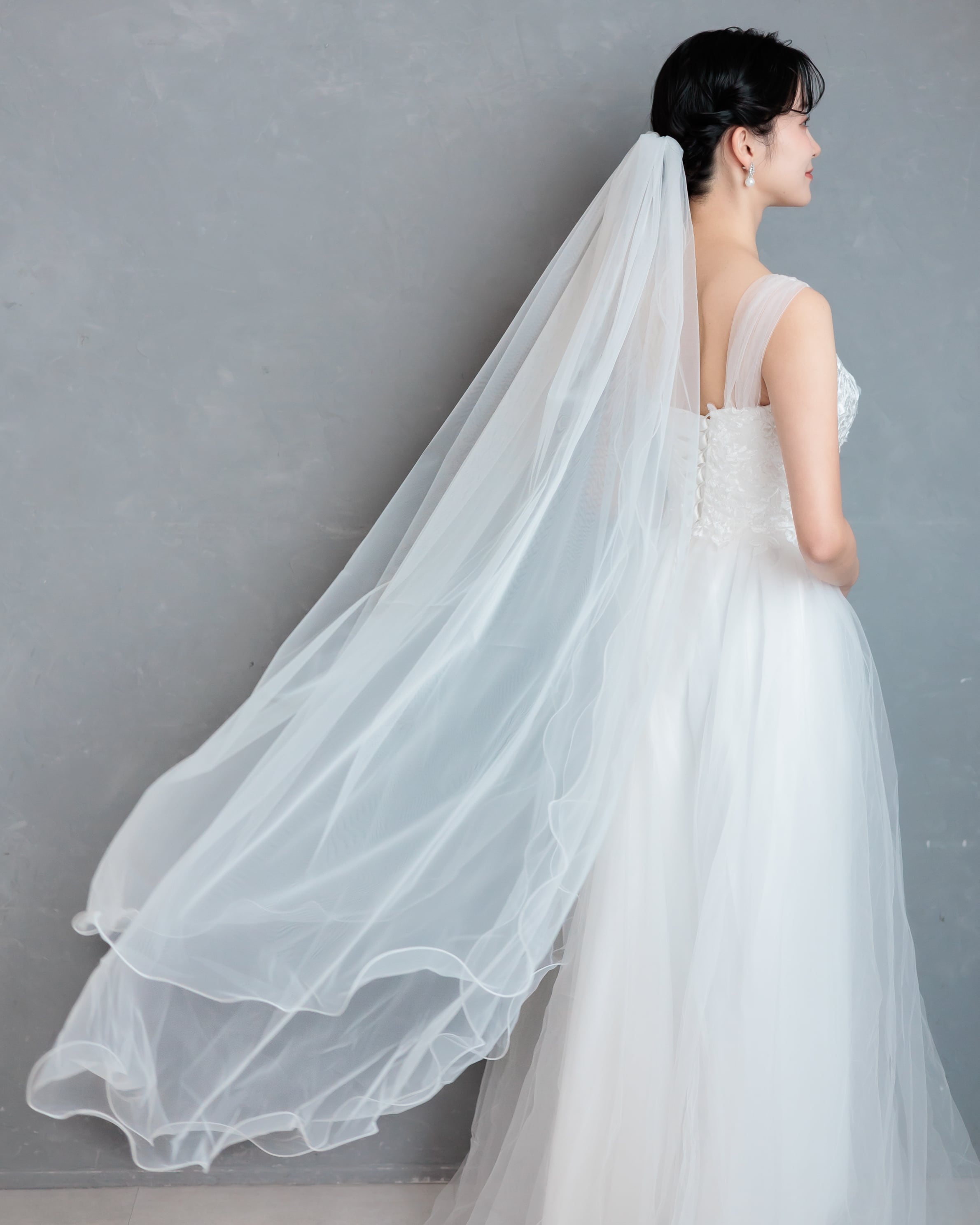 軽やかなチュールに繊細な縁取りを施したロングベール。シンプルながらも流れるような美しいシルエットが、花嫁さまをより一層エレガントに引き立てます。歩くたびにふんわりと揺れる柔らかな素材感が、後ろ姿を優美に演出。