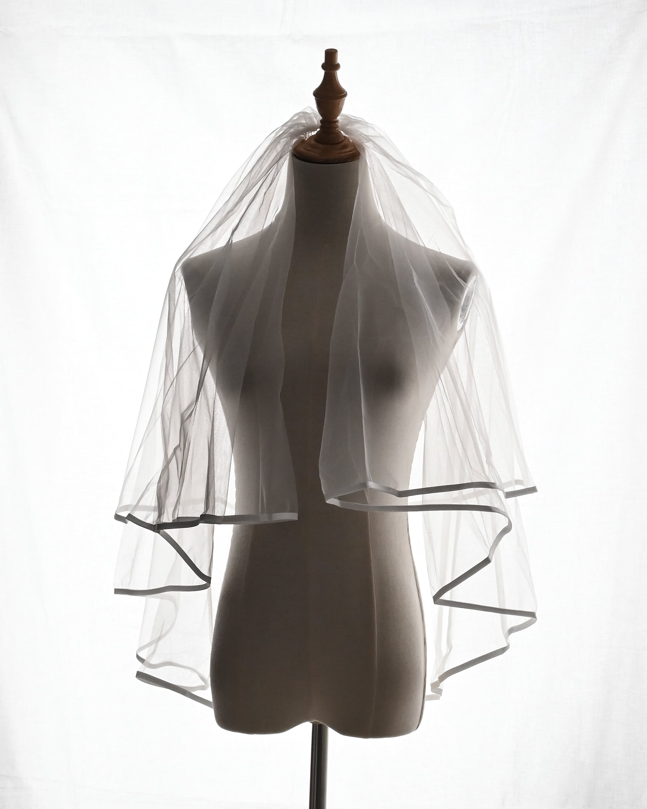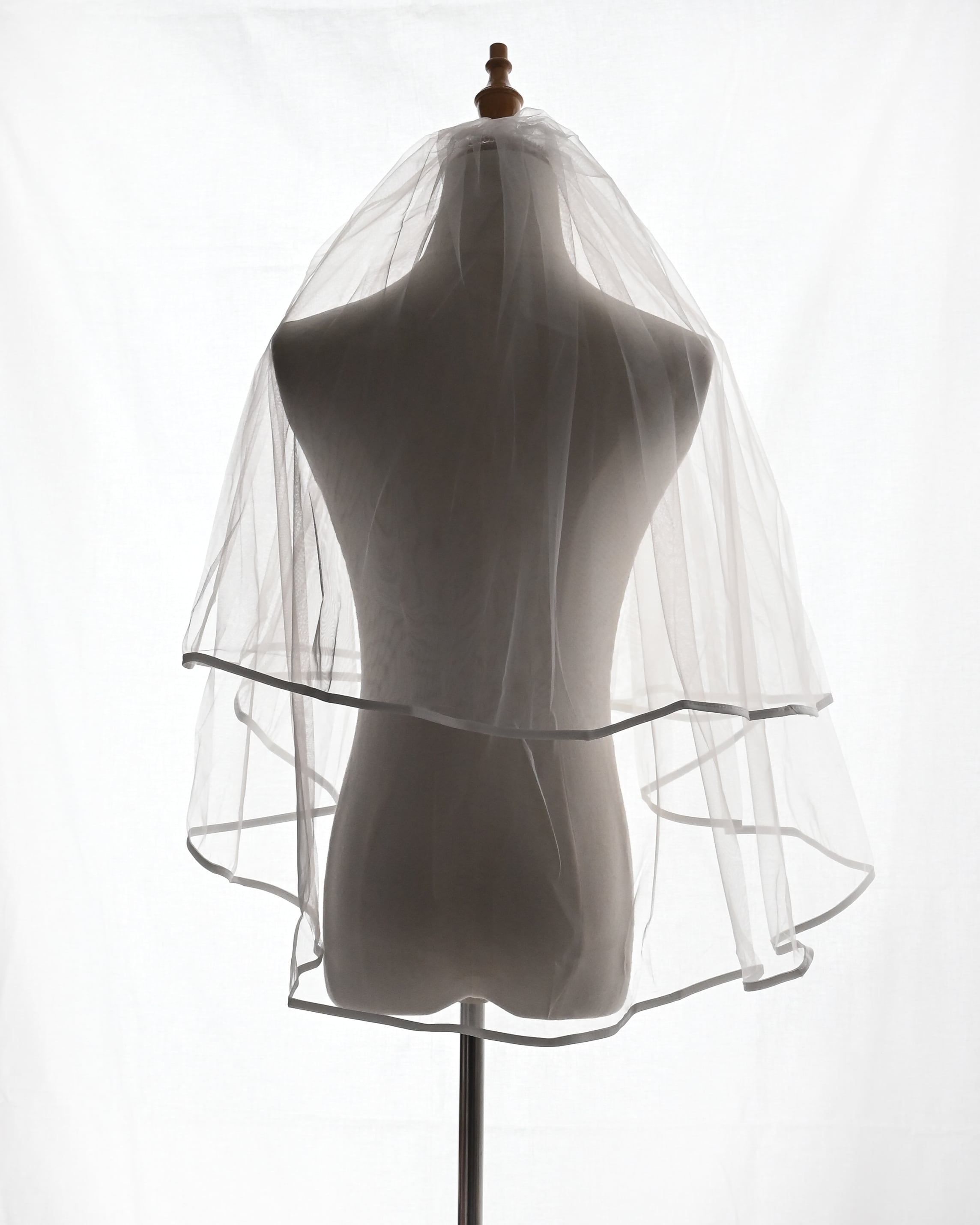 シンプルながらも花嫁さまの美しさを引き立てる、2段タイプのショートベールです。軽やかなチュールが柔らかく広がり、花嫁さまの動きに合わせてふんわりと揺れるデザイン。裾にはパイピングを施しており、程よいアクセントで上品さをプラスしました。