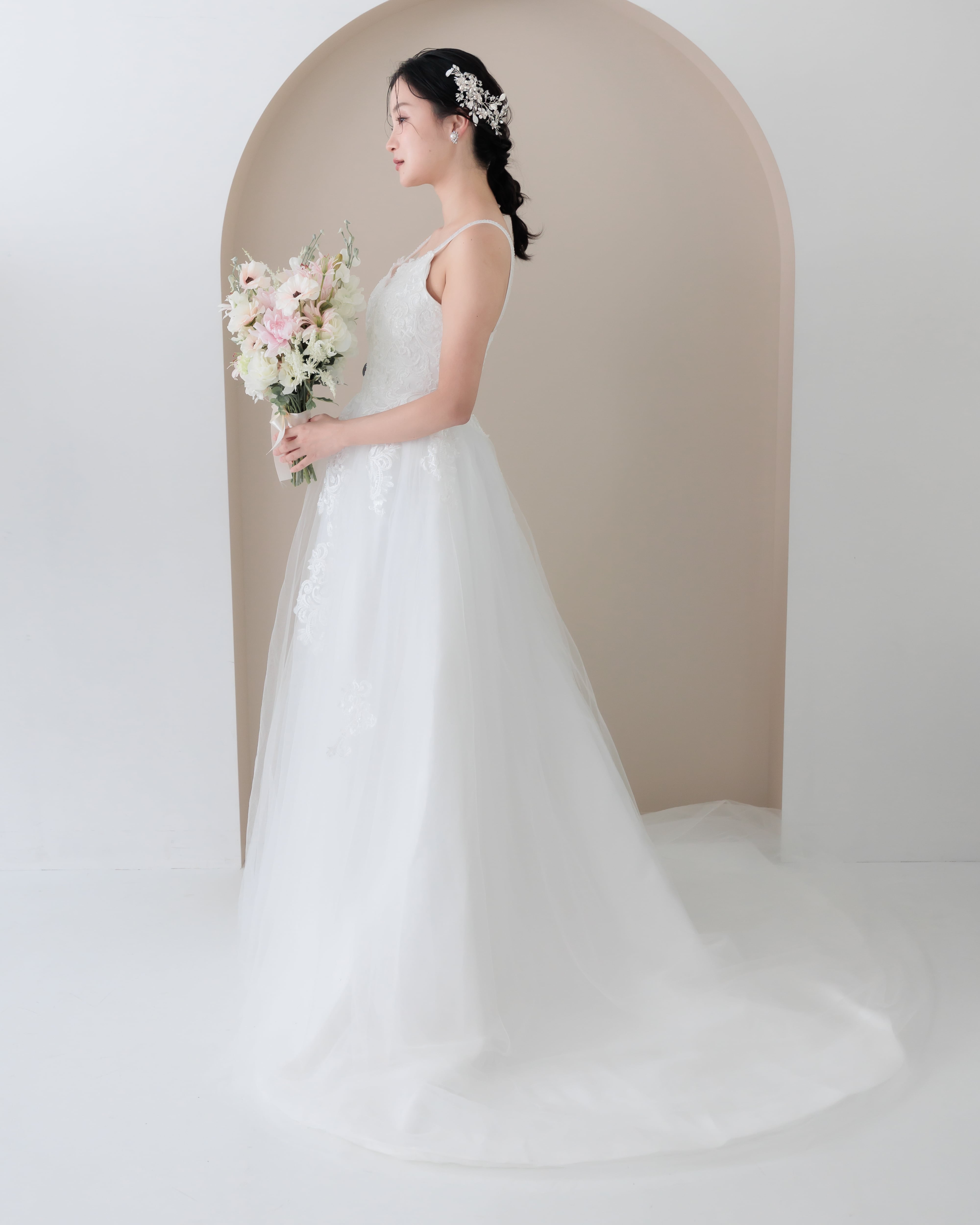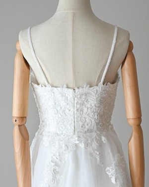 スカートは柔らかなチュールが幾重にも重なり、歩くたびにふんわりと広がる軽やかなシルエットを描きます。背中は華奢なストラップと程よい開きで、女性らしい後ろ姿を印象的に演出。