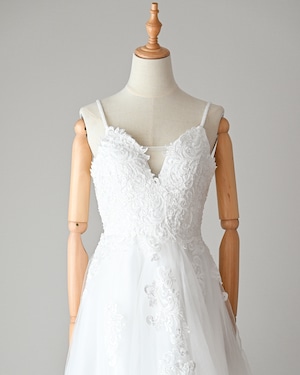 繊細なレースと軽やかなチュールが織りなす、フェミニンで透明感あふれるAラインドレス。