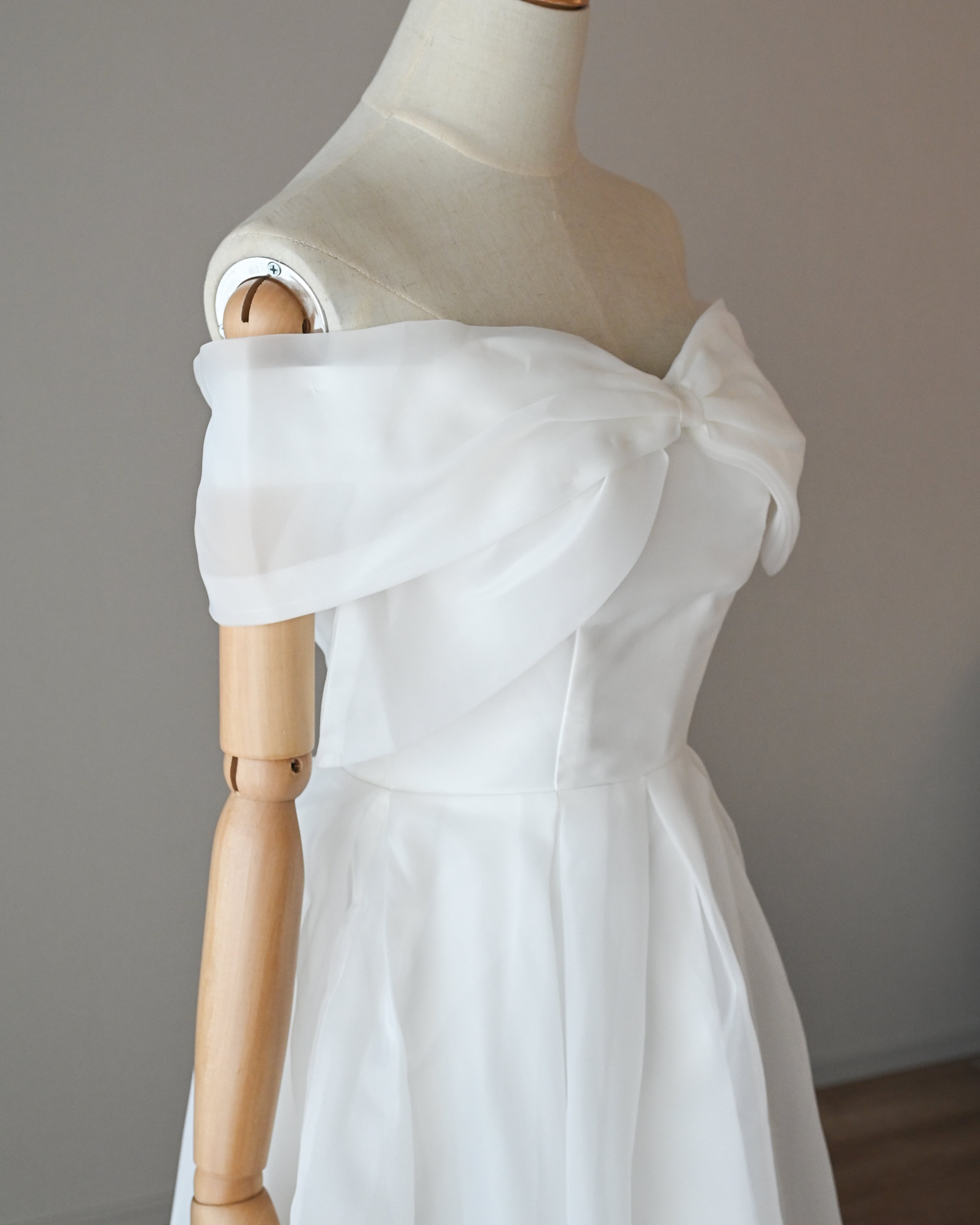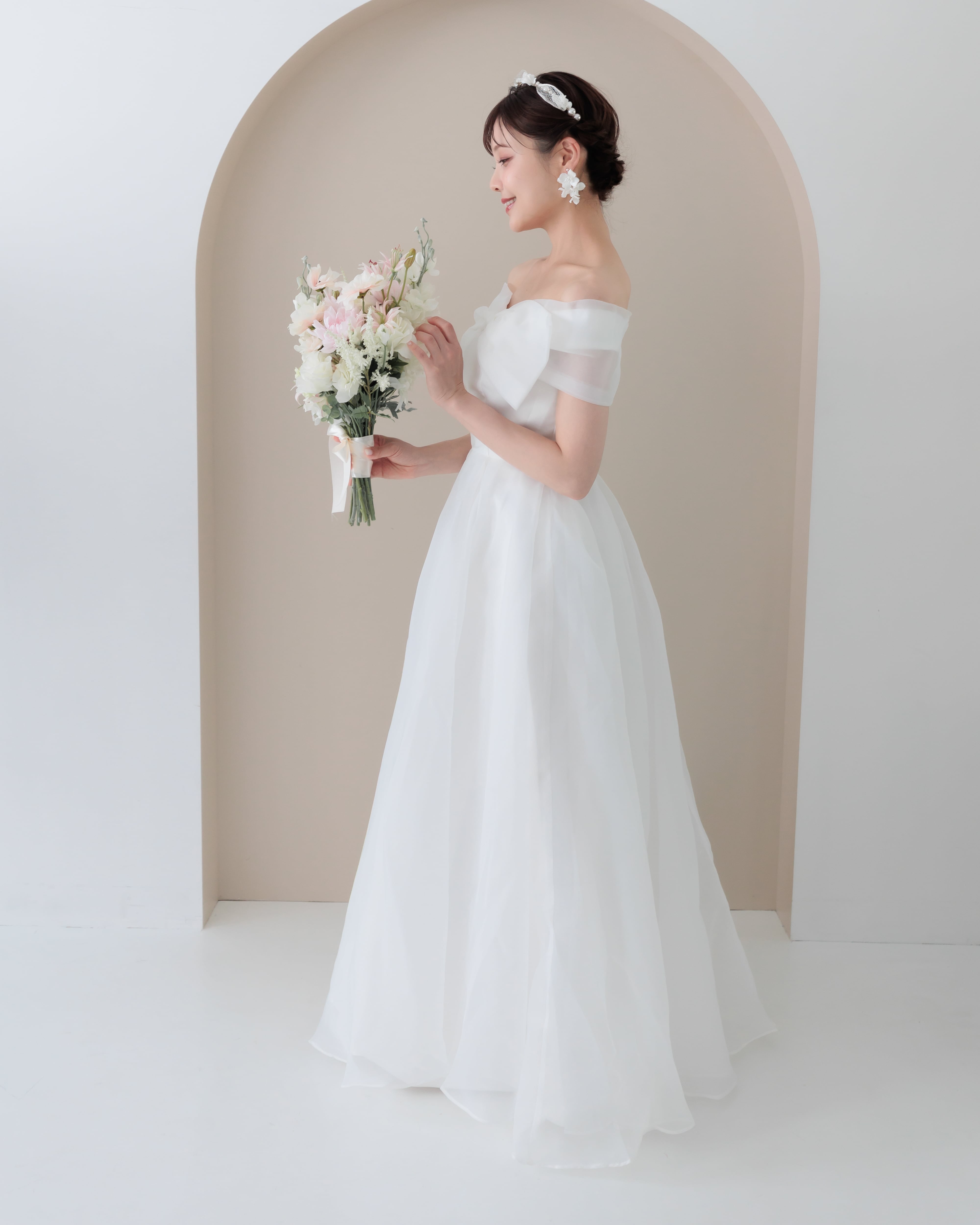 立体的なオフショルダーのデザインが美しい、クラシカルでフェミニンなドレスです。胸元には大きなリボンモチーフをあしらい、上品な華やかさをプラス。シアー感のある軽やかな生地が動きに合わせてふわりと揺れ、洗練された雰囲気を演出します。背面は編み上げ仕様になっており、体型に合わせた調整が可能。シンプルでありながら印象的なデザインで、特別な一日を優雅に彩る一着です。