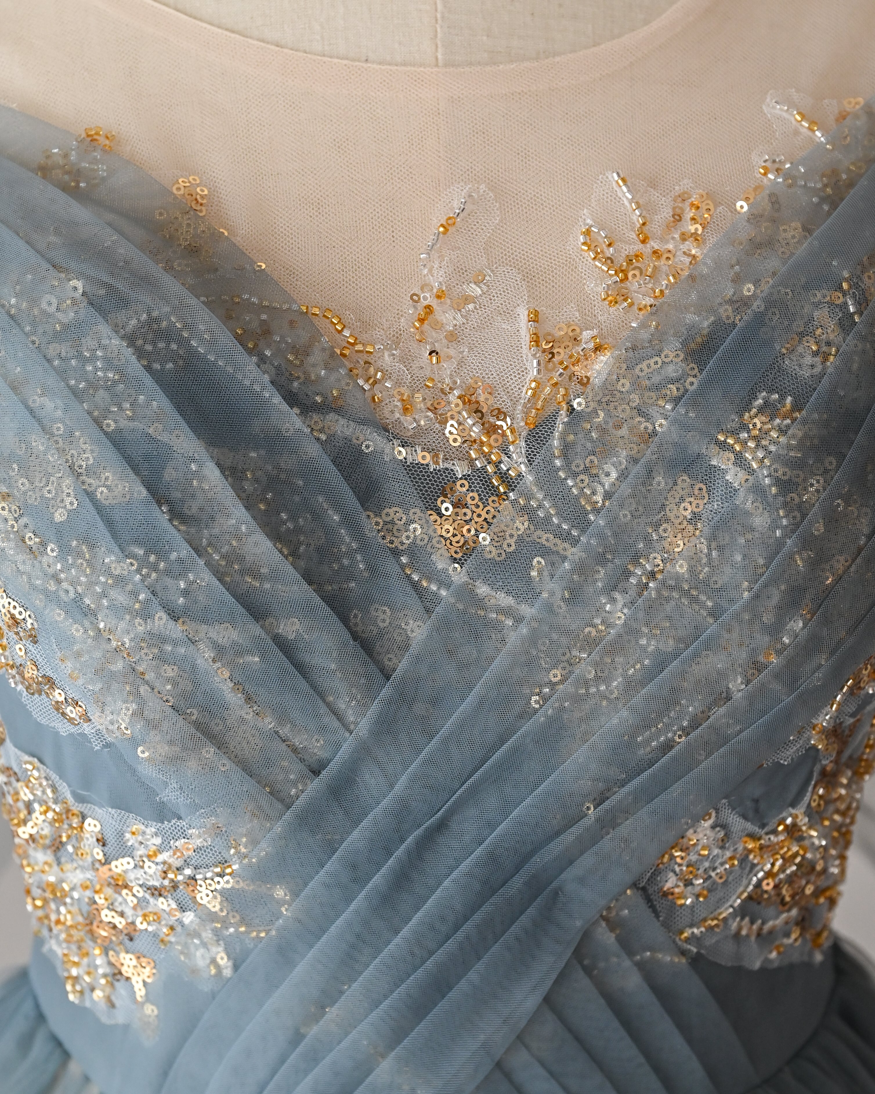 透明感のあるブルーグレーのチュールに、ゴールドのスパンコール刺繍をあしらったドレス。