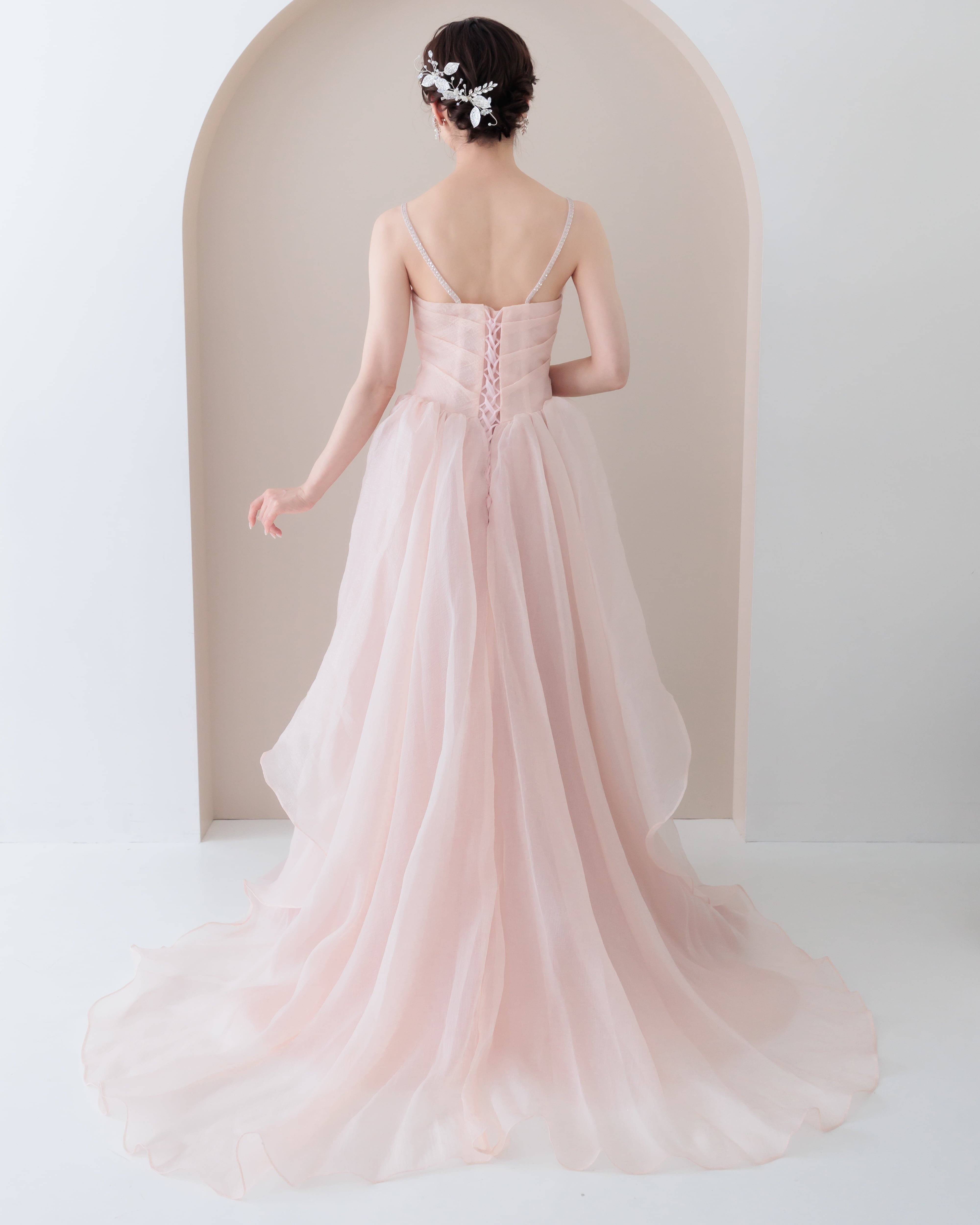 ウエストから流れるように広がるスカートは、軽やかなオーガンジーとチュールを重ね、柔らかく揺れるシルエットを表現。バックスタイルは編み上げ仕様でサイズ調整が可能なため、体に合わせた美しいフィット感を叶えます。