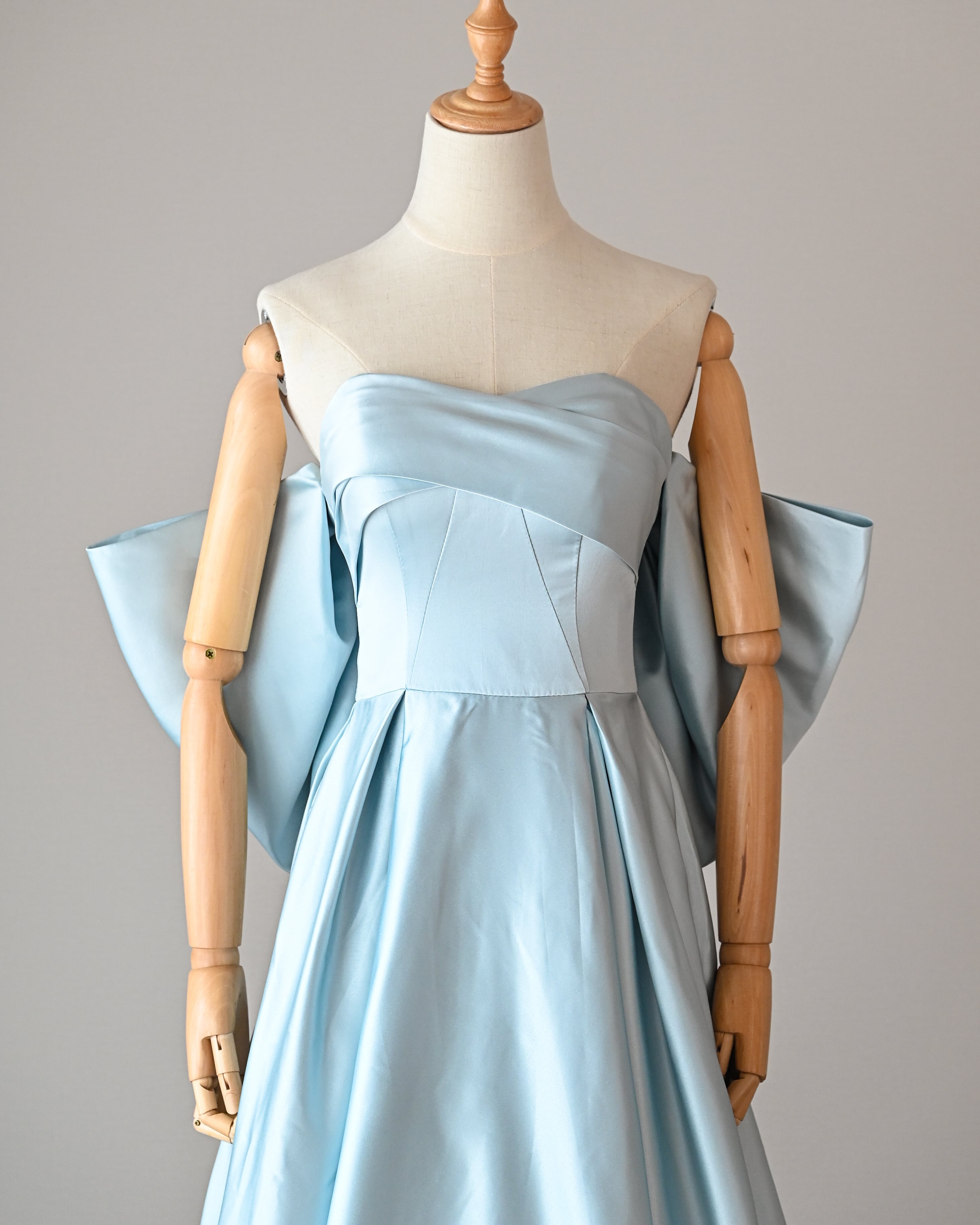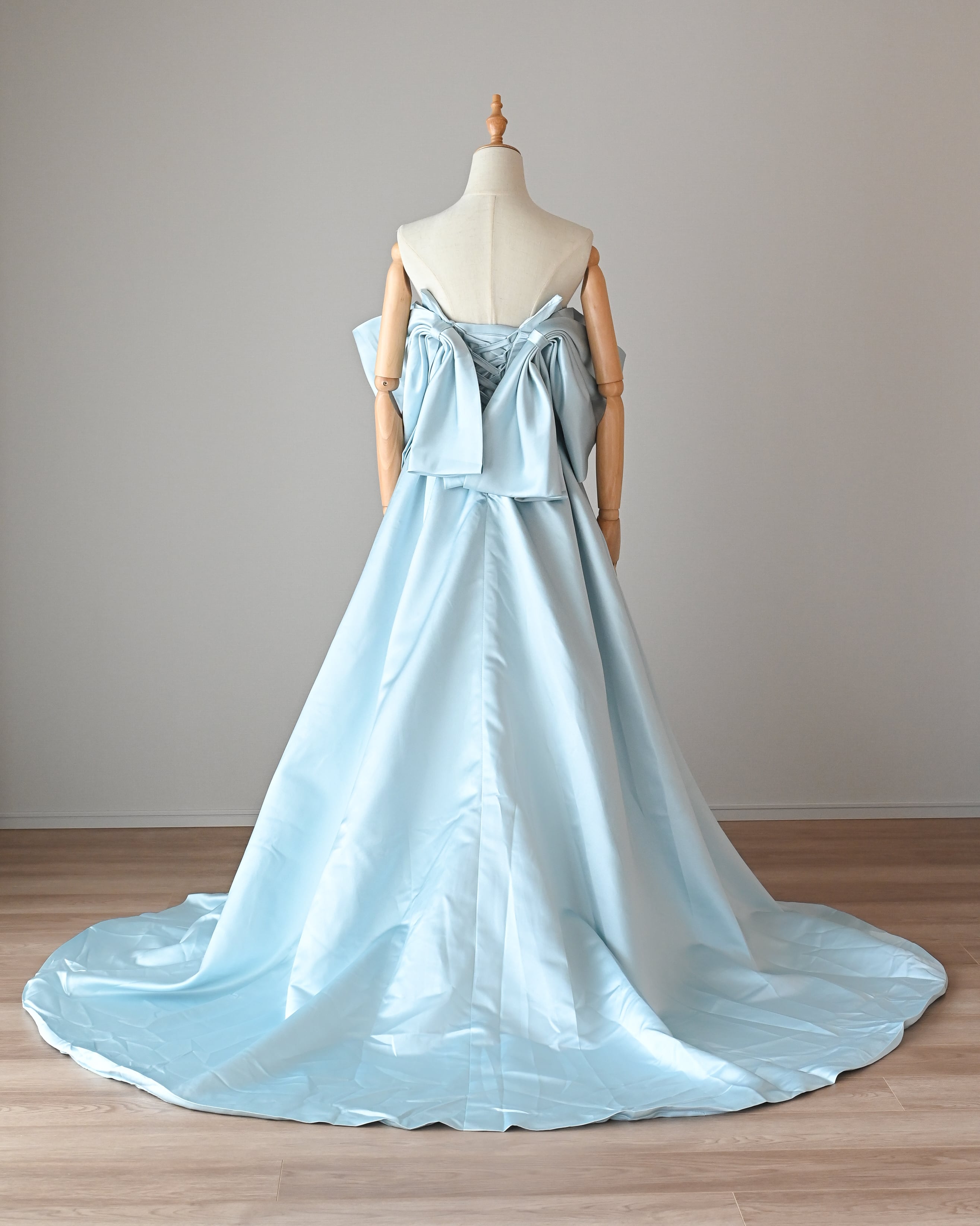 淡いアイスブルーの光沢サテンが、清らかで透明感のある雰囲気を纏わせるドレス。