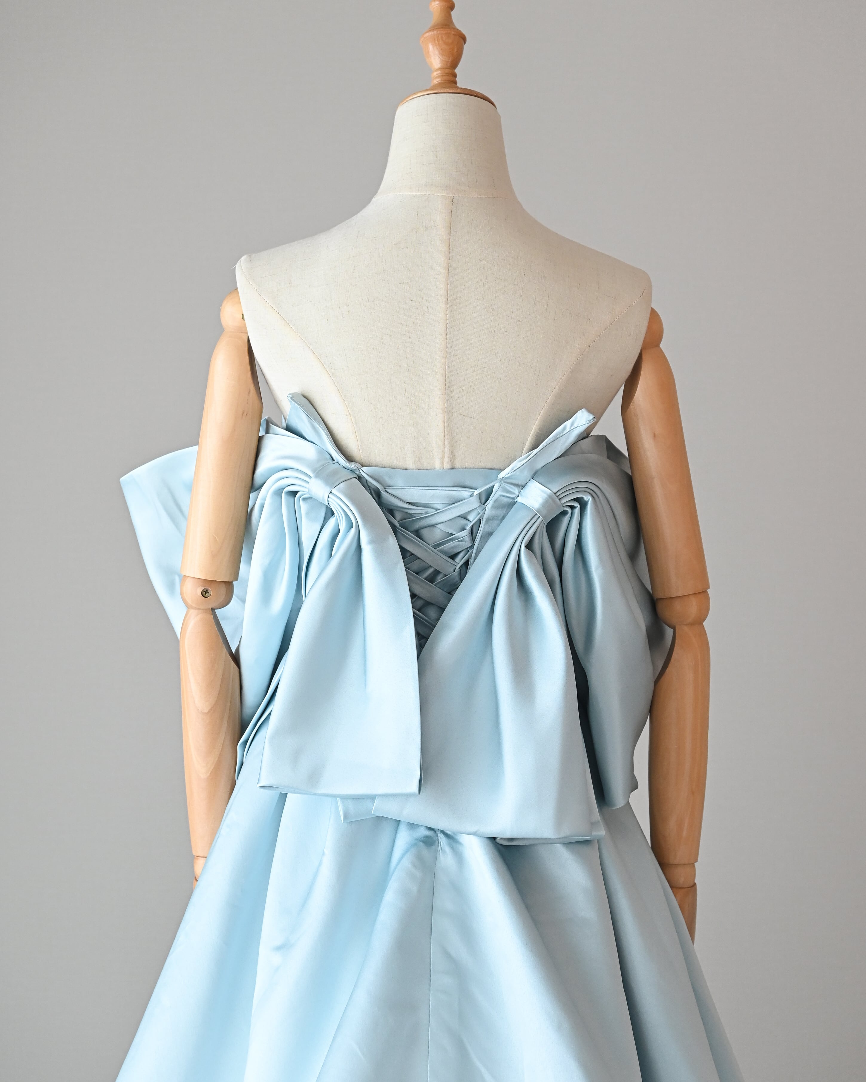 オフショルダー風の大きなリボンデザインがバックスタイルを華やかに彩り、正面からはシンプルで洗練されたシルエットを演出します。