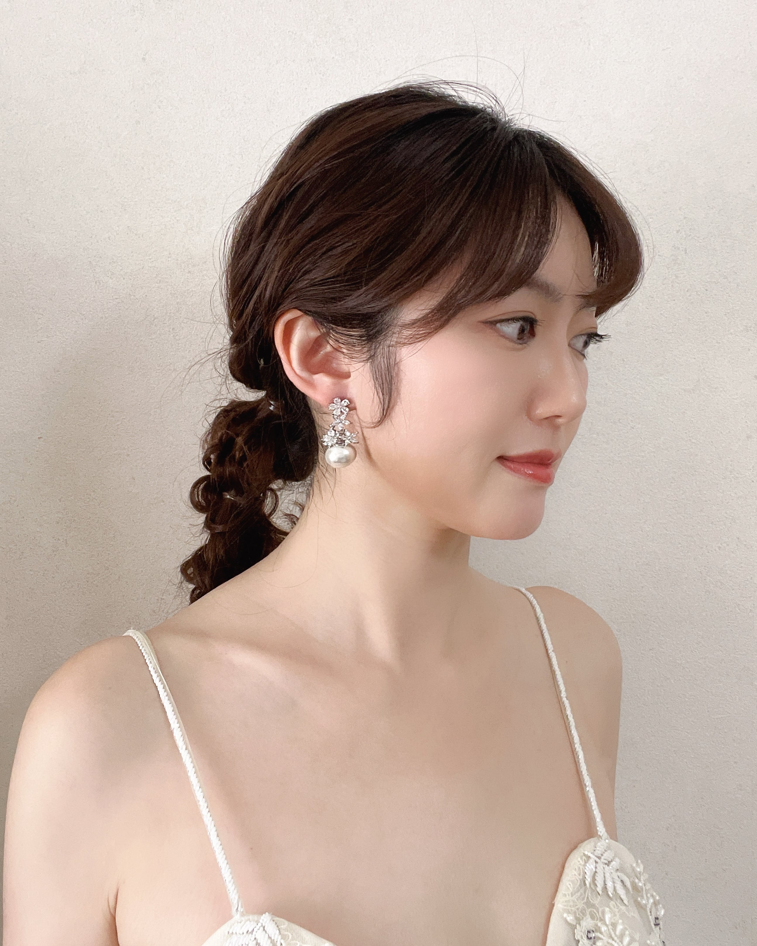 繊細な光の連なりが耳元に華を添え、花嫁さまの横顔を上品に引き立てます。