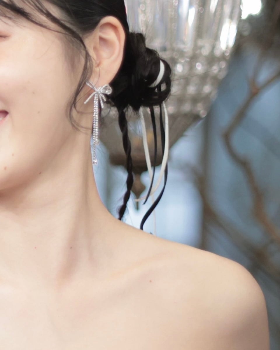 リボンの甘さに、無駄のないフォルムと上質な輝きが重なり、可憐さとモード感を絶妙に持ち合わせ、ブライダルシーンはもちろん、特別な日のアクセントにもふさわしいアイテムです。