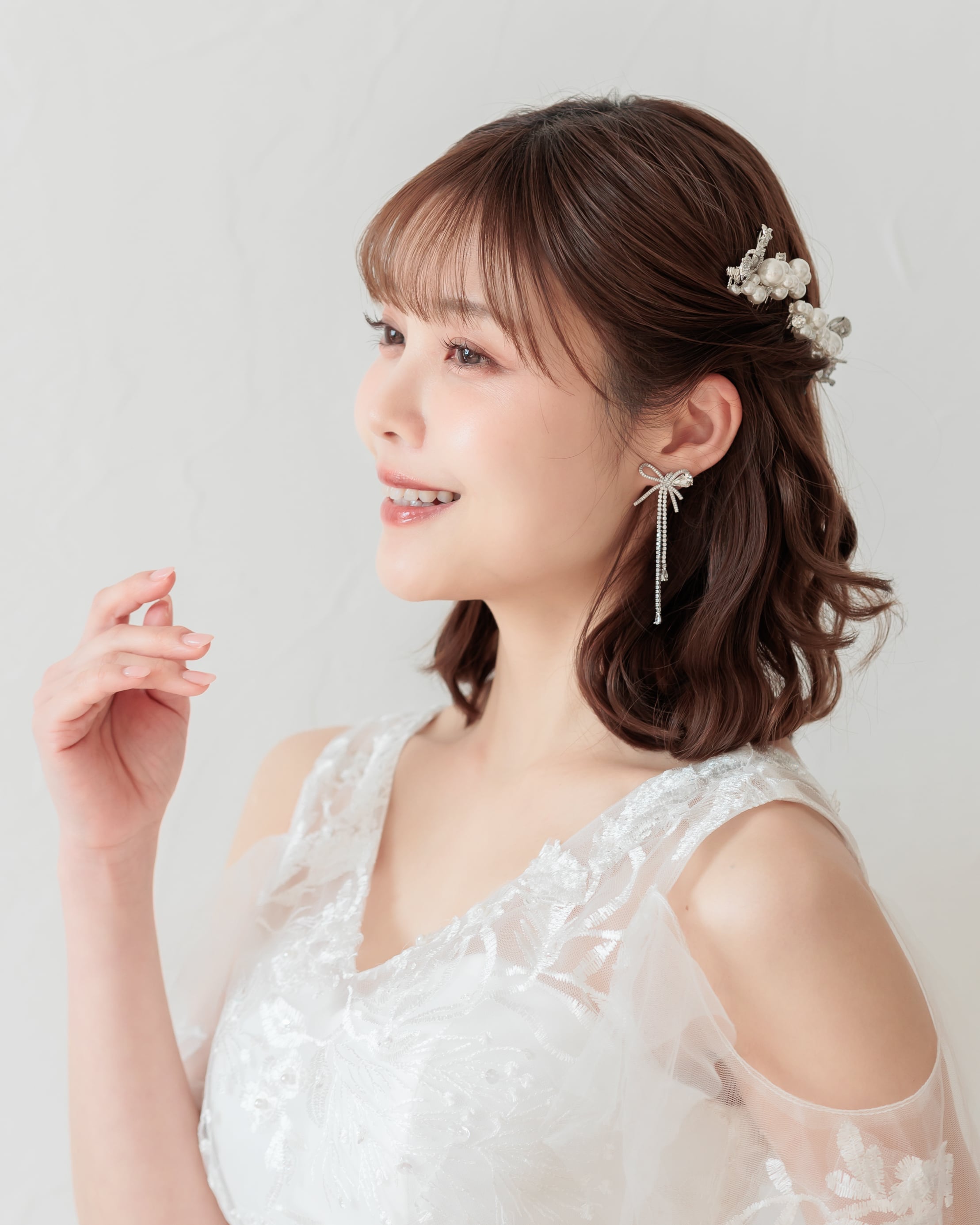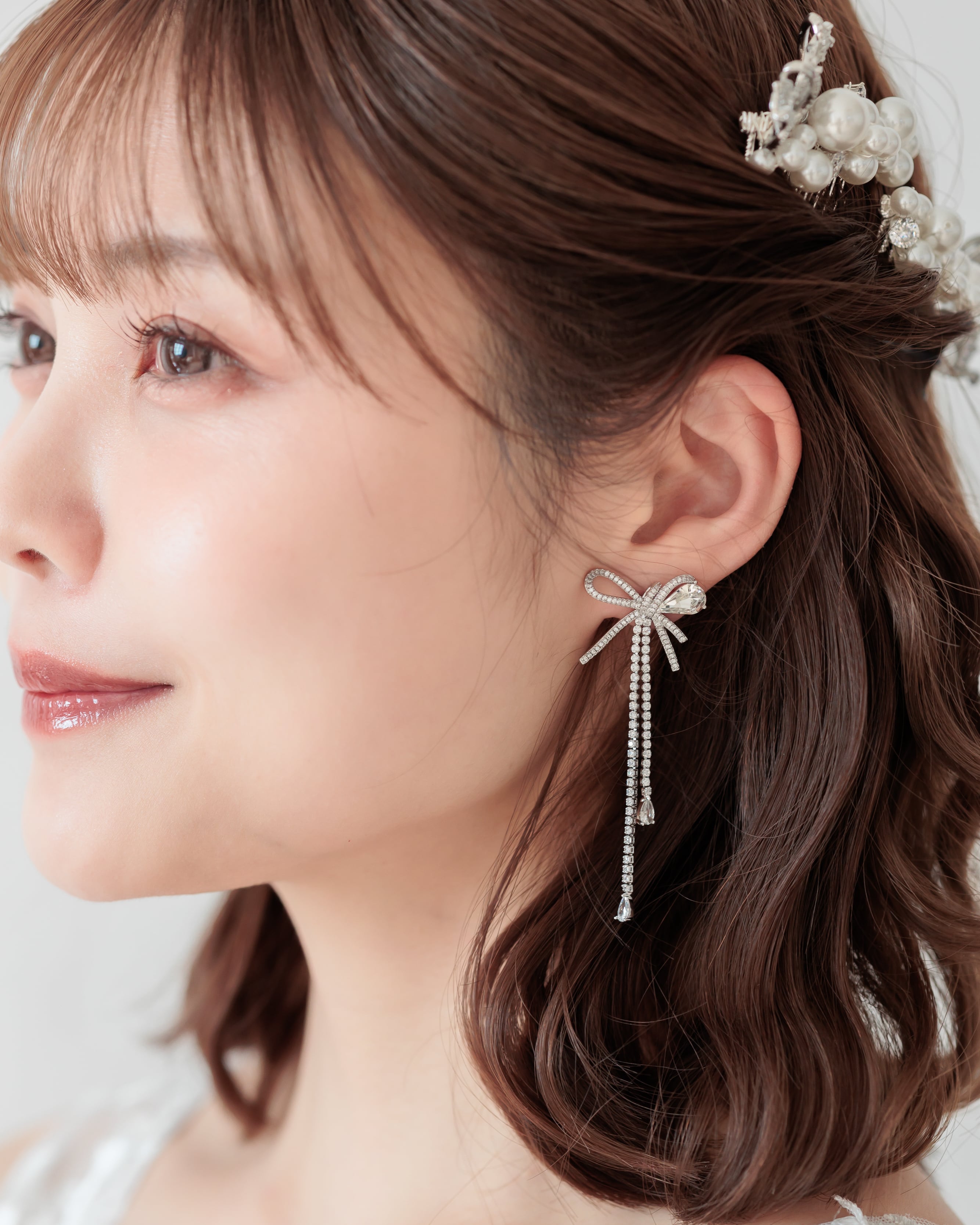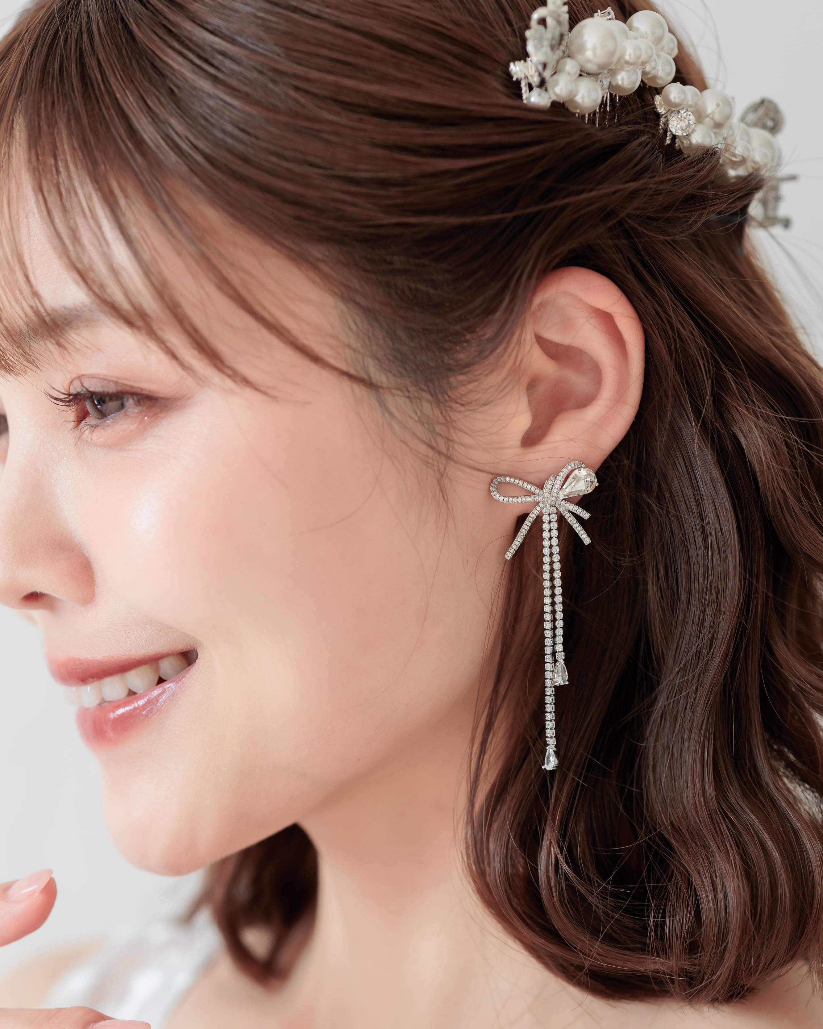 繊細な煌めきと上品なリボンモチーフが魅力のブライダルイヤリング/ピアスです。