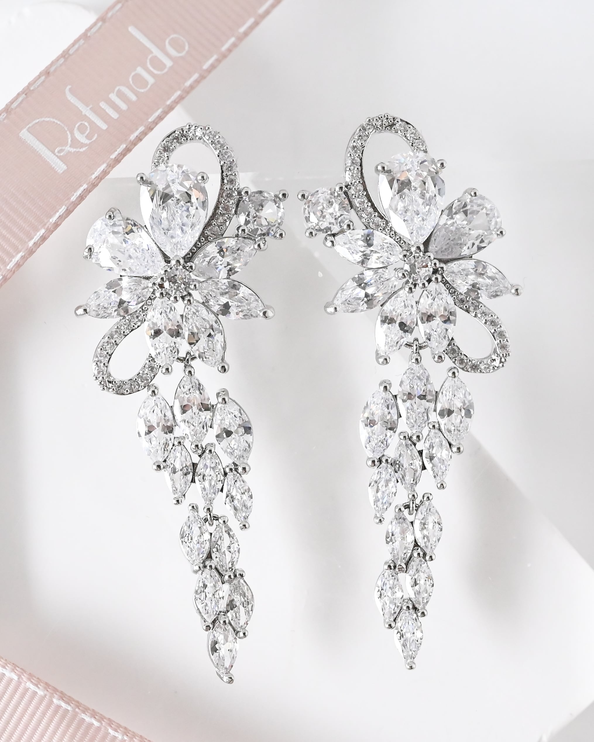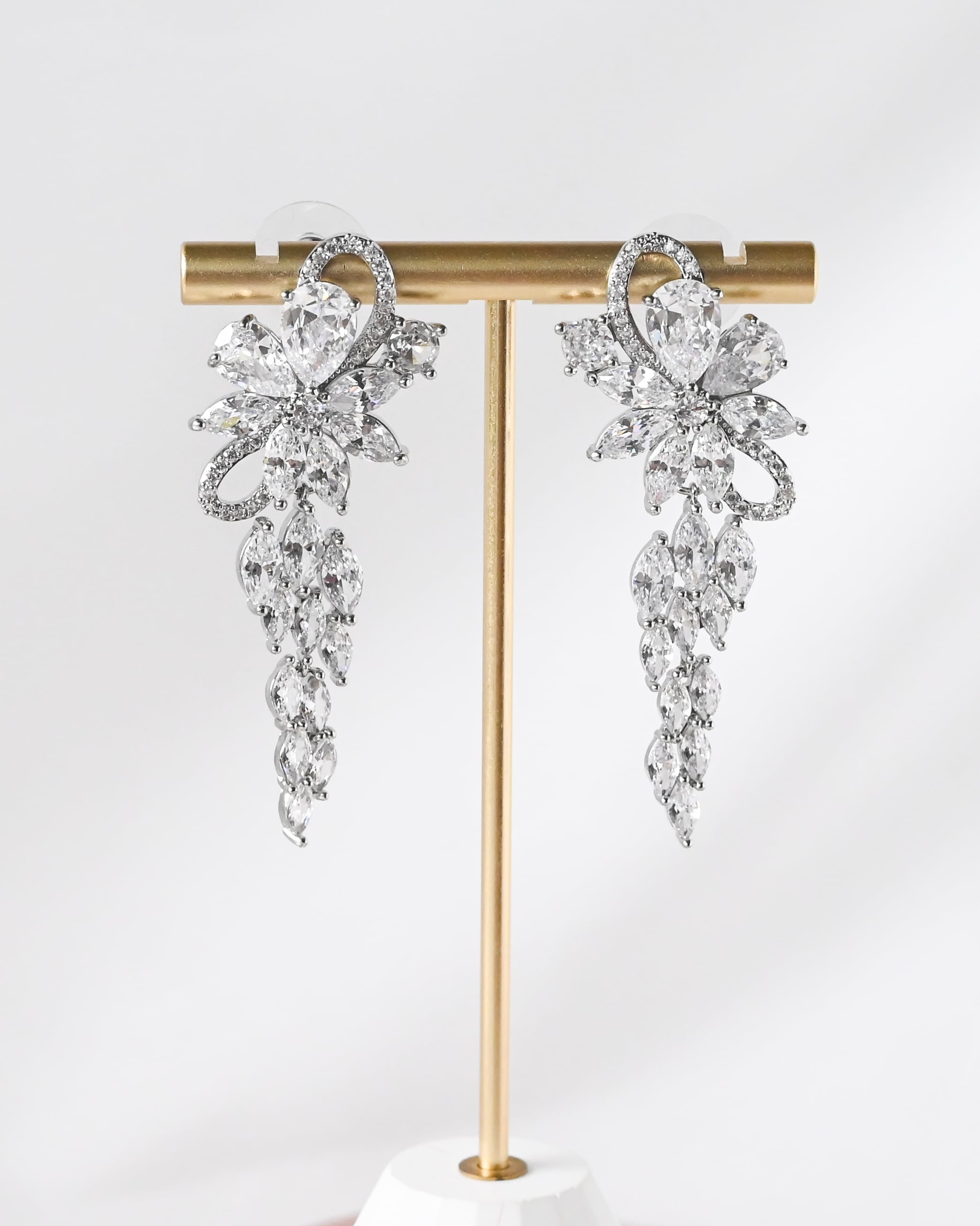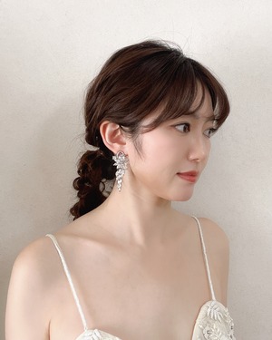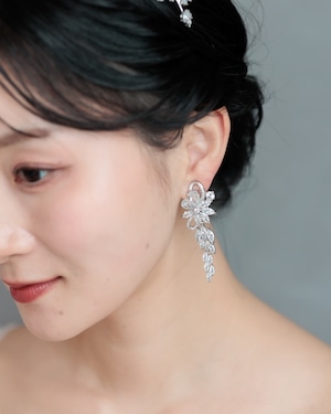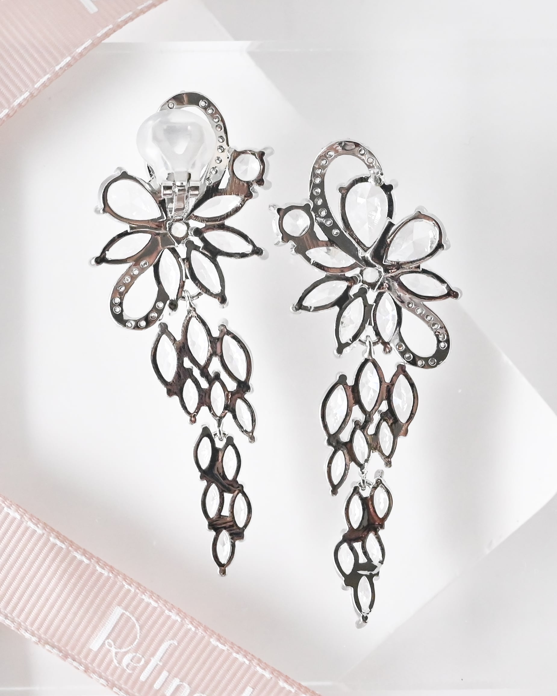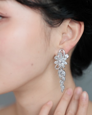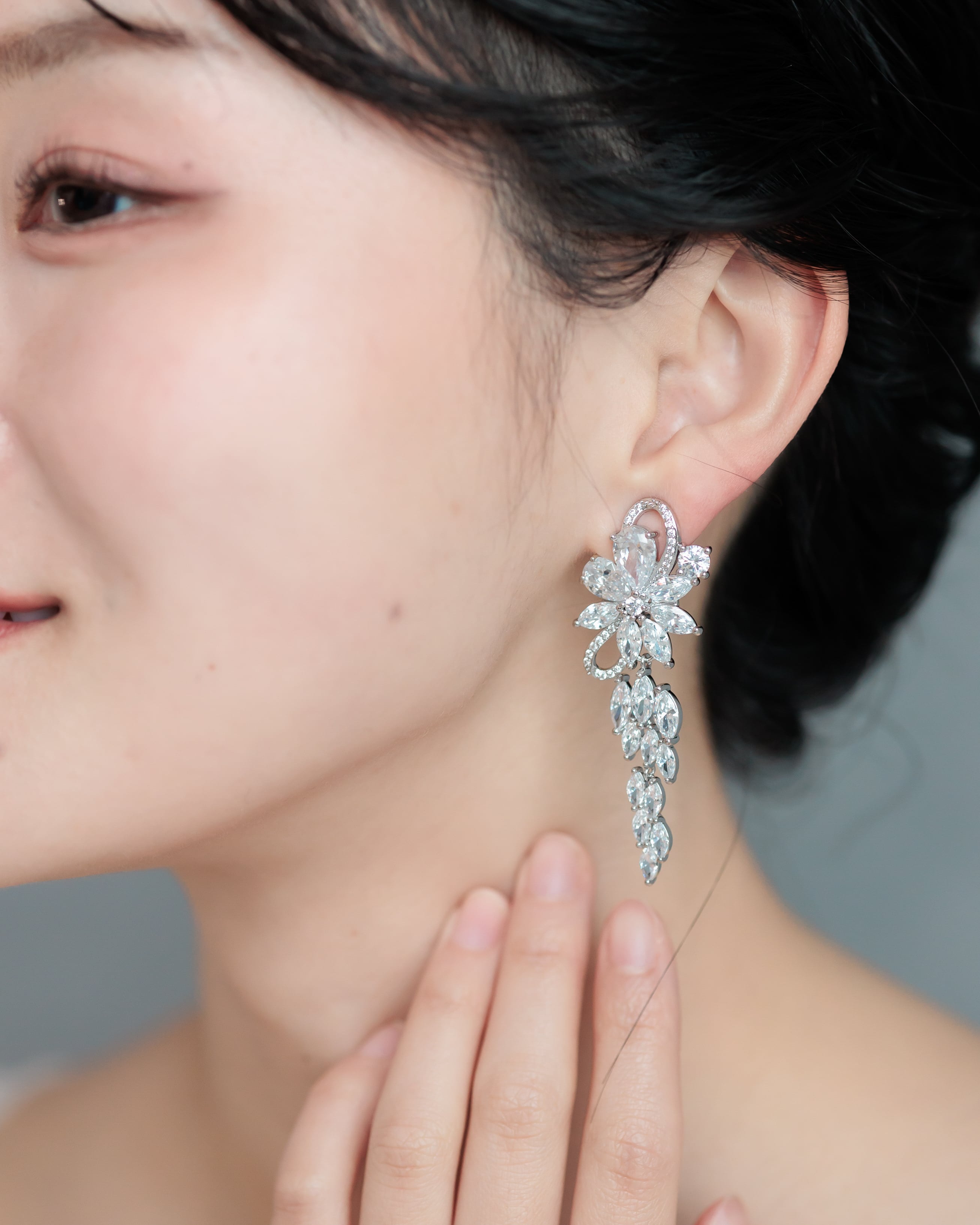 大小のマーキスカットストーンを贅沢に連ね、まるで光が花びらを伝って滴るような優雅なフォルムを描きます。トップにはしなやかなカーブを描くリーフモチーフを配し、耳元を包み込むような立体感を演出。