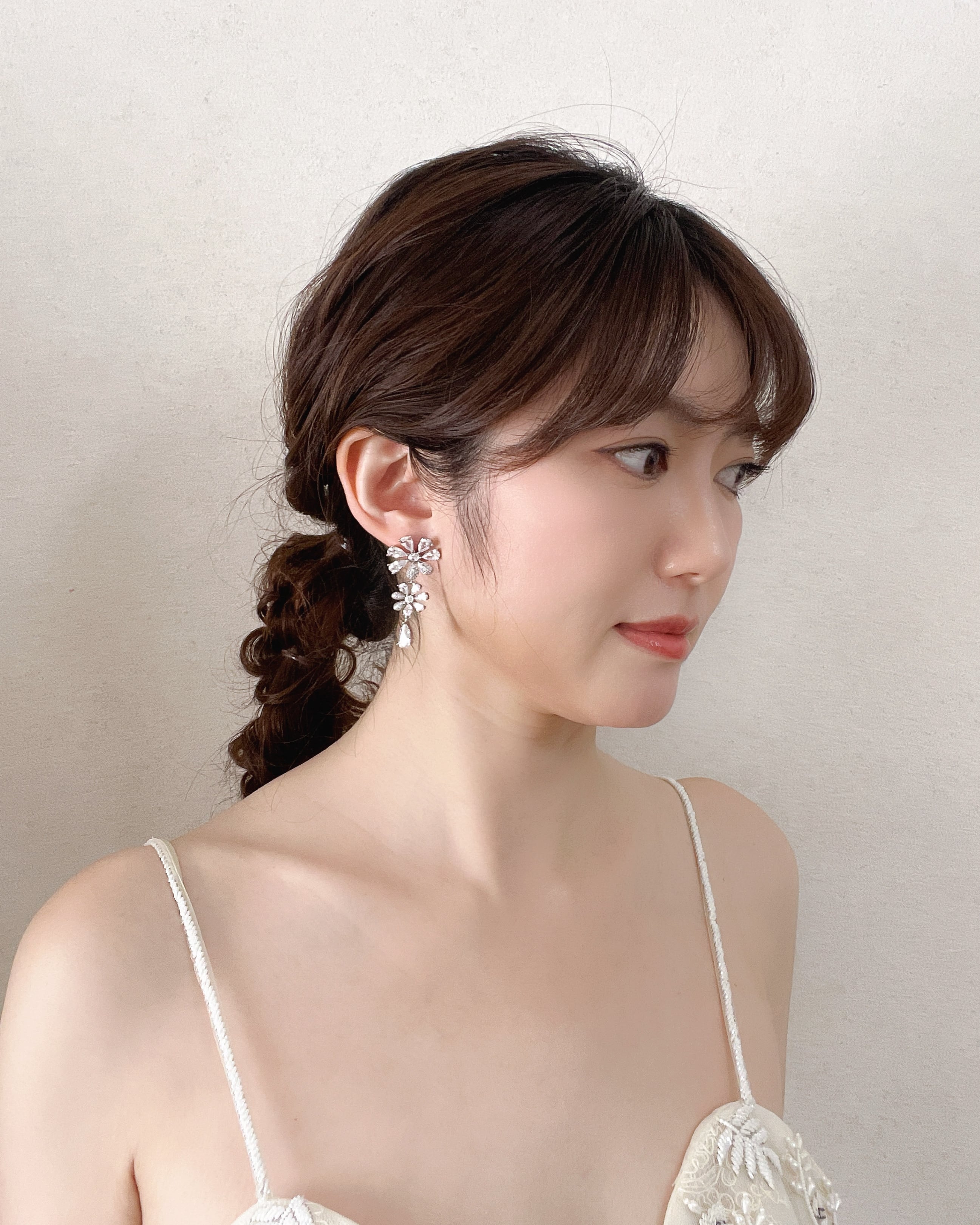 ティアドロップカットのジルコニアを贅沢にあしらい、まるで花が開く瞬間を切り取ったような華やかさを放ちます。