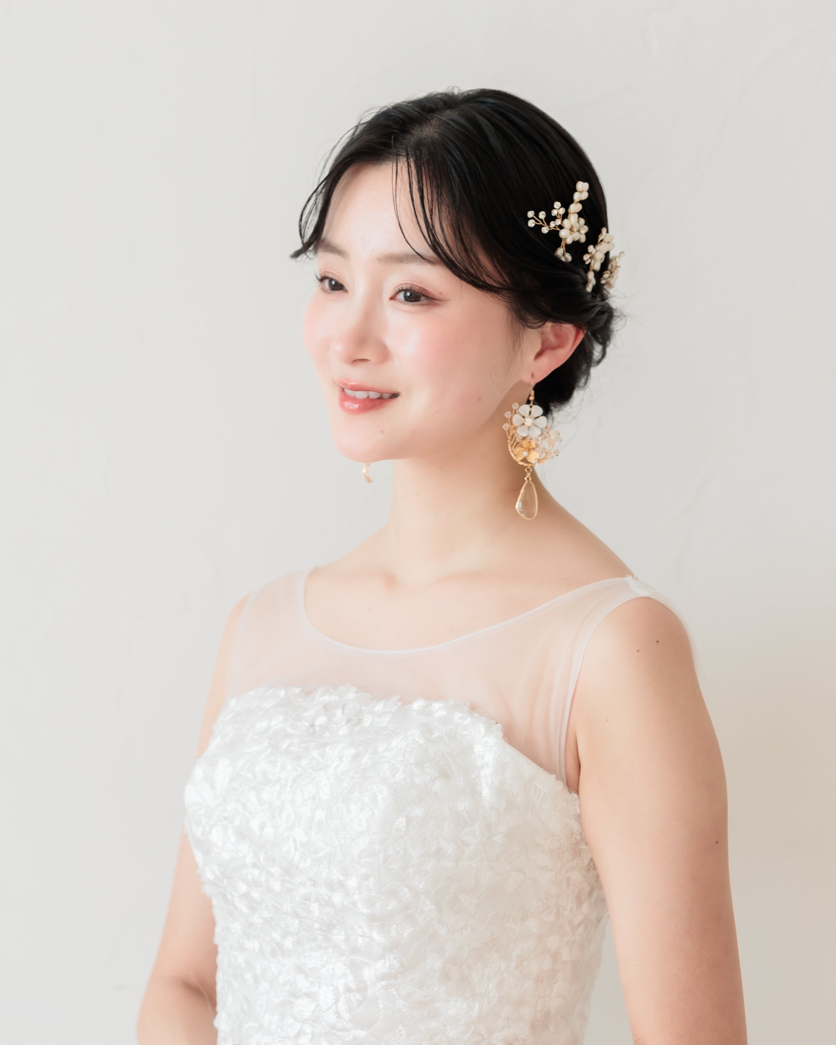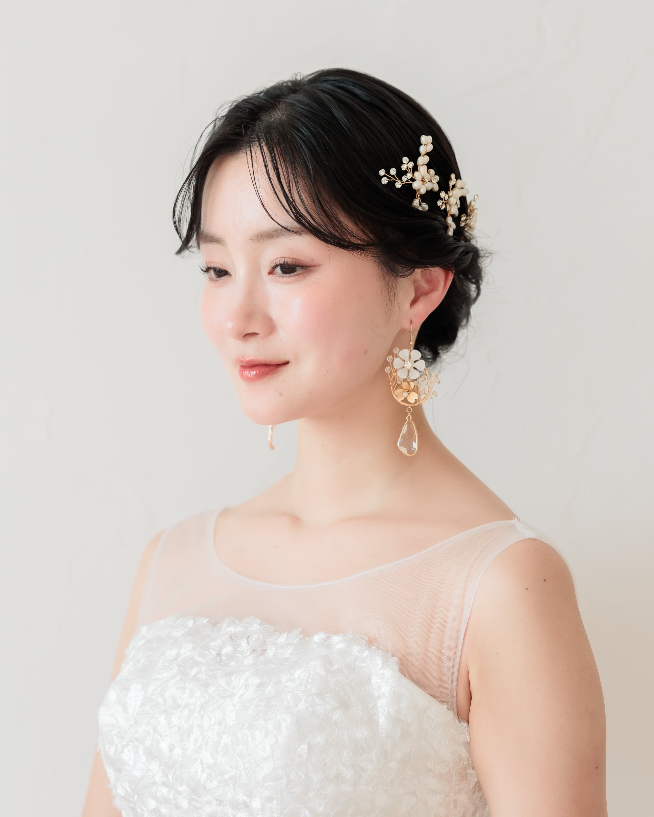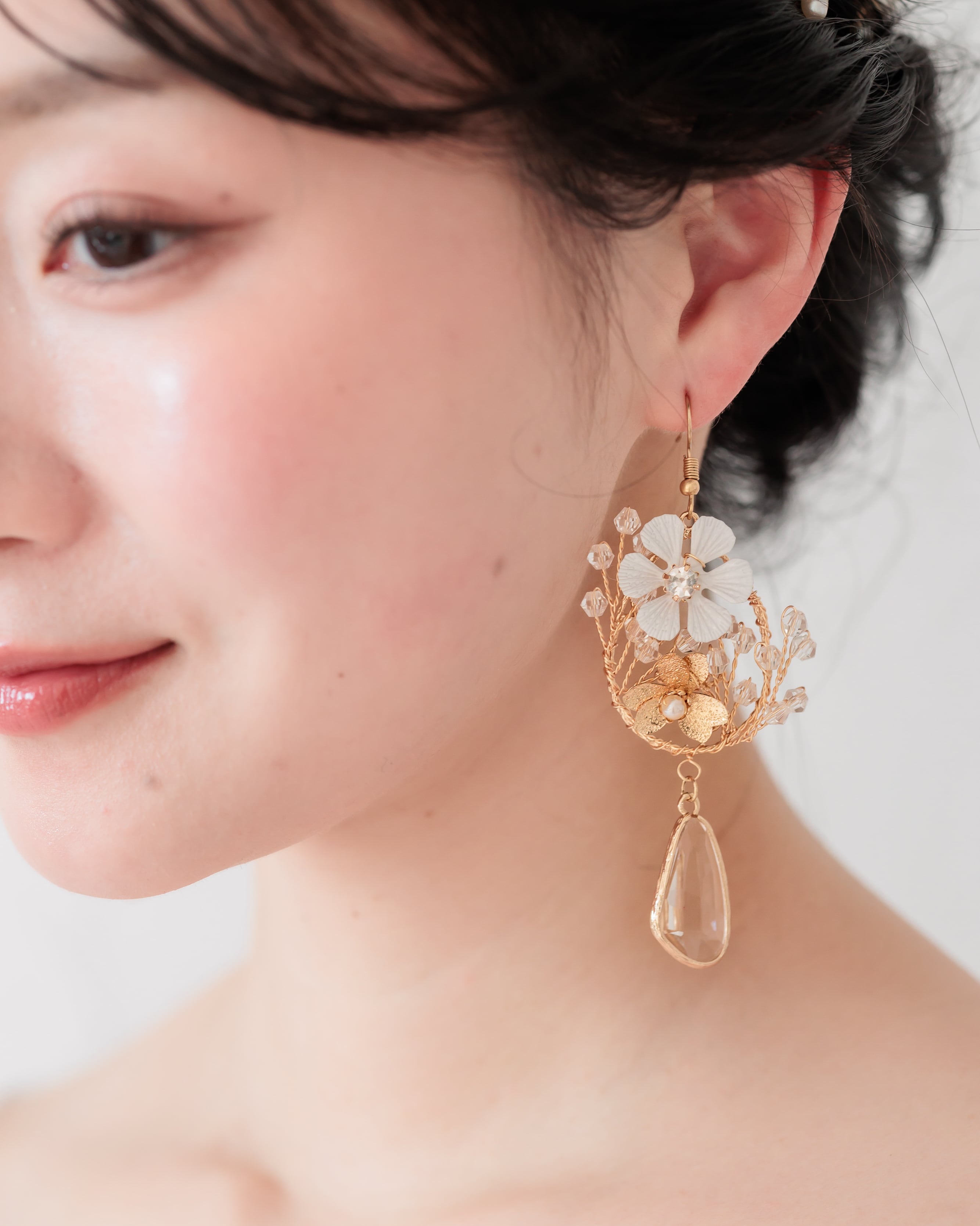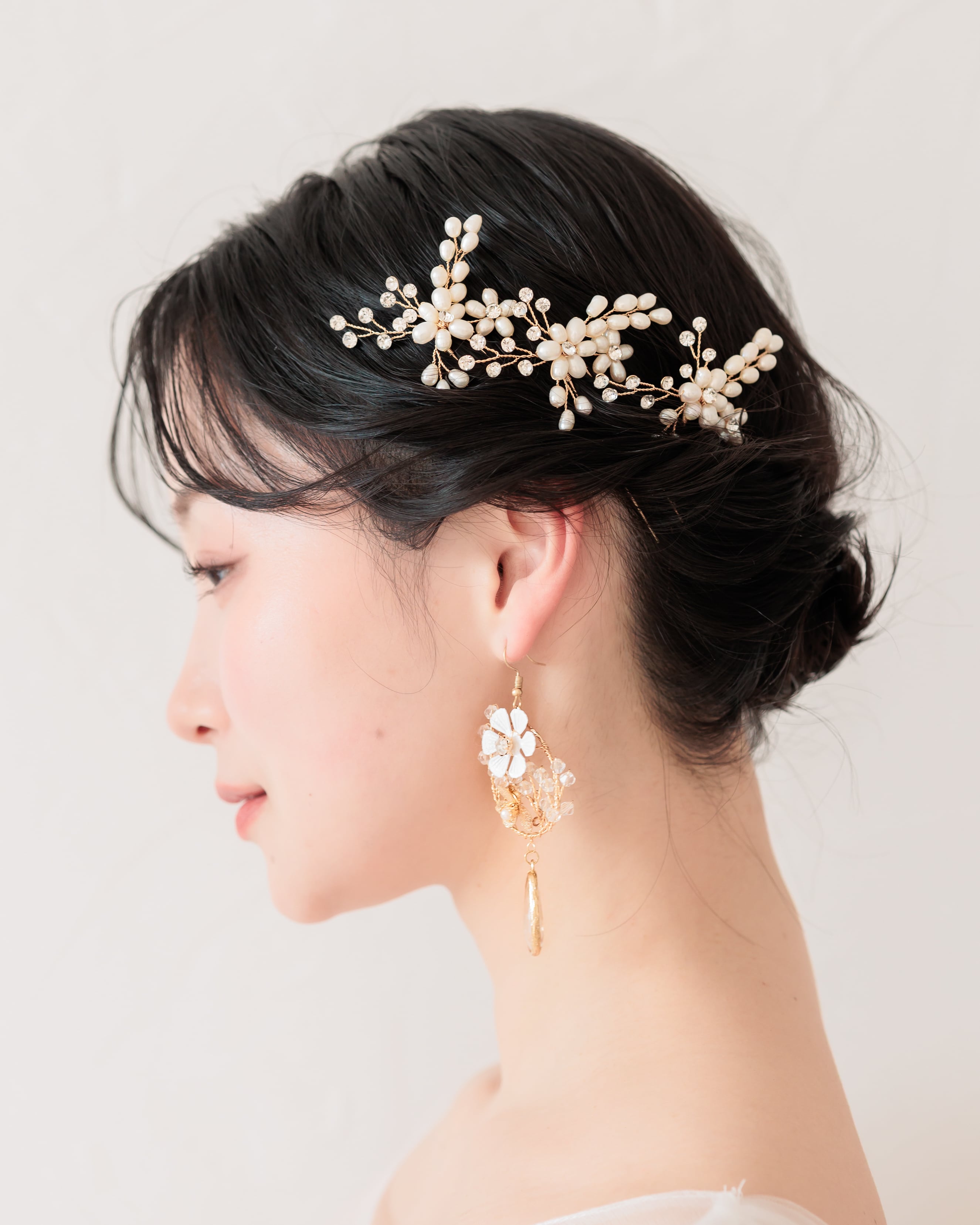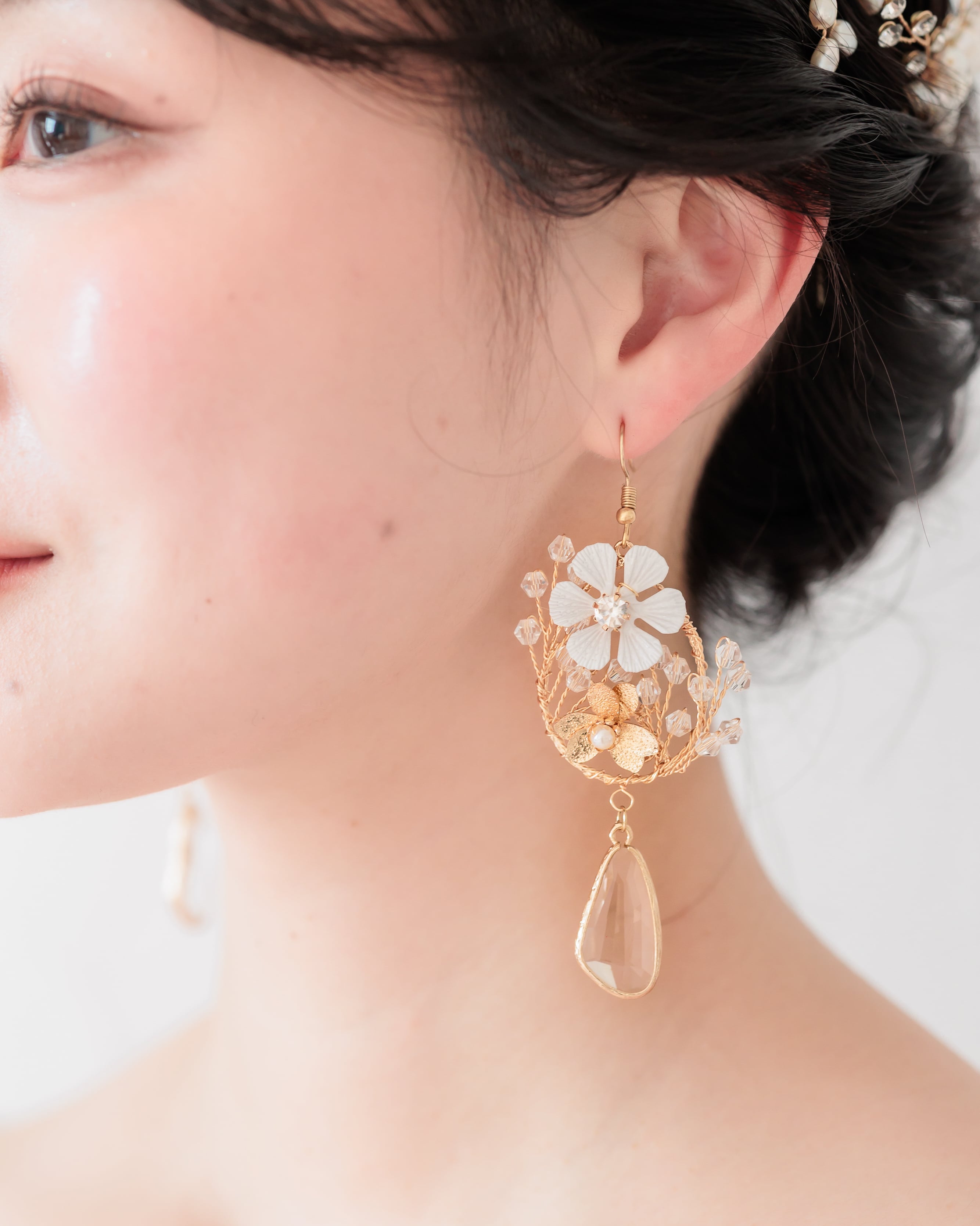 ホワイトフラワーの中心には透明ストーンが輝き、下部にはマットゴールドの小花と淡いパールを配置。異素材を組み合わせた立体的なデザインが顔まわりを華やかに彩ります。