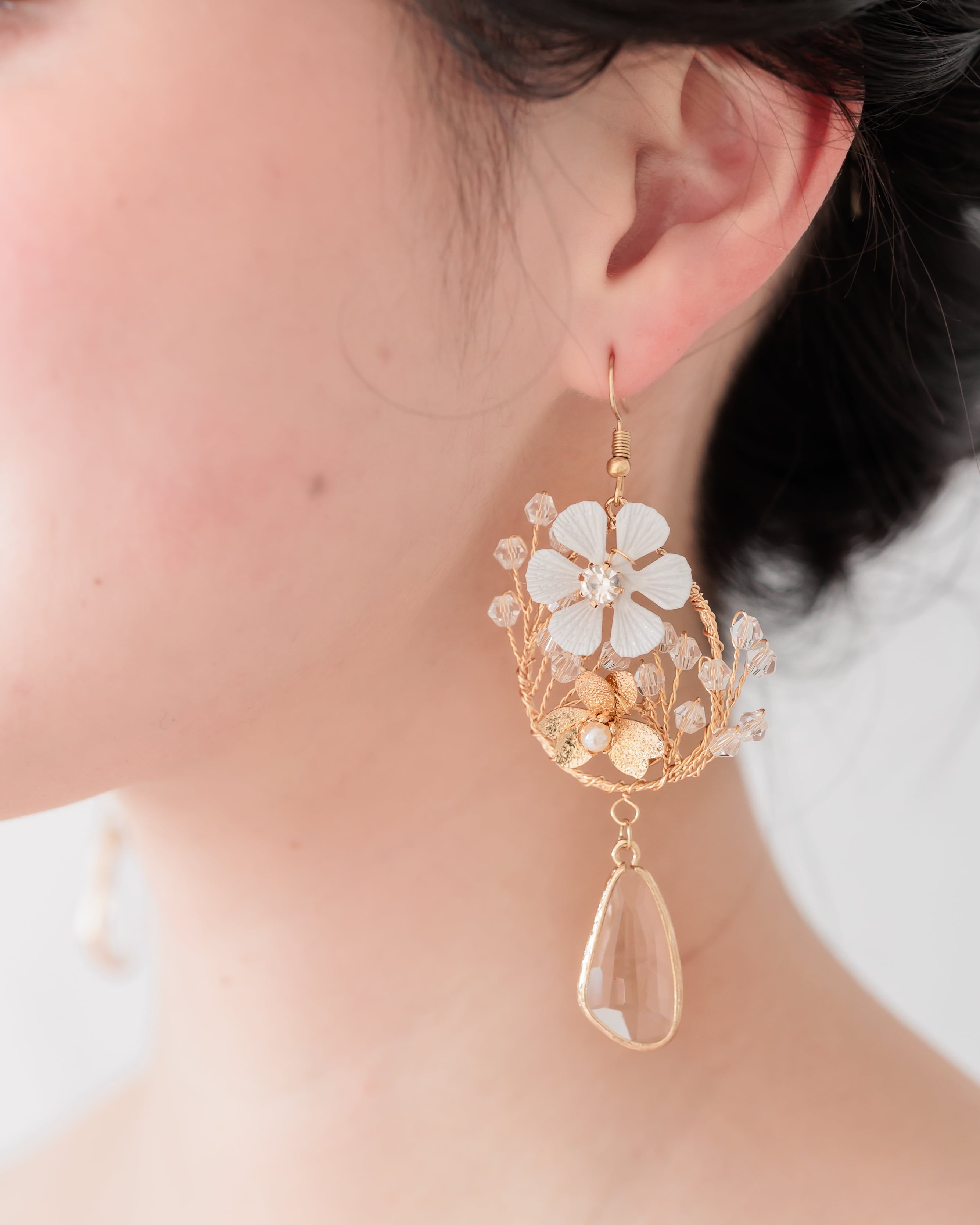 繊細なゴールドの枝に咲く白いフラワーモチーフと、クリアクリスタルのドロップチャームが揺れるデザインのイヤリング/ピアス。