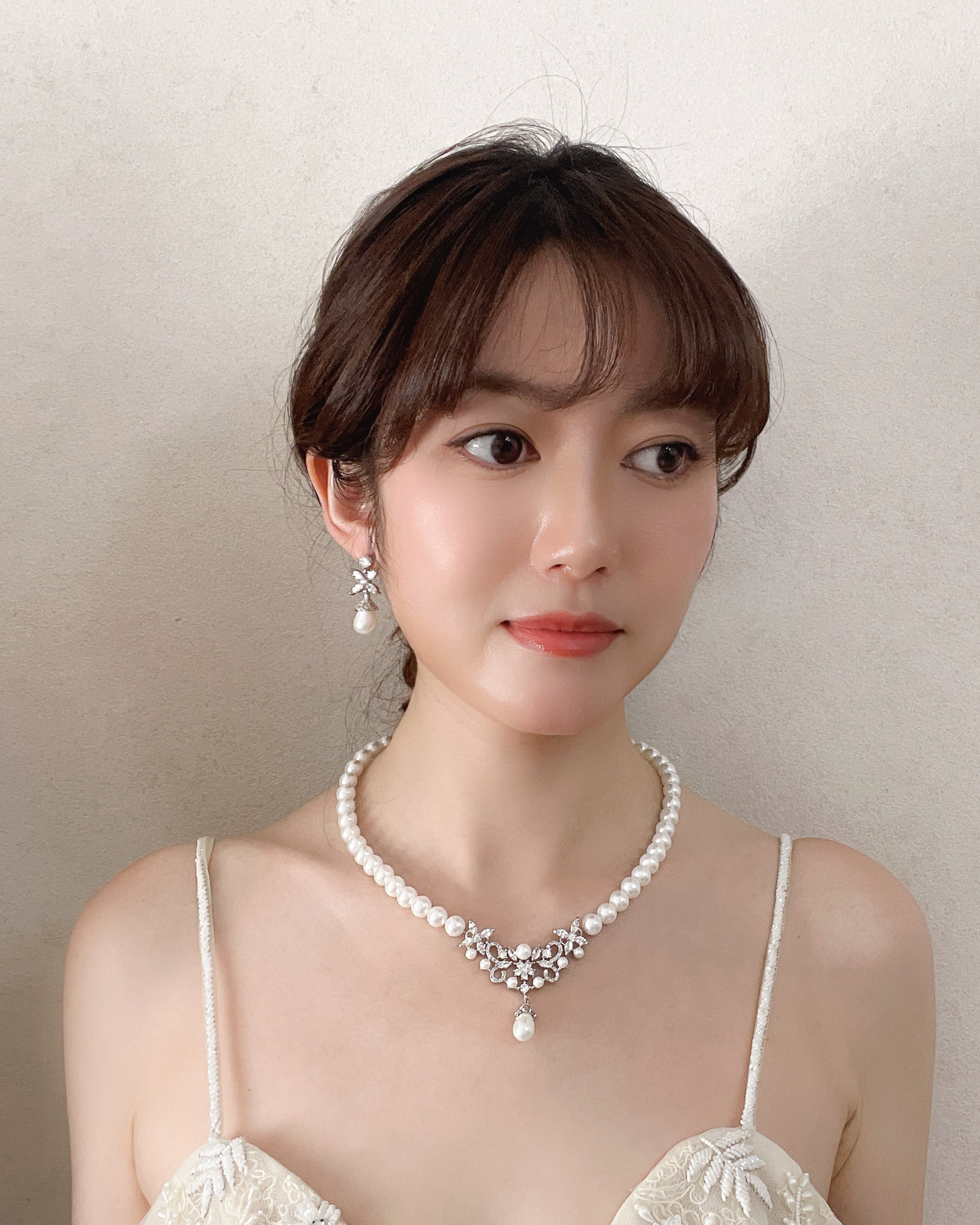 柔らかな光沢を放つラウンドパールと、繊細にカットされたジルコニアストーンを組み合わせた、クラシカルな輝きが印象的なネックレスピアスセット。