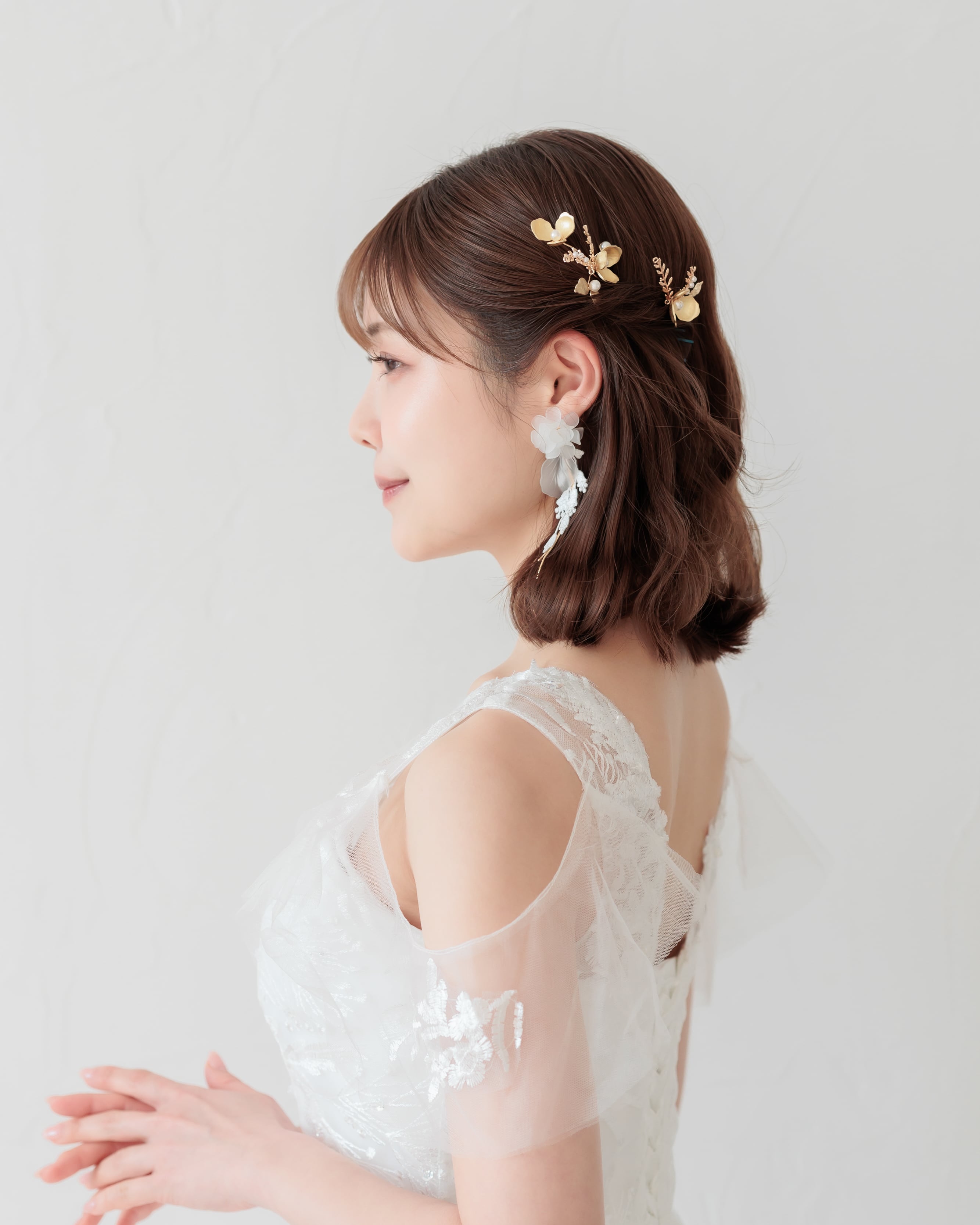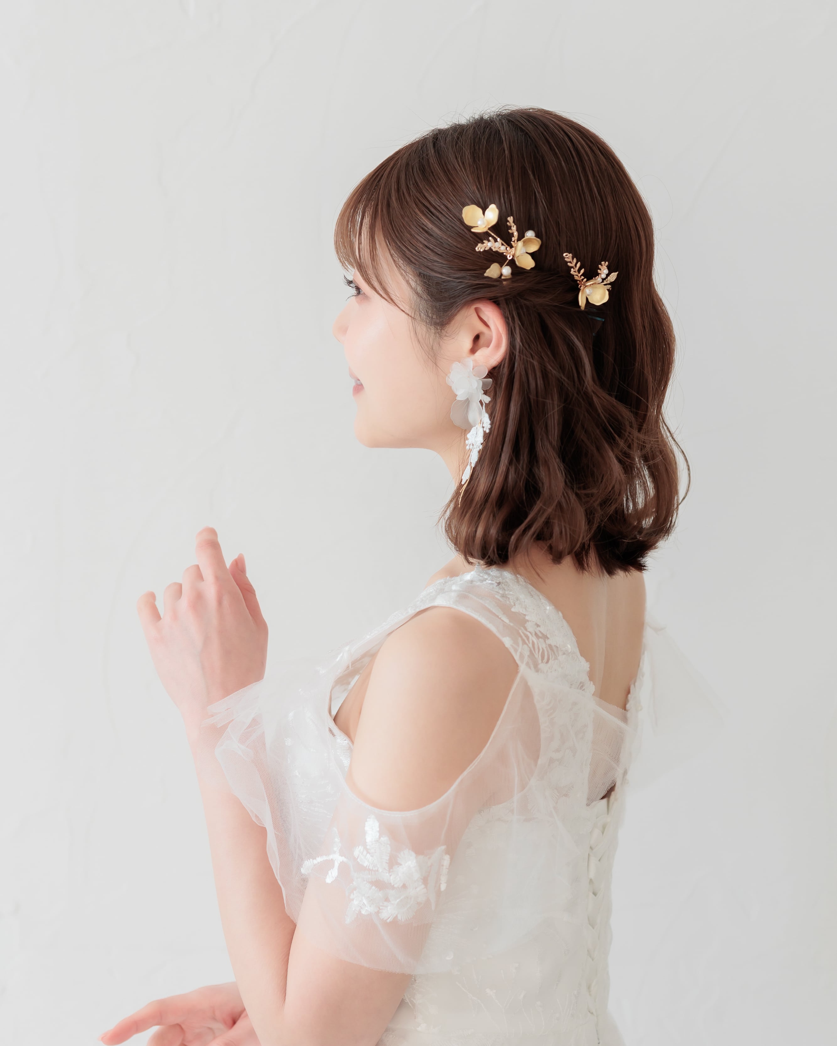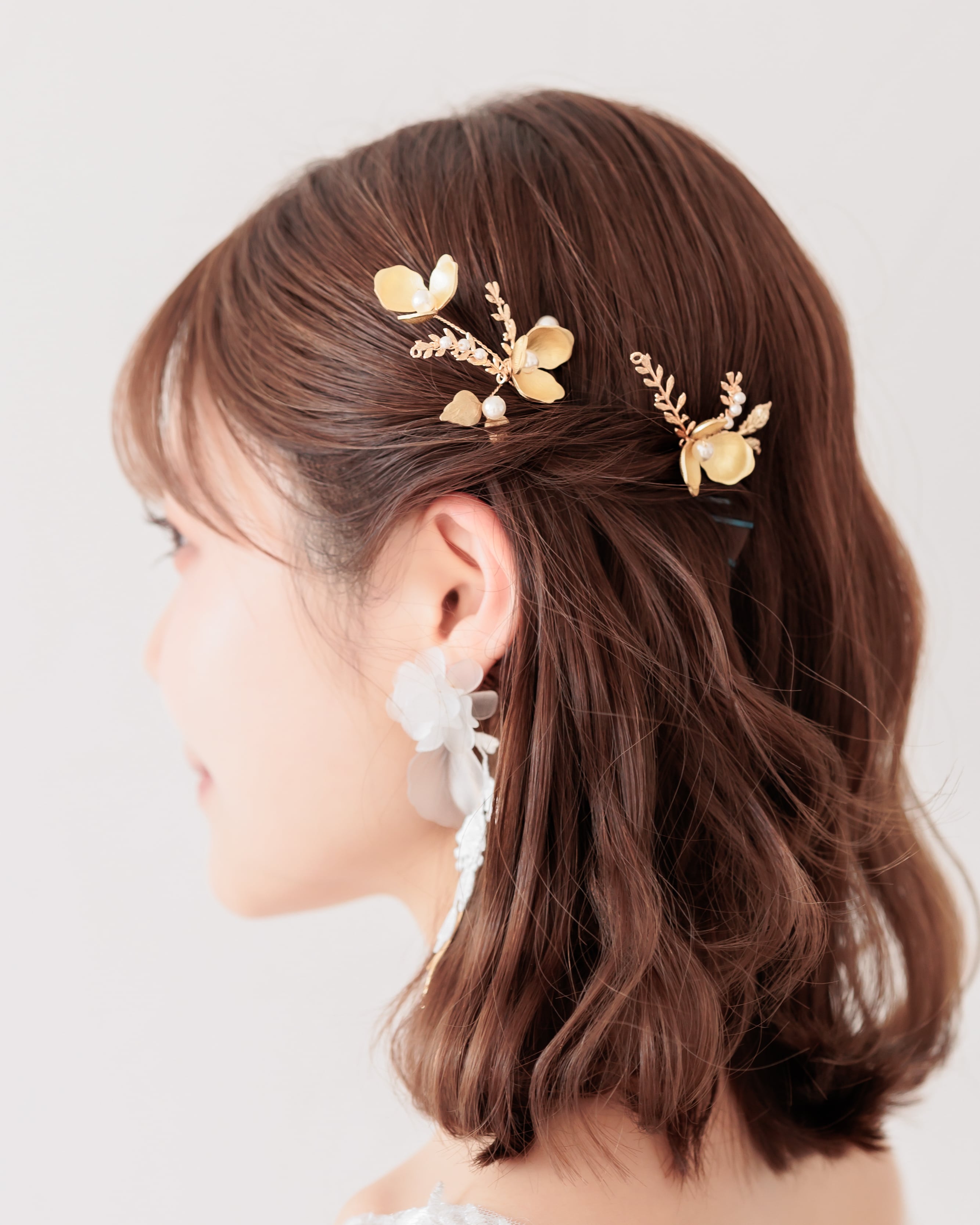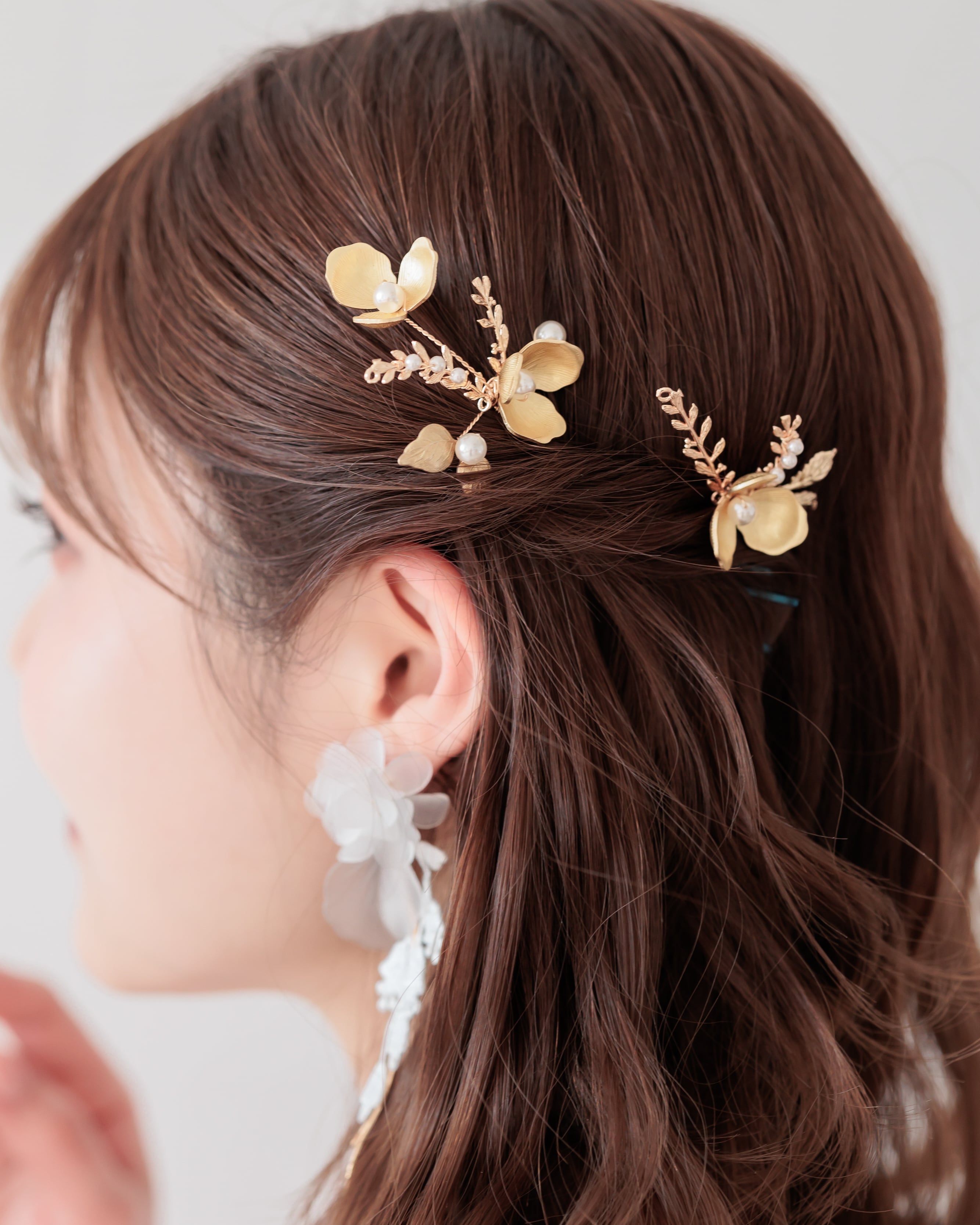 ゴールドのメタルフラワーが繊細な立体感を放ち、中心には艶やかなパールをあしらいました。葉や小枝の装飾には細やかな彫刻が施され、光を受けるたびに柔らかな輝きを添えます。