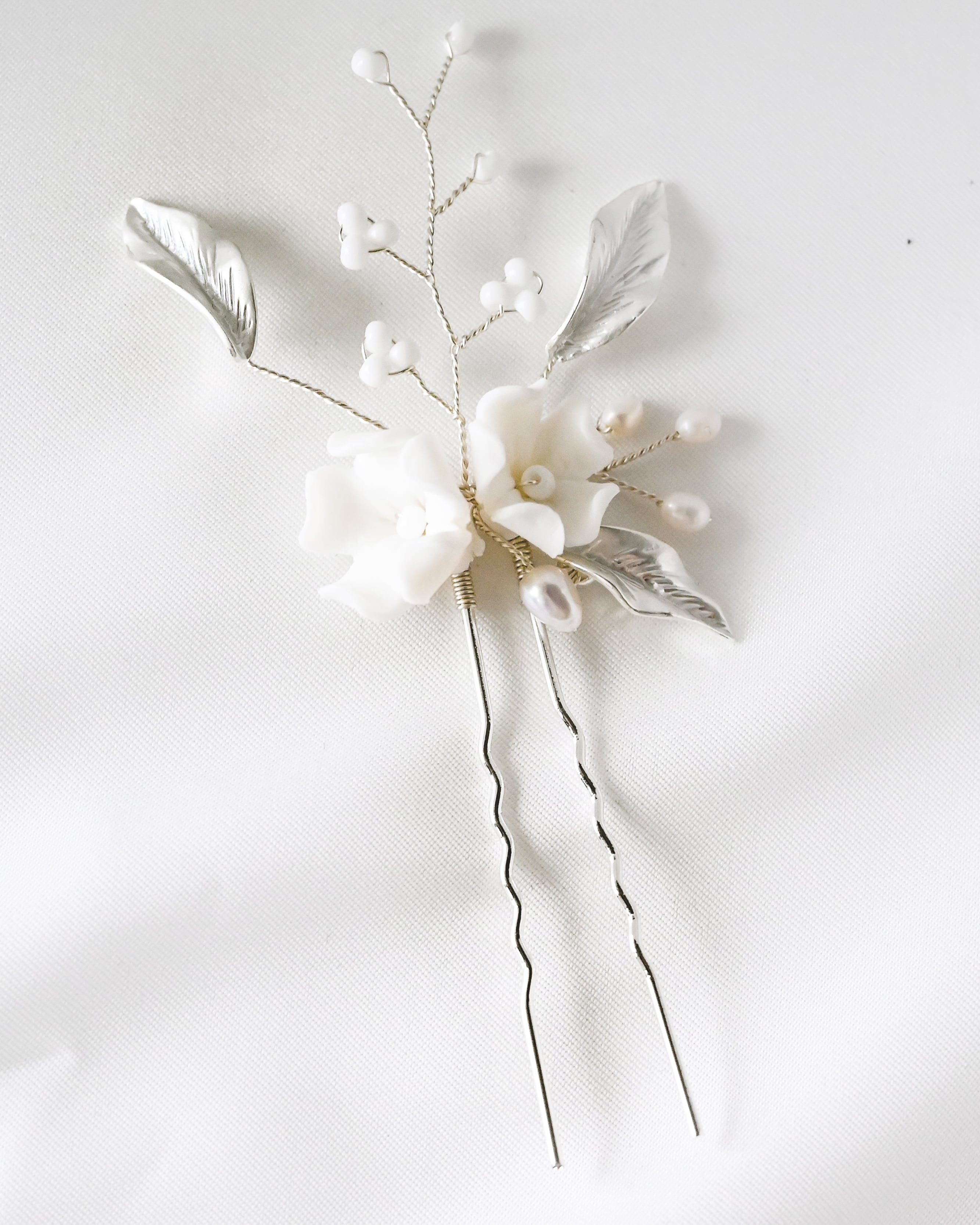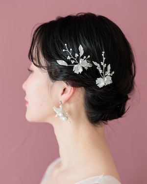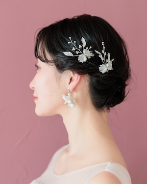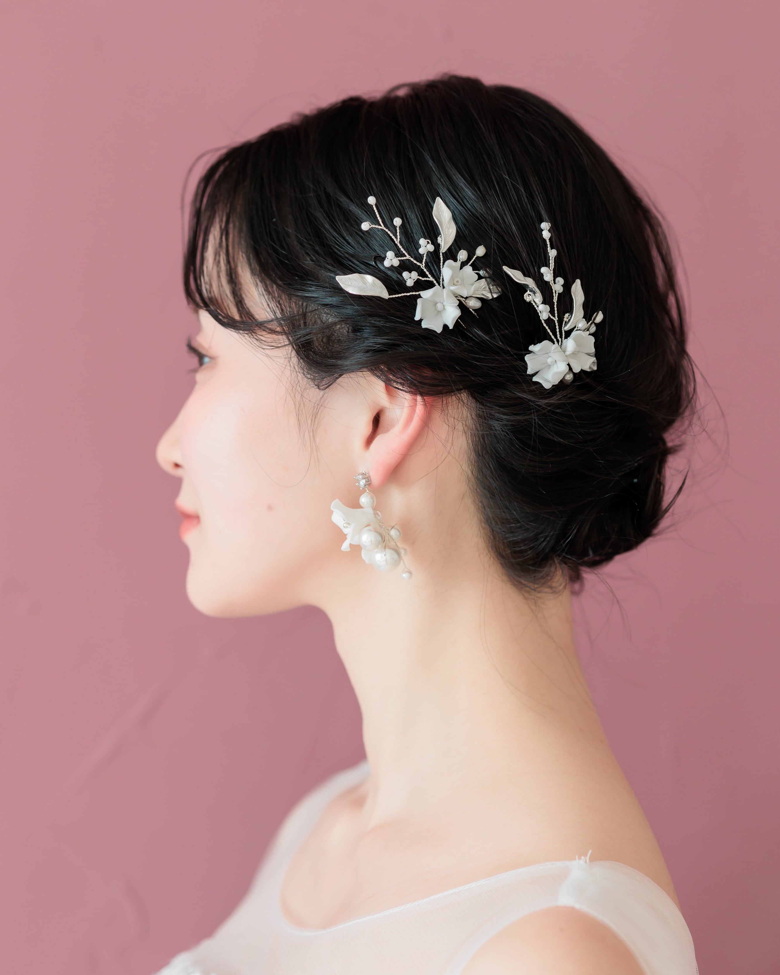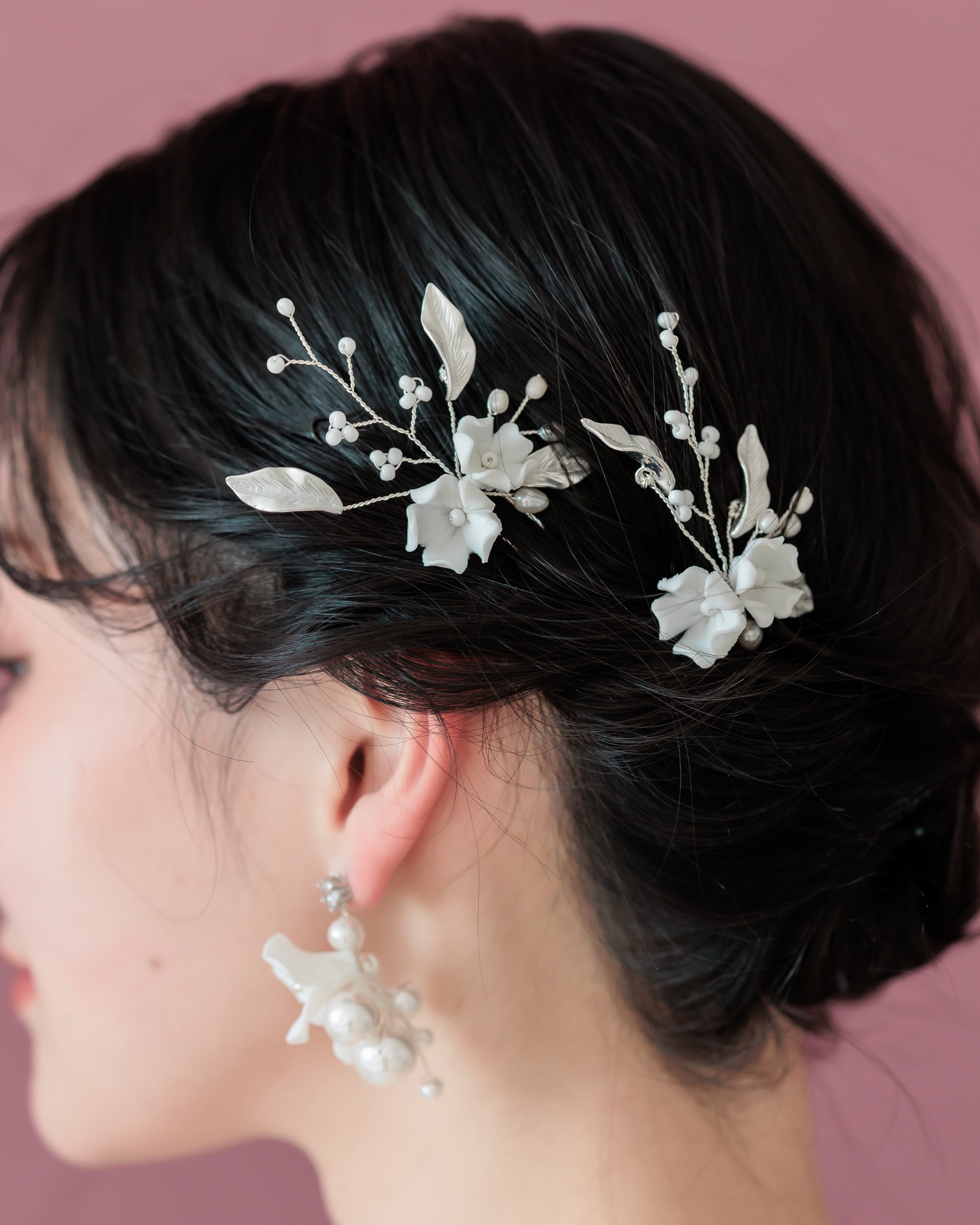マットな質感のセラミックフラワーに、繊細なリーフモチーフと淡水パールを組み合わせた上品なヘアピン2点セット。