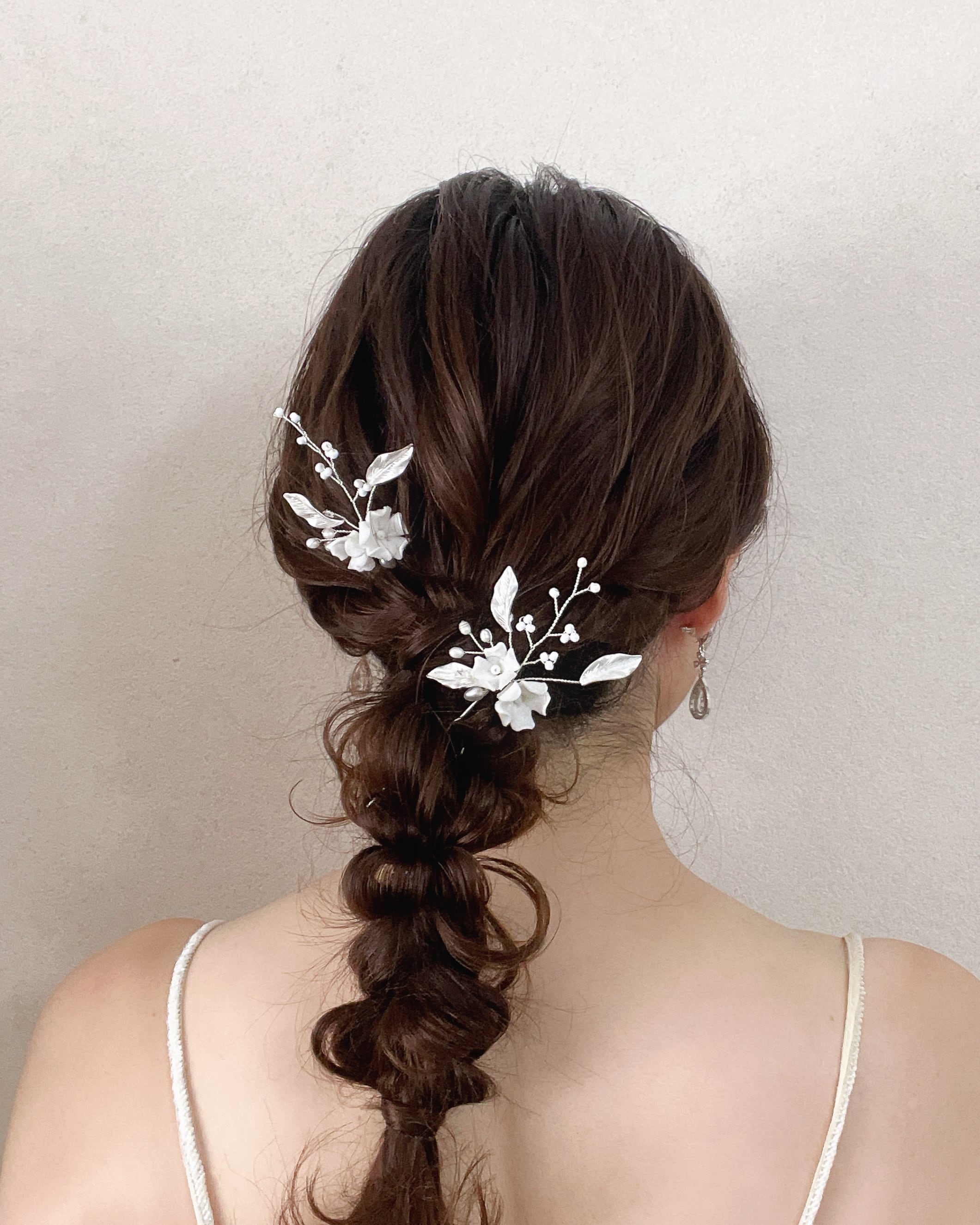 どちらも他のヘアアクセサリーと組み合わせやすく、ブライダルや前撮り、二次会など幅広いシーンで活躍します。